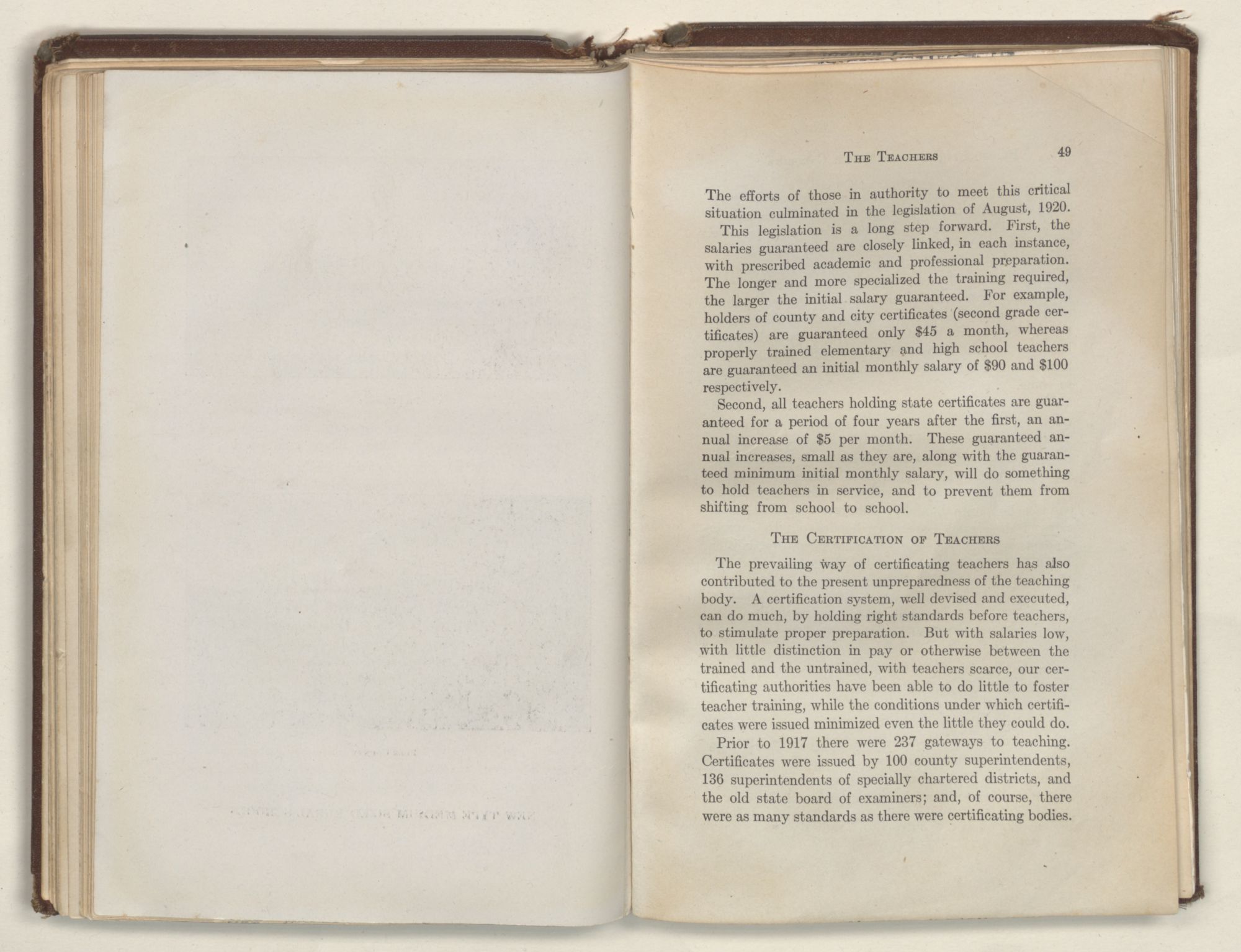 The general assembly of 1919 and the special session of 1920, as stated before, materially increased the pay of teachers, and the new certification system guarantees the higher salaries to the teachers who are best prepared. These higher salaries and the new certification scheme will hearten the well trained teachers now in service, but the salaries offered are not yet sufficient to induce the ill prepared to get the additional training required for high grade certificates, or to induce sufficiently large numbers of young people to qualify themselves in the future. It is still the unprepared who are really favored.
