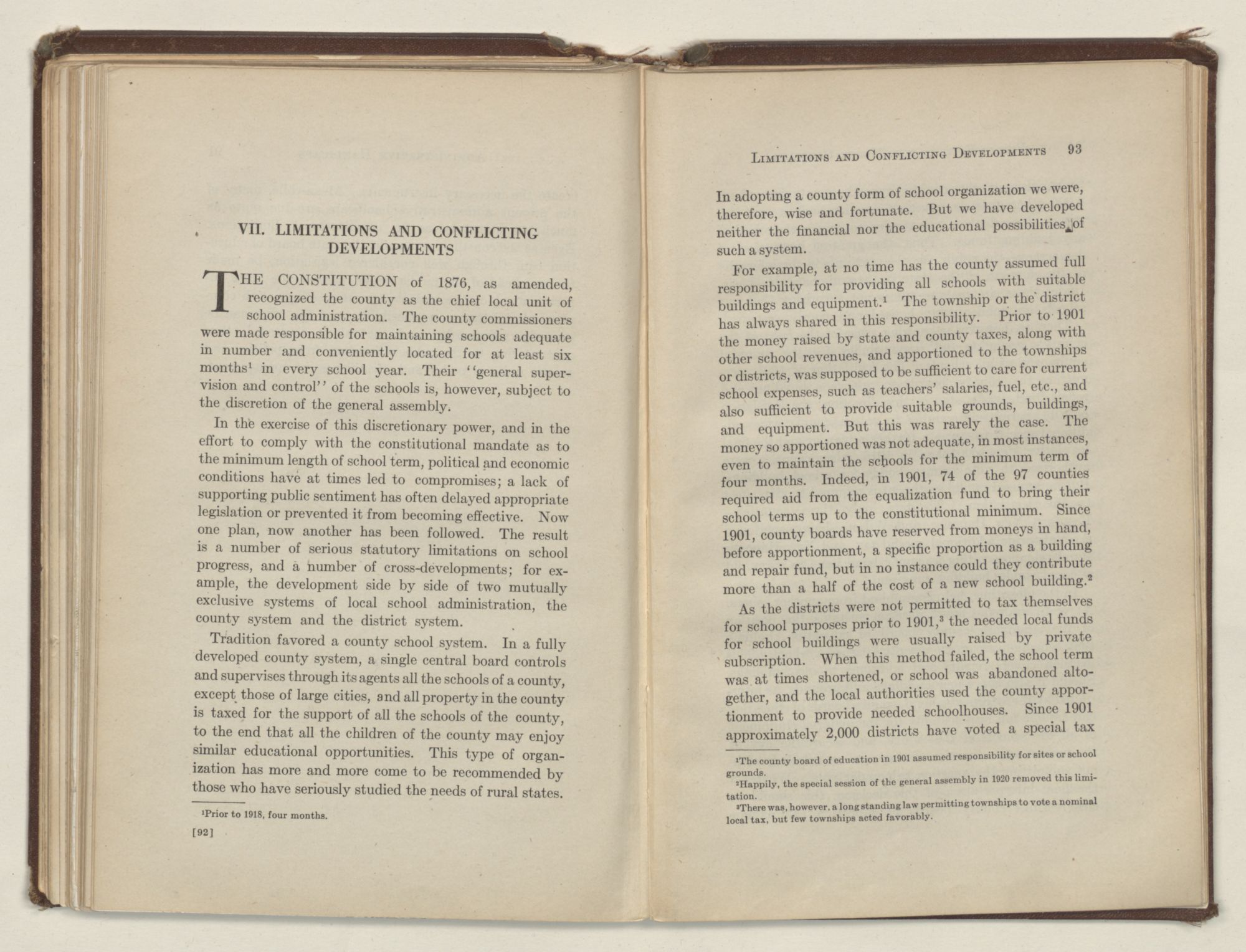 has this further end in view—the equalization of educational opportunities. All children, irrespective of whether they live in Ashe or in New Hanover are now guaranteed at least a six months’ school. The state can not, however, stop here. In the past, we have condoned intolerable differences in the length of school terms. The cities provided eight or nine months’ schooling, some counties seven or eight months’, and other counties only four months’; in short, a child's educational opportunities varied according as he chanced to live in one place or another. These same intolerable differences will continue, unless the state attempts to equalize opportunities beyond six months, for some counties will provide eight or nine months, and others will be content with six. A part of the old equalization fund was for a time used to lengthen the school term beyond the constitutional minimum of four months, and there is no reason why a part of the state public school fund might not now be similarly employed, provided it were sufficiently increased. It would probably be impracticable to attempt at one stroke actually to equalize the length of school term, but a beginning should be made. The limit of equalization might well be fixed for the present at six and a half months, later raised to seven, and so on until all the children of the state enjoy a standard school year of eight or nine months. Such action would serve the best interests of both present and future generations, and would at the same time mean the gradual elimination of special tax districts, the stumbling block to a county-wide special school tax and to the development of efficient county school systems.