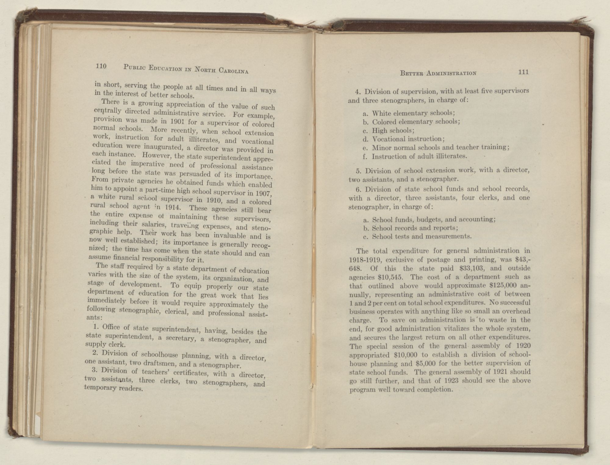 There is a growing appreciation of the value of such centrally directed administrative service. For example, provision was made in 1901 for a supervisor of colored normal schools. More recently, when school extension work, instruction for adult illiterates, and vocational education were inaugurated, a director was provided in each instance. However, the state superintendent appreciated the imperative need of professional assistance long before the state was persuaded of its importance. From private agencies he obtained funds which enabled him to appoint a part-time high school supervisor in 1907, a white rural school supervisor in 1910, and a colored rural school agent in 1914. These agencies still bear the entire expense of maintaining these supervisors, including their salaries, traveling expenses, and stenographic help. Their work has been invaluable and is now well established; its importance is generally recognized; the time has come when the state should and can assume financial responsibility for it.