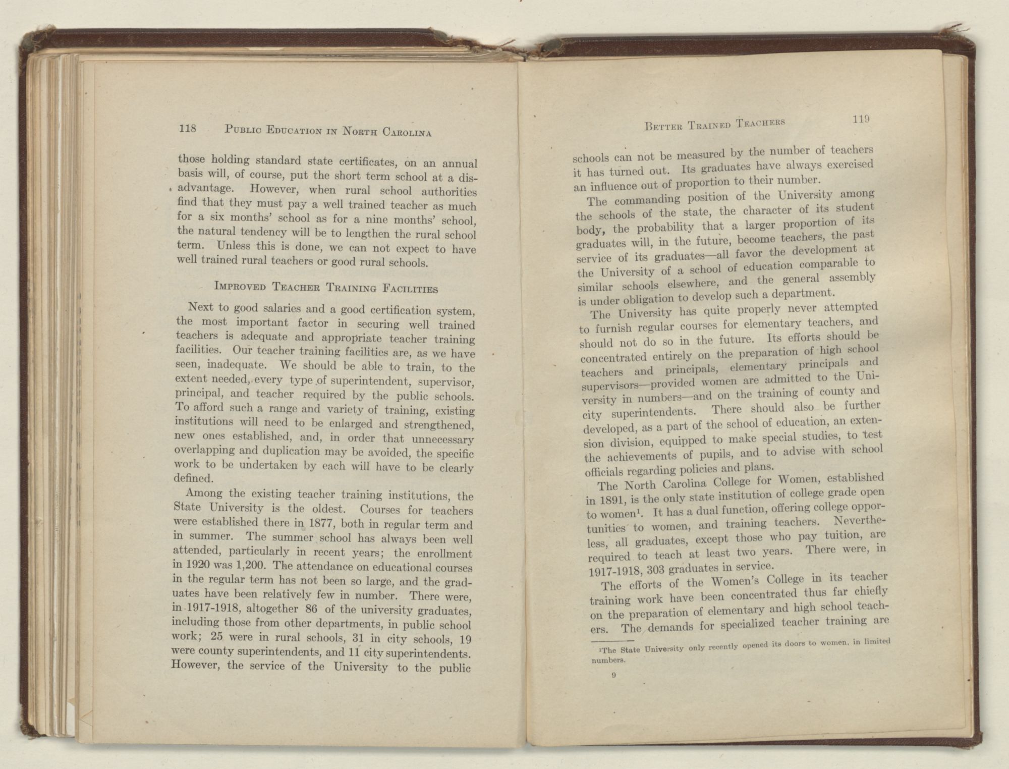 The North Carolina College for Women, established in 1891, is the only state institution of college grade open to women1. It has a dual function, offering college opportunities to women, and training teachers. Nevertheless, all graduates, except those who pay tuition, are required to teach at least two years. There were, in 1917-1918, 303 graduates in service.