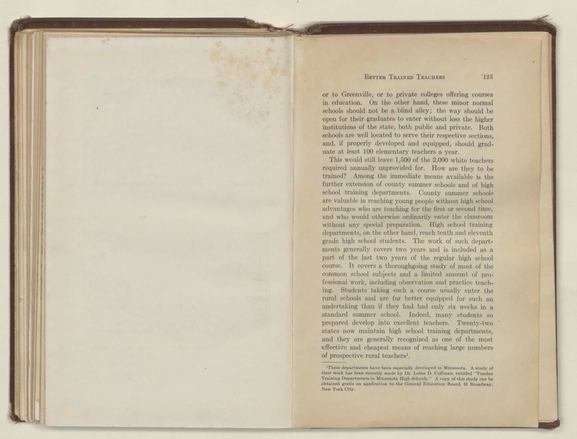 This would still leave 1,500 of the 2,000 white teachers required annually unprovided for. How are they to be trained? Among the immediate means available is the further extension of county summer schools and of high school training departments. County summer schools are valuable in reaching young people without high school advantages who are teaching for the first or second time, and who would otherwise ordinarily enter the classroom without any special preparation. High school training departments, on the other hand, reach tenth and eleventh grade high school students. The work of such departments generally covers two years and is included as a part of the last two years of the regular high school course. It covers a thoroughgoing study of most of the common school subjects and a limited amount of professional work, including observation and practice teaching. Students taking such a course usually enter the rural schools and are far better equipped for such an undertaking than if they had had only six weeks in a standard summer school. Indeed, many students so prepared develop into excellent teachers. Twenty-two states now maintain high school training departments, and they are generally recognized as one of the most effective and cheapest means of reaching large numbers of prospective rural teachers1.