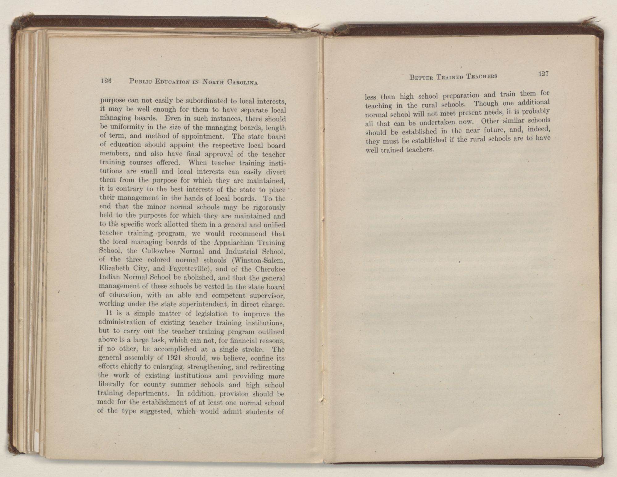 purpose can not easily be subordinated to local interests, it may be well enough for them to have separate local managing boards. Even in such instances, there should be uniformity in the size of the managing boards, length of term, and method of appointment. The state board of education should appoint the respective local board members, and also have final approval of the teacher training courses offered. When teacher training institutions are small and local interests can easily divert them from the purpose for which they are maintained, it is contrary to the best interests of the state to place their management in the hands of local boards. To the end that the minor normal schools may be rigorously held to the purposes for which they are maintained and to the specific work allotted them in a general and unified teacher training program, we would recommend that the local managing boards of the Appalacbian Training School, the Cullowhee Normal and Industrial School, of the three colored normal schools (Winston-Salem, Elizabeth City, and Fayetteville), and of the Cherokee Indian Normal School be abolished, and that the general management of these schools be vested in the state board of education, with an able and competent supervisor, working under the state superintendent, in direct charge.