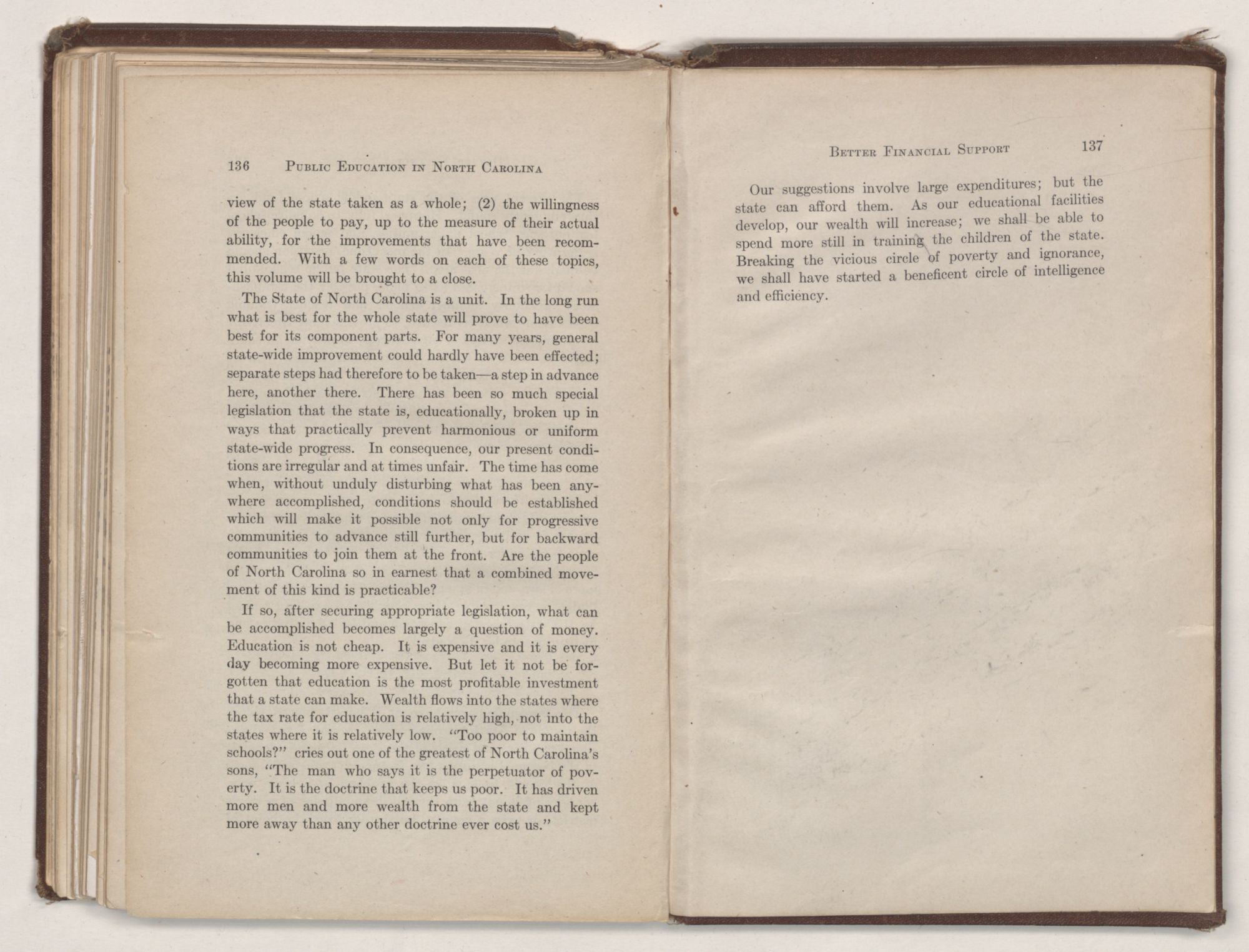 If so, after securing appropriate legislation, what can be accomplished becomes largely a question of money. Education is not cheap. It is expensive and it is every day becoming more expensive. But let it not be forgotten that education is the most profitable investment that a state can make. Wealth flows into the states where the tax rate for education is relatively high, not into the states where it is relatively low. “Too poor to maintain schools?” cries out one of the greatest of North Carolina's sons, “The man who says it is the perpetuator of poverty. It is the doctrine that keeps us poor. It has driven more men and more wealth from the state and kept more away than any other doctrine ever cost us.”