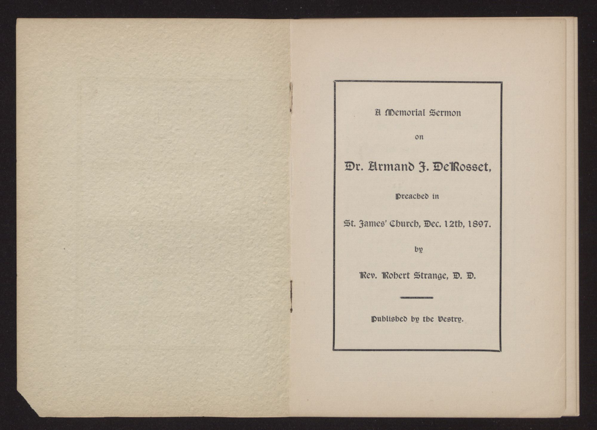 A Memorial Sermon on Dr. Armand J. DeRosset, Preached in St. James’ Church, Dec. 12th, 1897.by Rev. Robert Strange, D. D.Published by the Vestry.