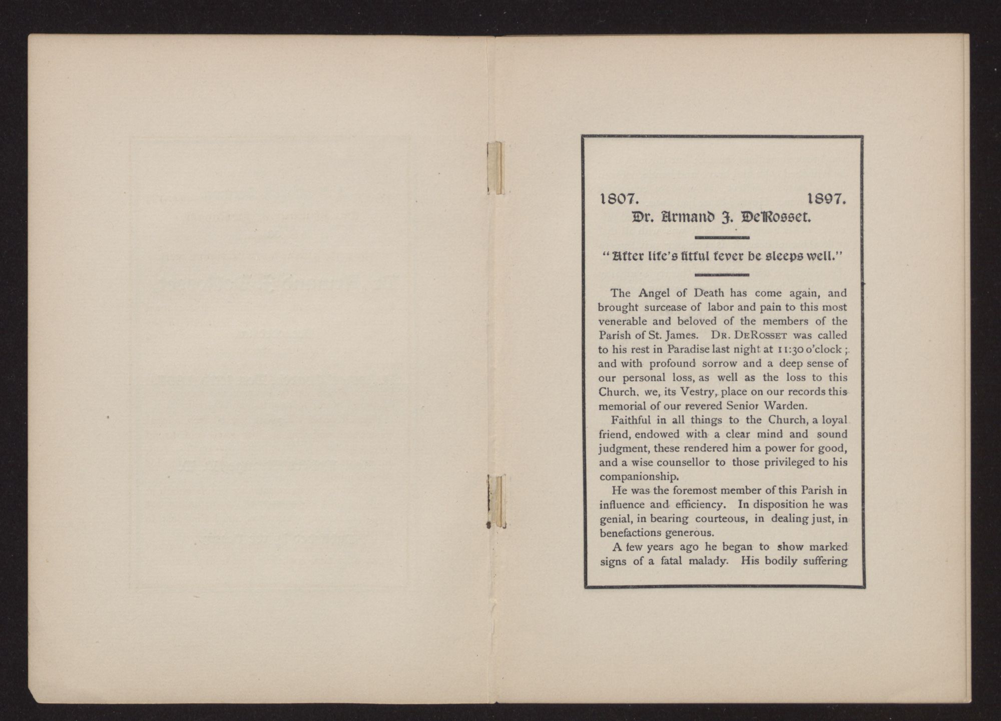 “After life's fitful fever be sleeps well.”The Angel of Death has come again, and brought surcease of labor and pain to this most venerable and beloved of the members of the Parish of St. James. DR. DEROSSET was called to his rest in Paradise last night at 11:30 o'clock; and with profound sorrow and a deep sense of our personal loss, as well as the loss to this Church, we, its Vestry, place on our records this memorial of our revered Senior Warden.