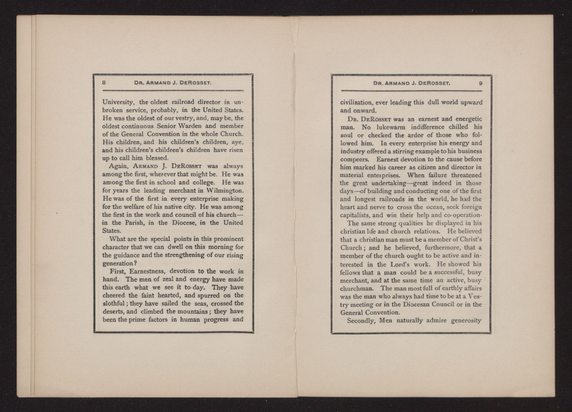 Again, ARMAND J. DEROSSET was always among the first, wherever that might be. He was among the first in school and college. He was for years the leading merchant in Wilmington. He was of the first in every enterprise making for the welfare of his native city. He was among the first in the work and council of his church—in the Parish, in the Diocese, in the United States.