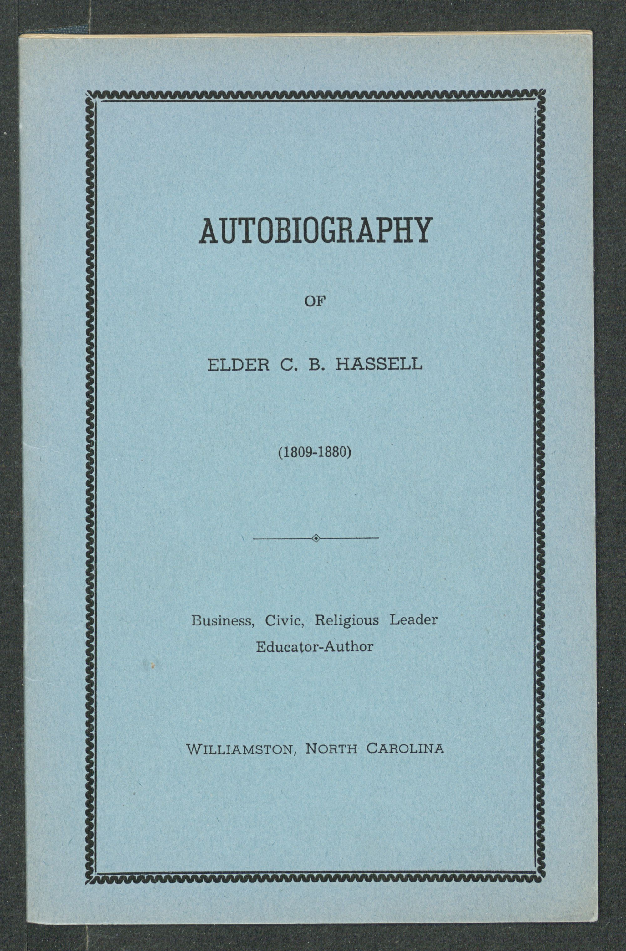 AUTOBIOGRAPHY OF ELDER C. B. HASSELL (1809-1880)Business, Civic, Religious Leader Educator-AuthorWILLIAMSTON, NORTH CAROLINA