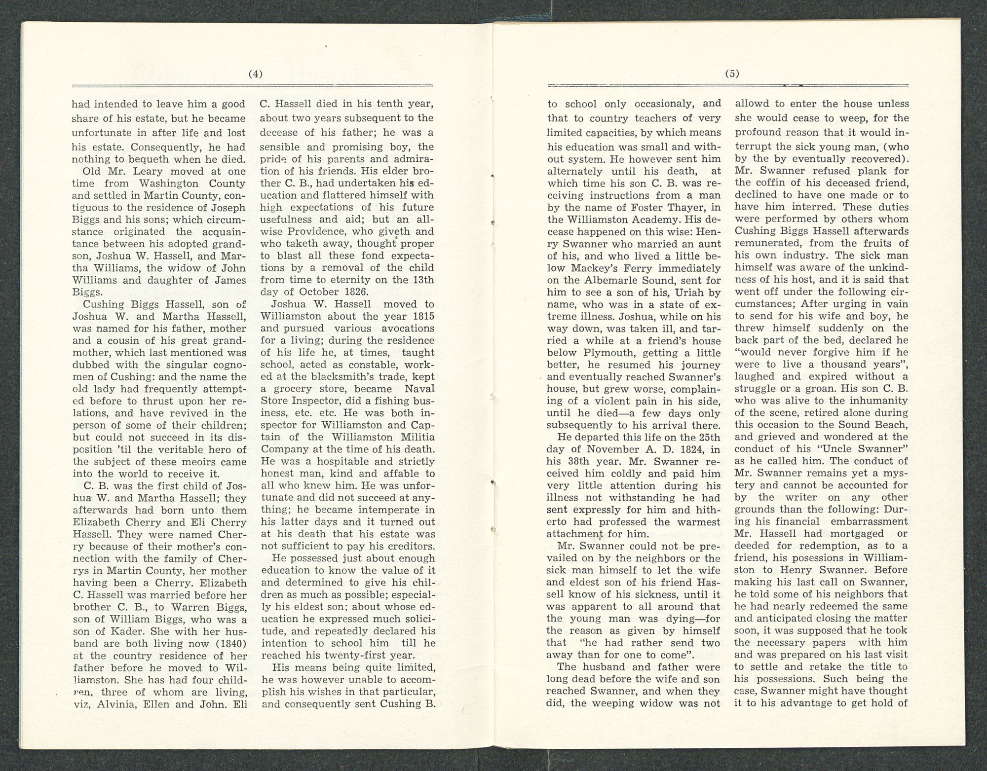 Old Mr. Leary moved at one time from Washington County and settled in Martin County, contiguous to the residence of Joseph Biggs and his sons; which circumstance originated the acquaintance between his adopted grandson, Joshua W. Hassell, and Martha Williams, the widow of John Williams and daughter of James Biggs.