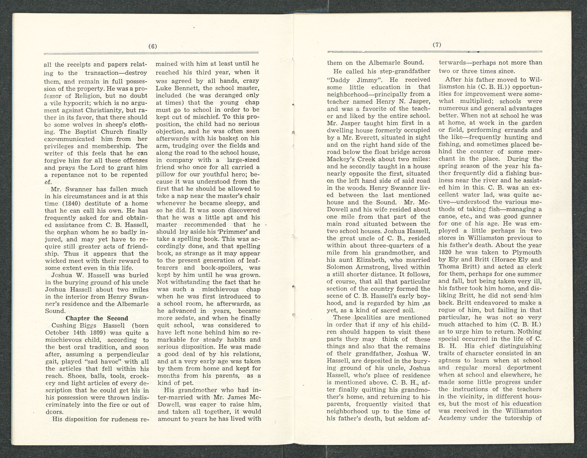 He called his step-grandfather “Daddy Jimmy”. He received some little education in that neighborhood—principally from a teacher named Henry N. Jasper, and was a favorite of the teacher and liked by the entire school. Mr. Jasper taught him first in a dwelling house formerly occupied by a Mr. Everett, situated in sight and on the right hand side of the road below the float bridge across Mackey's Creek about two miles: and he secondly taught in a house nearly opposite the first, situated on the left hand side of said road in the woods. Henry Swanner lived between the last mentioned house and the Sound. Mr. McDowell and his wife resided about one mile from that part of the main road situated between the two school houses. Joshua Hassell, the great uncle of C. B., resided within about three-quarters of a mile from his grandmother, and his aunt Elizabeth, who married Solomon Armstrong, lived within a still shorter distance. It follows, of course, that all that particular section of the country formed the scene of C. B. Hassell's early boyhood, and is regarded by him ,as yet, as a kind of sacred soil.