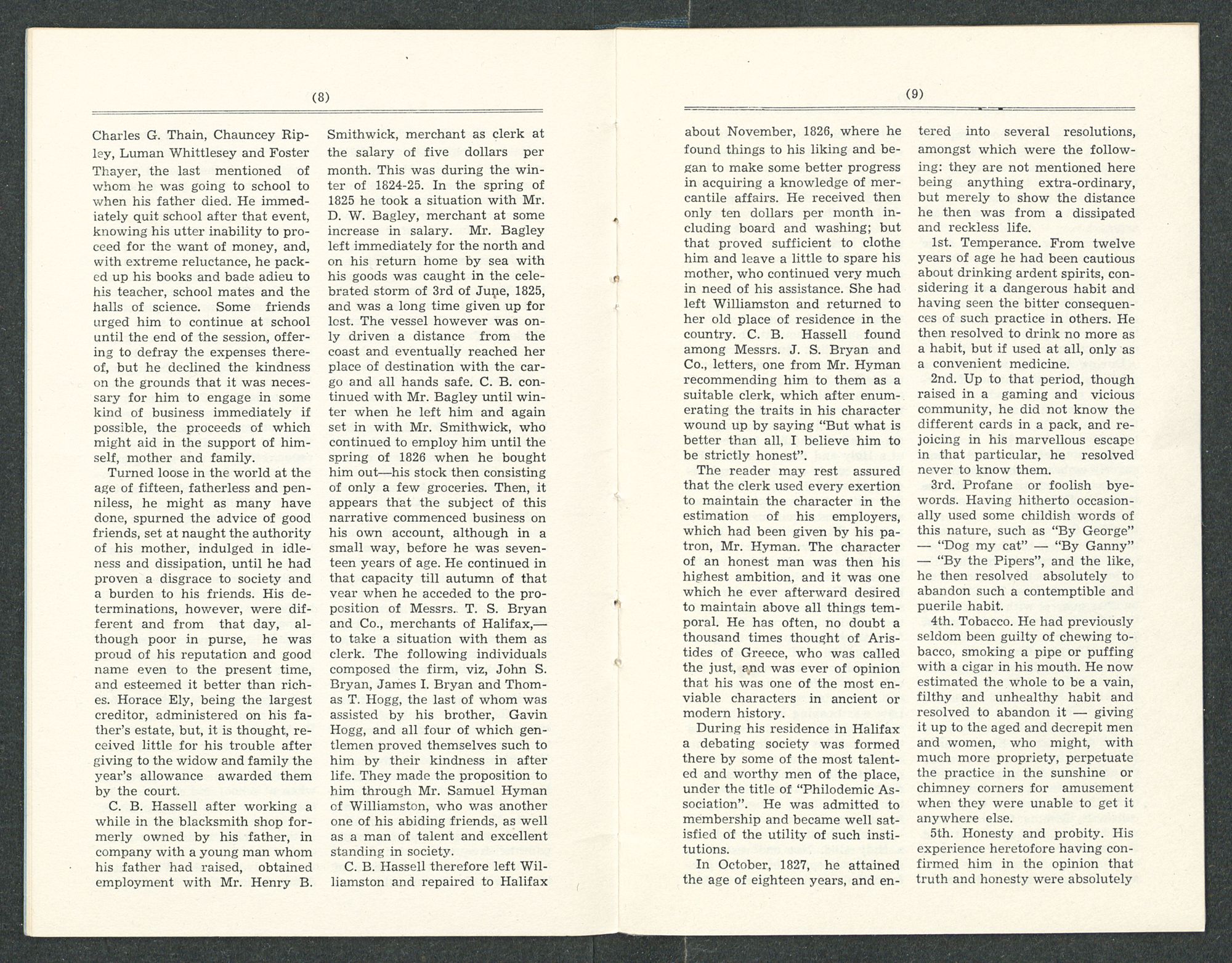 Charles G. Thain, Chauncey Ripley, Luman Whittlesey and Foster Thayer, the last mentioned of whom he was going to school to when his father died. He immediately quit school after that event, knowing his utter inability to proceed for the want of money, and, with extreme reluctance, he packed up his books and bade adieu to his teacher, school mates and the halls of science. Some friends urged him to continue at school until the end of the session, offering to defray the expenses thereof, but he declined the kindness on the grounds that it was necessary for him to engage in some kind of business immediately if possible, the proceeds of which might aid in the support of himself, mother and family.