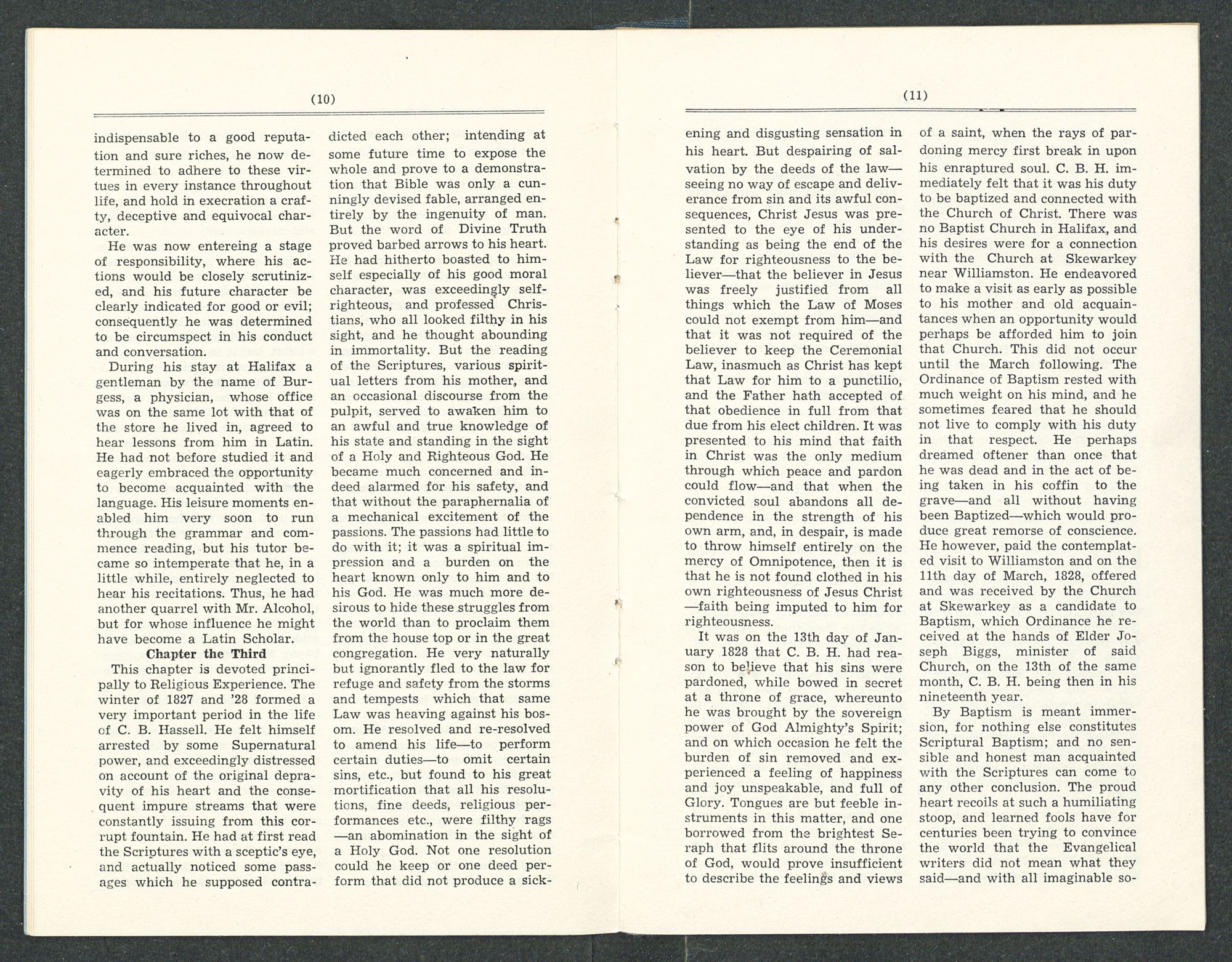 Chapter the ThirdThis chapter is devoted principally to Religious Experience. The winter of 1827 and ’28 formed a very important period in the life of C. B. Hassell. He felt himself arrested by some Supernatural power, and exceedingly distressed on account of the original depravity of his heart and the consequent impure streams that were constantly issuing from this corrupt fountain. He had at first read the Scriptures with a sceptic's eye, and actually noticed some passages which he supposed contradicted each other; intending at some future time to expose the whole and prove to a demonstration that Bible was only a cunningly devised fable, arranged entirely by the ingenuity of man. But the word of Divine Truth proved barbed arrows to his heart. He had hitherto boasted to himself especially of his good moral character, was exceedingly self-righteous, and professed Christians, who all looked filthy in his sight, and he thought abounding in immortality. But the reading of the Scriptures, various spiritual letters from his mother, and an occasional discourse from the pulpit, served to awaken him to an awful and true knowledge of his state and standing in the sight of a Holy and Righteous God. He became much concerned and indeed alarmed for his safety, and that without the paraphernalia of a mechanical excitement of the passions. The passions had little to do with it; it was a spiritual impression and a burden on the heart known only to him and to his God. He was much more desirous to hide these struggles from the world than to proclaim them from the house top or in the great congregation. He very naturally but ignorantly fled to the law for refuge and safety from the storms and tempests which that same Law was heaving against his bosom. He resolved and re-resolved to amend his life—to perform certain duties—to omit certain sins, etc., but found to his great mortification that all his resolutions, fine deeds, religious performances etc., were filthy rags—an abomination in the sight of a Holy God. Not one resolution could he keep or one deed perform that did not produce a sickening