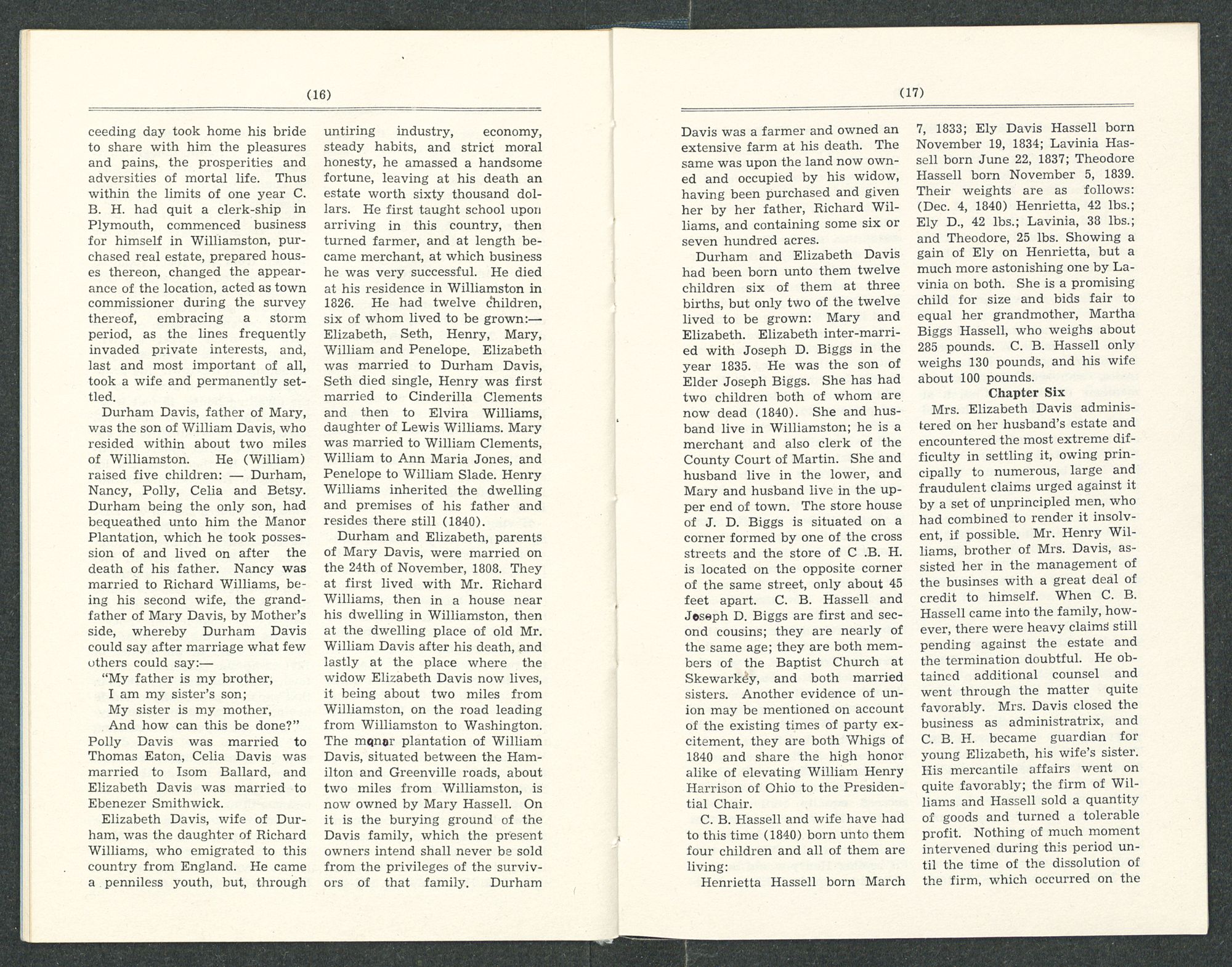 Durham and Elizabeth Davis had been born unto them twelve children six of them at three births, but only two of the twelve lived to be grown: Mary and Elizabeth. Elizabeth inter-married with Joseph D. Biggs in the year 1835. He was the son of Elder Joseph Biggs. She has had two children both of whom are now dead (1840). She and husband live in Williamston; he is a merchant and also clerk of the County Court of Martin. She and husband live in the lower, and Mary and husband live in the upper end of town. The store house of J. D. Biggs is situated on a corner formed by one of the cross streets and the store of C .B. H. is located on the opposite corner of the same street, only about 45 feet apart. C. B. Hassell and Joseph D. Biggs are first and second cousins; they are nearly of the same age; they are both members of the Baptist Church at Skewarkey, and both married sisters. Another evidence of union may be mentioned on account of the existing times of party excitement, they are both Whigs of 1840 and share the high honor alike of elevating William Henry Harrison of Ohio to the Presidential Chair.