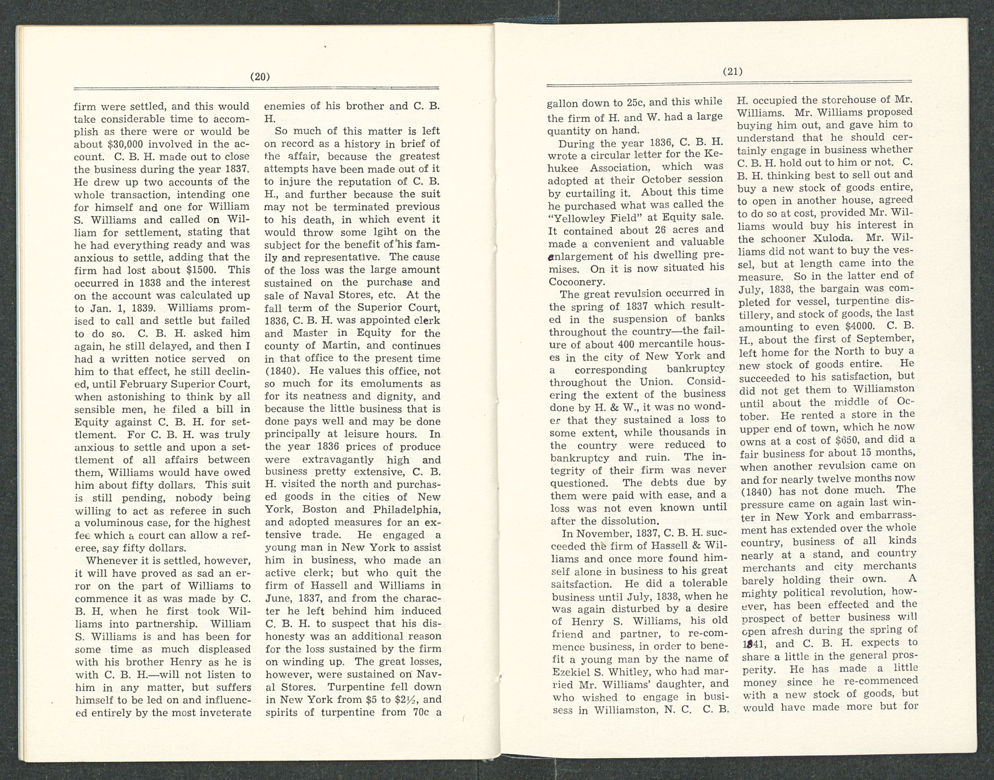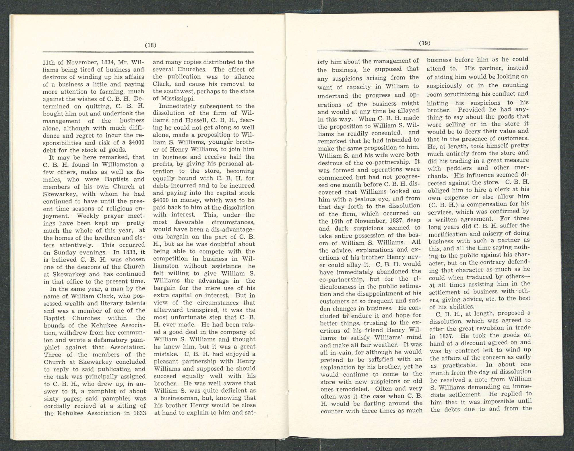 him about the management of the business, he supposed that any suspicions arising from the want of capacity in William to undertand the progress and operations of the business might and would at any time be allayed in this way. When C. B. H. made the proposition to William S. Williams he readily consented, and remarked that he had intended to make the same proposition to him. William S. and his wife were both desirous of the co-partnership. It was formed and operations were commenced but had not progressed one month before C. B. H. discovered that Williams looked on him with a jealous eye, and from that day forth to the dissolution of the firm, which occurred on the 16th of November, 1837, deep and dark suspicions seemed to take entire possession of the bosom of William S. Williams. All the advice, explanations and exertions of his brother Henry never could allay it. C. B. H. would have immediately abandoned the co-partnership, but for the ridiculousness in the public estimation and the disappointment of his customers at so frequent and sudden changes in business. He concluded to endure it and hope for better things, trusting to the exertions of his friend Henry Williams to satisfy Williams’ mind and make all fair weather. It was all in vain, for although he would pretend to be satisfied with an explanation by his brother, yet he would continue to come to the store with new suspicions or old ones remodeled. Often and very often was it the case when C. B. H. would be darting around the counter with three times as much business before him as he could attend to. His partner, instead of aiding him would be looking on suspiciously or in the counting room scrutinizing his conduct and hinting his suspicions to his brother. Provided he had anything to say about the goods that were selling or in the store it would be to decry their value and that in the presence of customers. He, at length, took himself pretty much entirely from the store and did his trading in a great measure with peddlers and other merchants. His influence seemed directed against the store. C. B. H. obliged him to hire a clerk at his own expense or else allow him (C. B. H.) a compensation for his services, which was confirmed by a written agreement. For three long years did C. B. H. suffer the mortification and misery of doing business with such a partner as this, and all the time saying nothing to the public against his character, but on the contrary defending that character as much as he could when traduced by others—at all times assisting him in the settlement of business with others, giving advice, etc. to the best of his abilities.