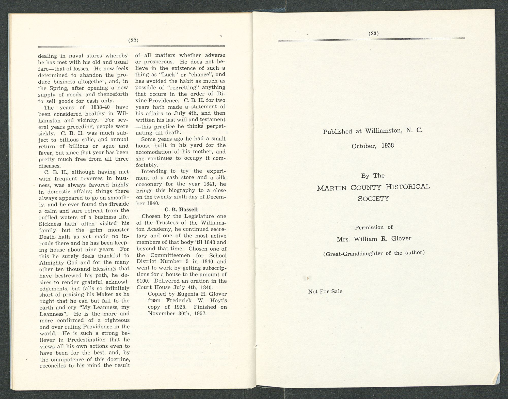 Copied by Eugenia H. Glover from Frederick W. Hoyt's copy of 1925. Finished on November 30th, 1957.