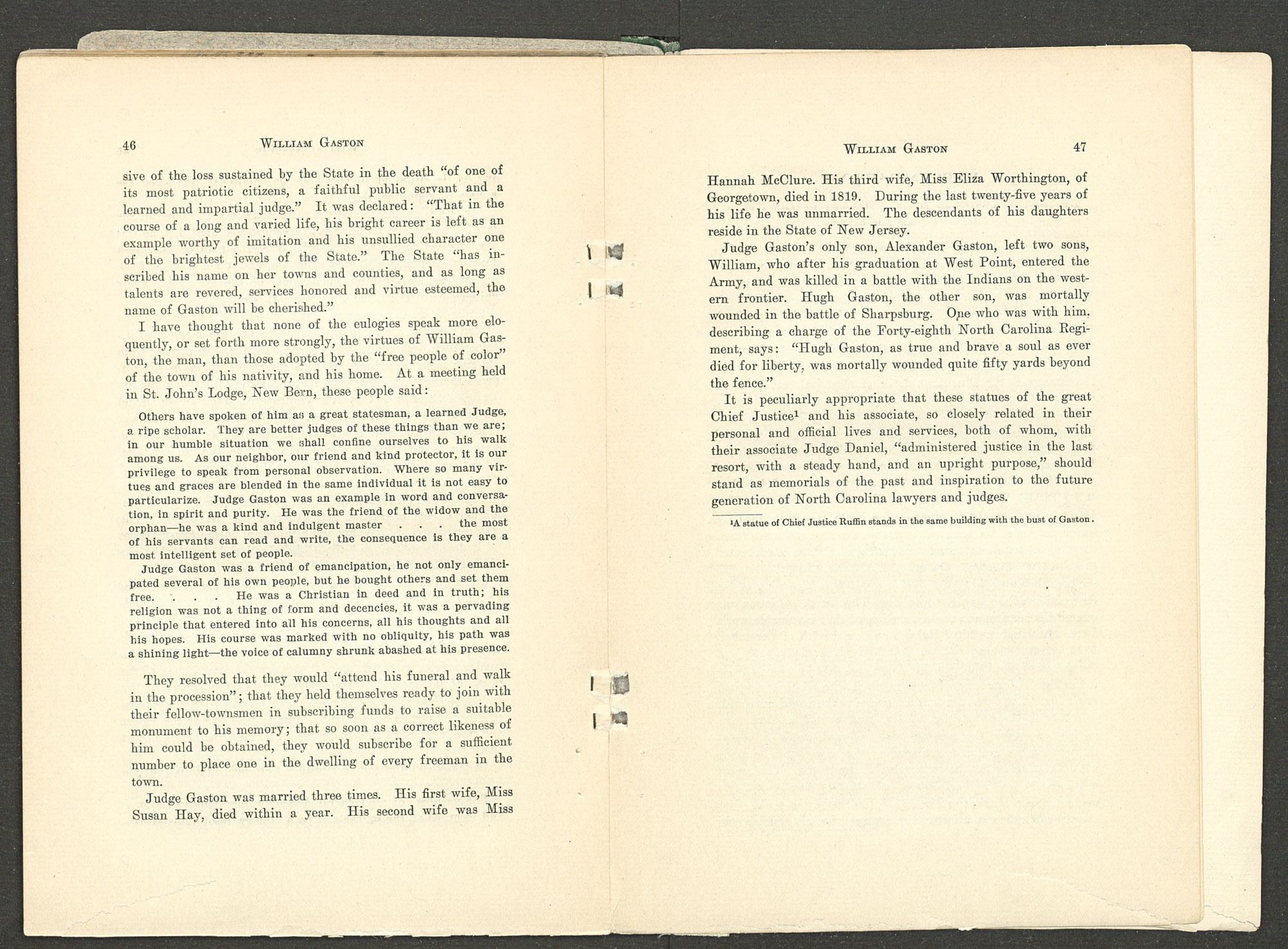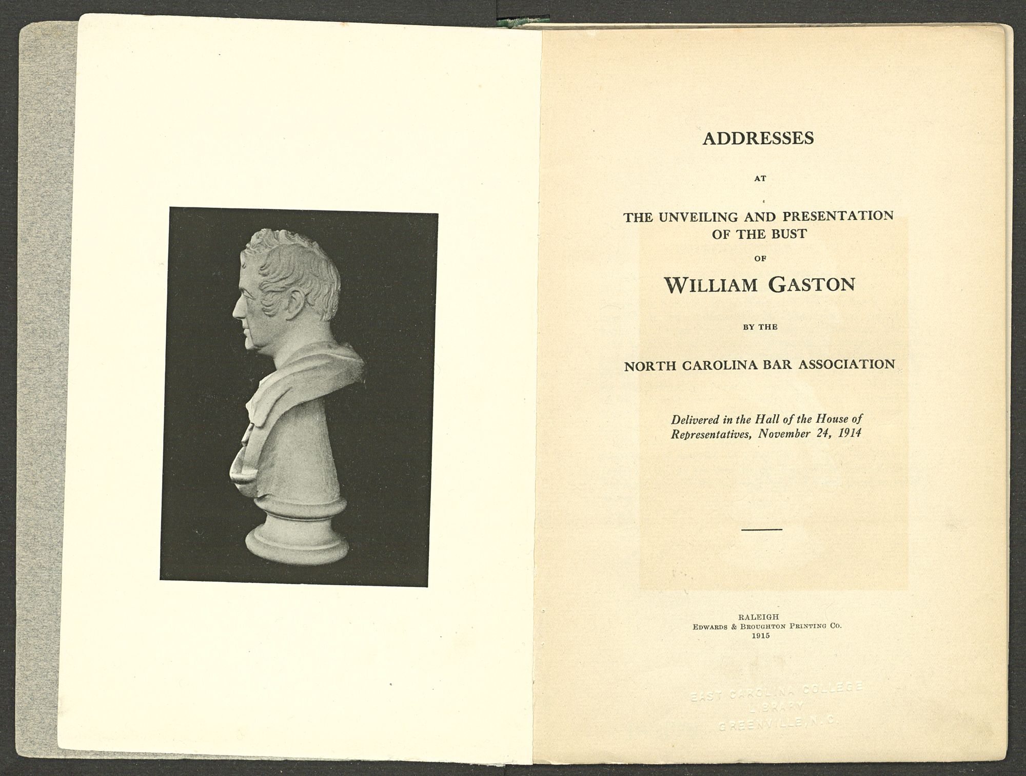 On behalf of the North Carolina Bar Association, it gives me great pleasure to present to the State of North Carolina this bust of Judge Gaston as a memorial of their regard and veneration for his services to his native State.