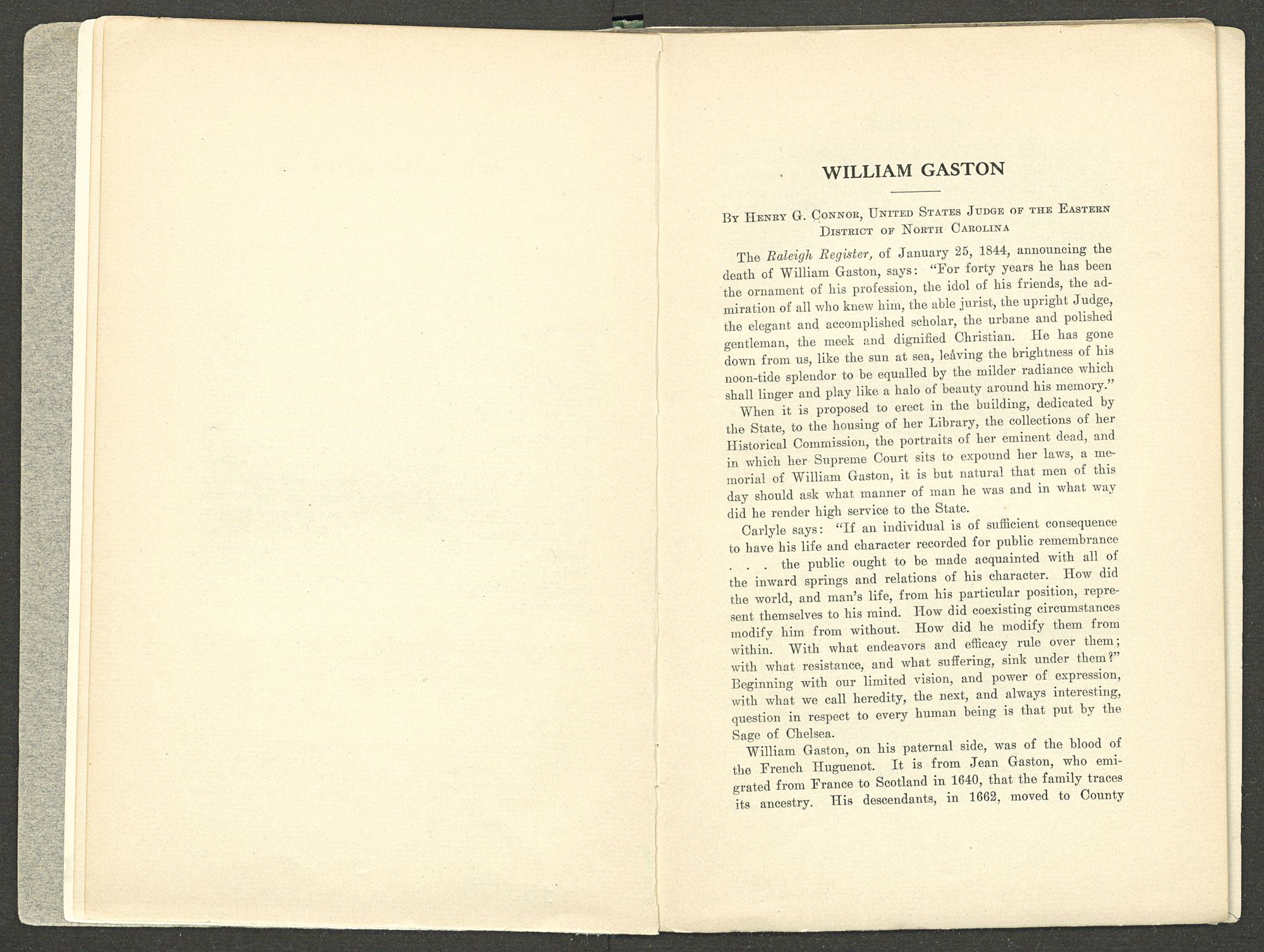 When it is proposed to erect in the building, dedicated by the State, to the housing of her Library, the collections of her Historical Commission, the portraits of her eminent dead, and in which her Supreme Court sits to expound her laws, a memorial of William Gaston, it is but natural that men of this day should ask what manner of man he was and in what way did he render high service to the State.