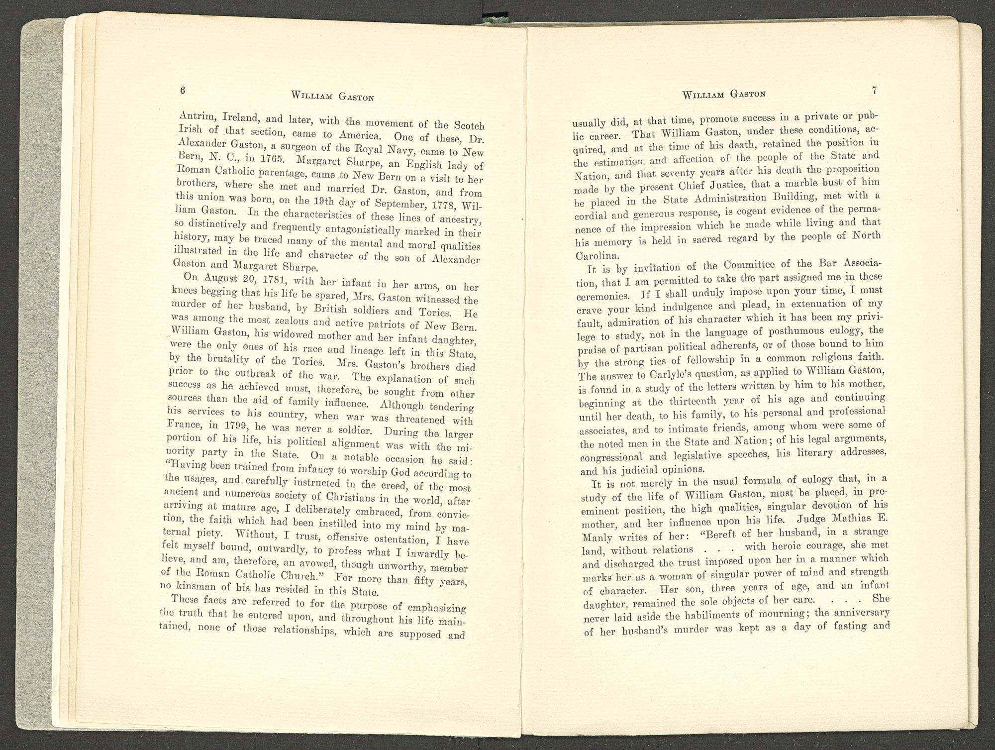On August 20, 1781, with her infant in her arms, on her knees begging that his life be spared, Mrs. Gaston witnessed the murder of her husband, by British soldiers and Tories. He was among the most zealous and active patriots of New Bern. William Gaston, his widowed mother and her infant daughter, were the only ones of his race and lineage left in this State, by the brutality of the Tories. Mrs. Gaston's brothers died prior to the outbreak of the war. The explanation of such success as he achieved must, therefore, be sought from other sources than the aid of family influence. Although tendering his services to his country, when war was threatened with France, in 1799, he was never a soldier. During the larger portion of his life, his political alignment was with the minority party in the State. On a notable occasion he said: “Having been trained from infancy to worship God according to the usages, and carefully instructed in the creed, of the most ancient and numerous society of Christians in the world, after arriving at mature age, I deliberately embraced, from conviction, the faith which had been instilled into my mind by maternal piety. Without, I trust, offensive ostentation, I have felt myself bound, outwardly, to profess what I inwardly believe, and am, therefore, an avowed, though unworthy, member of the Roman Catholic Church.” For more than fifty years, no kinsman of his has resided in this State.