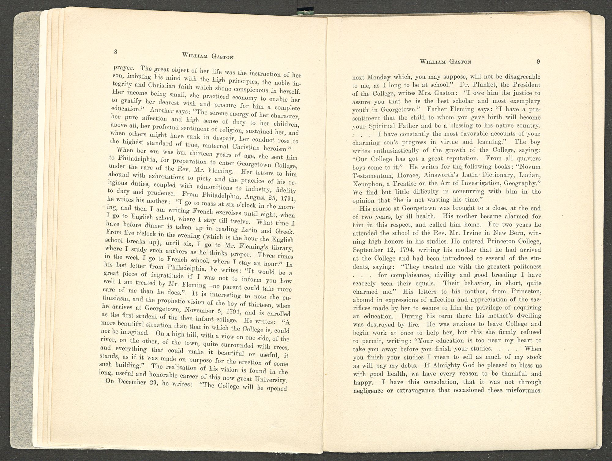 next Monday which, you may suppose, will not be disagreeable to me, as I long to be at school.” Dr. Plunket, the President of the College, writes Mrs. Gaston: “I owe him the justice to assure you that he is the best scholar and most exemplary youth in Georgetown Father Fleming says: “I have a presentiment that the child to whom you gave birth will become your Spiritual Father and be a blessing to his native country. . . . I have constantly the most favorable accounts of your charming son's progress in virtue and learning.” The boy writes enthusiastically of the growth of the College, saying: “Our College has got a great reputation. From all quarters boys come to it.” He writes for the following books: “Novum Testamentum, Horace, Ainsworth's Latin Dictionary, Lucian, Xenophon, a Treatise on the Art of Investigation, Geography.” We find but little difficulty in concurring with him in the opinion that “he is not wasting his time.”