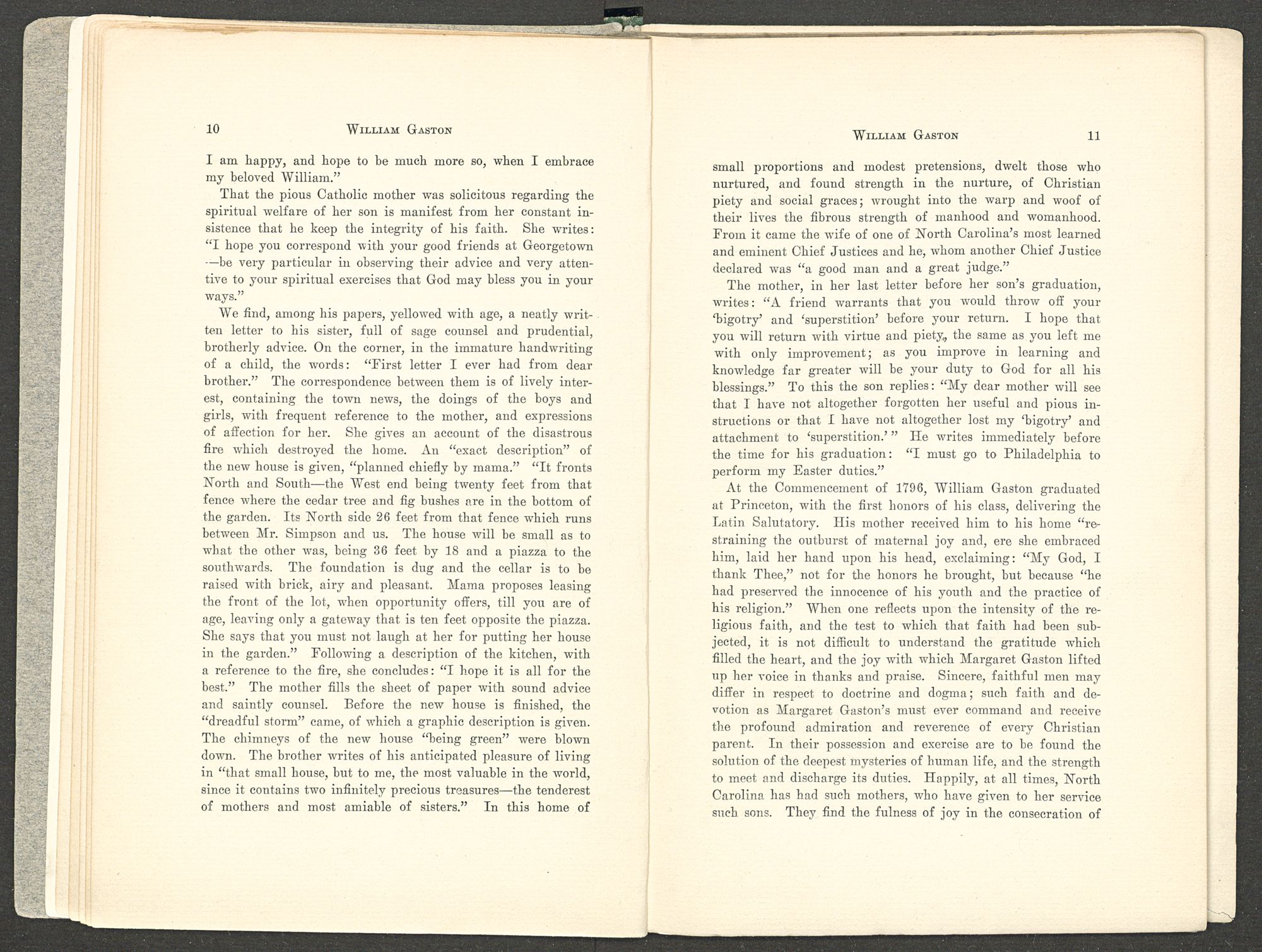 At the Commencement of 1796, William Gaston graduated at Princeton, with the first honors of his class, delivering the Latin Salutatory. His mother received him to his home “restraining the outburst of maternal joy and, ere she embraced him, laid her hand upon his head, exclaiming: “My God, I thank Thee,” not for the honors he brought, but because “he had preserved the innocence of his youth and the practice of his religion.” When one reflects upon the intensity of the religious faith, and the test to which that faith had been subjected, it is not difficult to understand the gratitude which filled the heart, and the joy with which Margaret Gaston lifted up her voice in thanks and praise. Sincere, faithful men may differ in respect to doctrine and dogma; such faith and devotion as Margaret Gaston's must ever command and receive the profound admiration and reverence of every Christian parent. In their possession and exercise are to be found the solution of the deepest mysteries of human life, and the strength to meet and discharge its duties. Happily, at all times, North Carolina has had such mothers, who have given to her service such sons. They find the fulness of joy in the consecration of