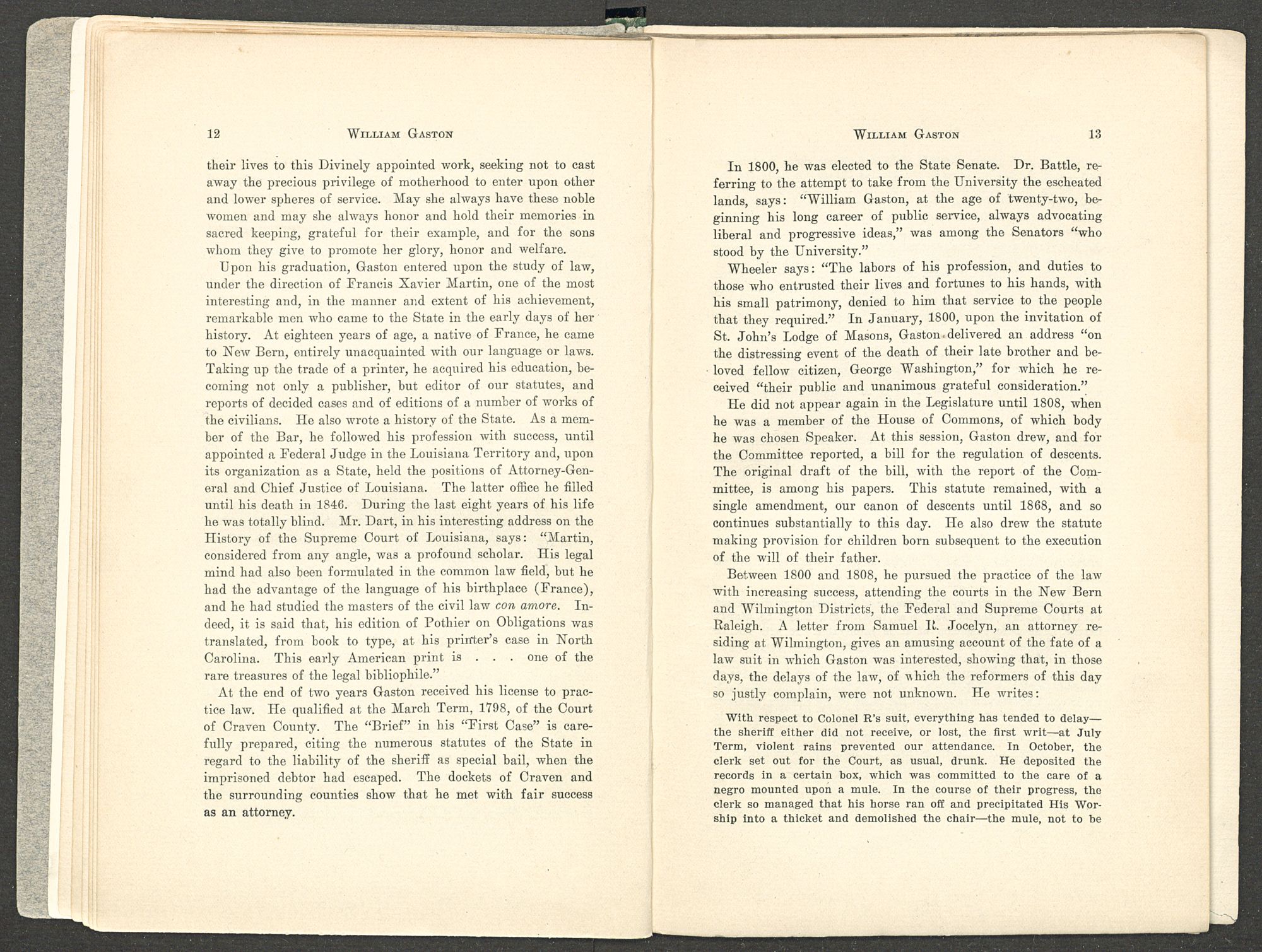 Upon his graduation, Gaston entered upon the study of law, under the direction of Francis Xavier Martin, one of the most interesting and, in the manner and extent of his achievement, remarkable men who came to the State in the early days of her history. At eighteen years of age, a native of France, he came to New Bern, entirely unacquainted with our language or laws. Taking up the trade of a printer, he acquired his education, becoming not only a publisher, but editor of our statutes, and reports of decided cases and of editions of a number of works of the civilians. He also wrote a history of the State. As a member of the Bar, he followed his profession with success, until appointed a Federal Judge in the Louisiana Territory and, upon its organization as a State, held the positions of Attorney-General and Chief Justice of Louisiana. The latter office he filled until his death in 1846. During the last eight years of his life he was totally blind. Mr. Dart, in his interesting address on the History of the Supreme Court of Louisiana, says: “Martin, considered from any angle, was a profound scholar. His legal mind had also been formulated in the common law field, but he had the advantage of the language of his birthplace (France), and he had studied the masters of the civil law con amore. Indeed, it is said that, his edition of Pothier on Obligations was translated, from book to type, at his printer's case in North Carolina. This early American print is . . . one of the rare treasures of the legal bibliophile.”