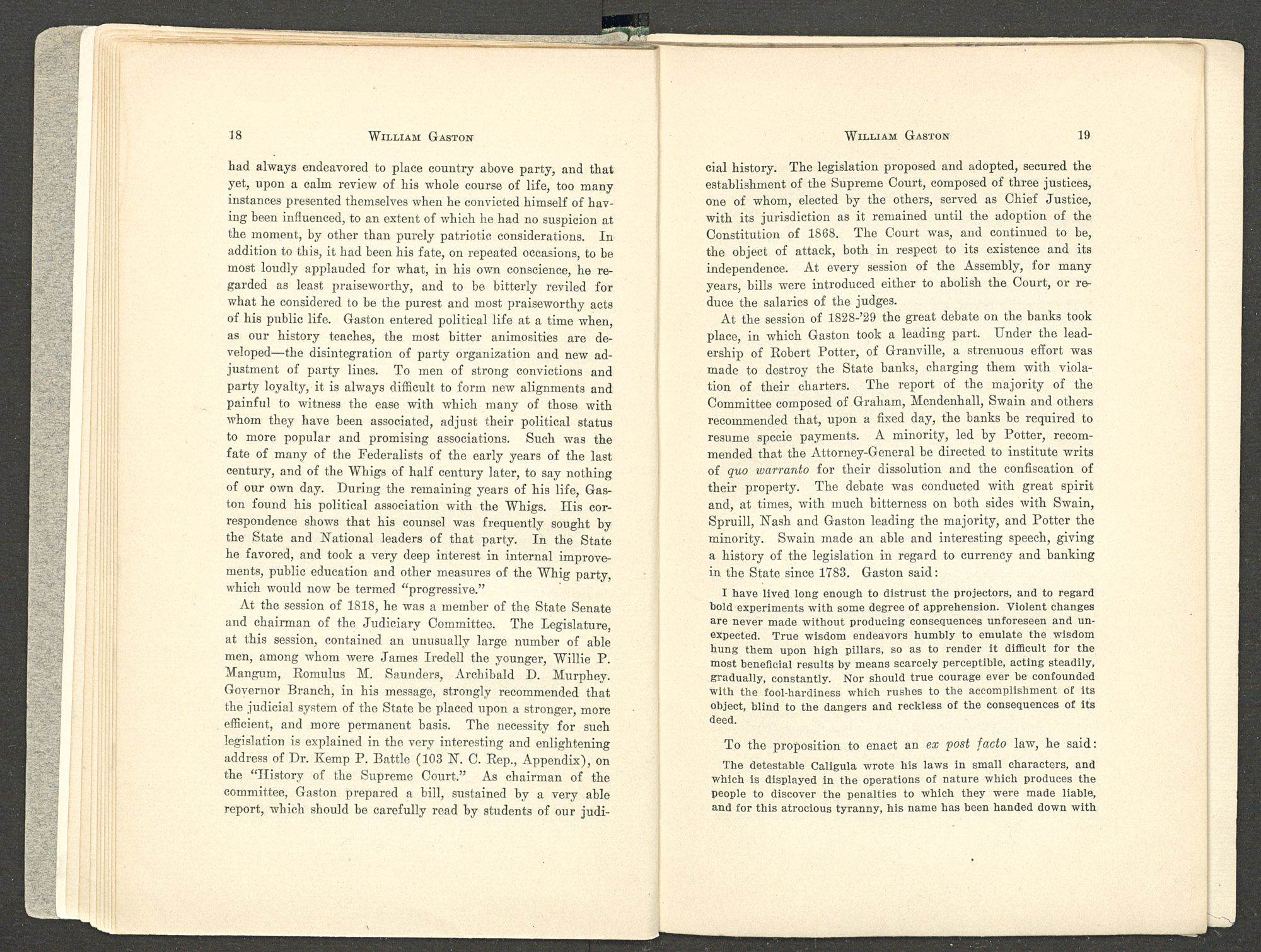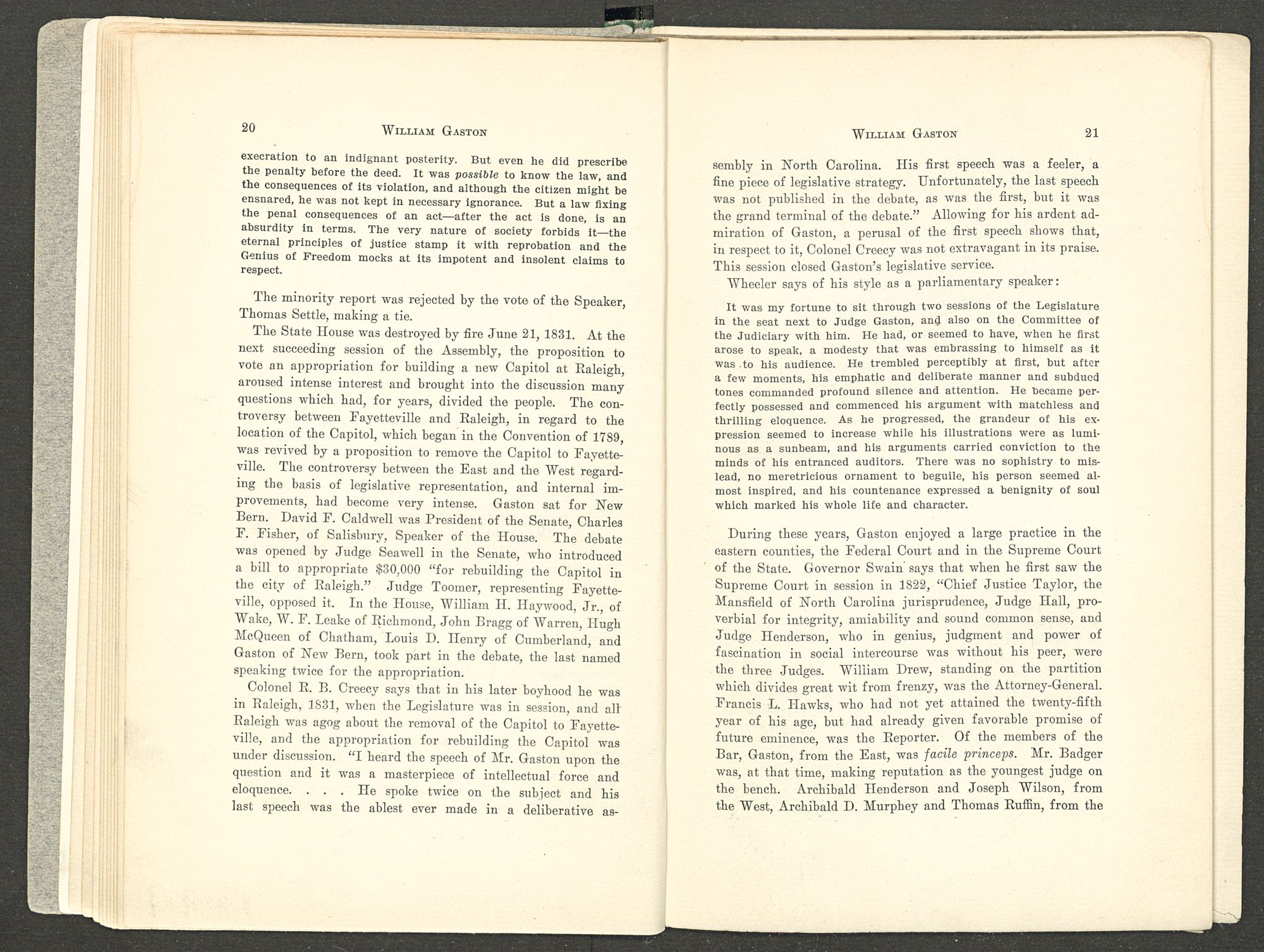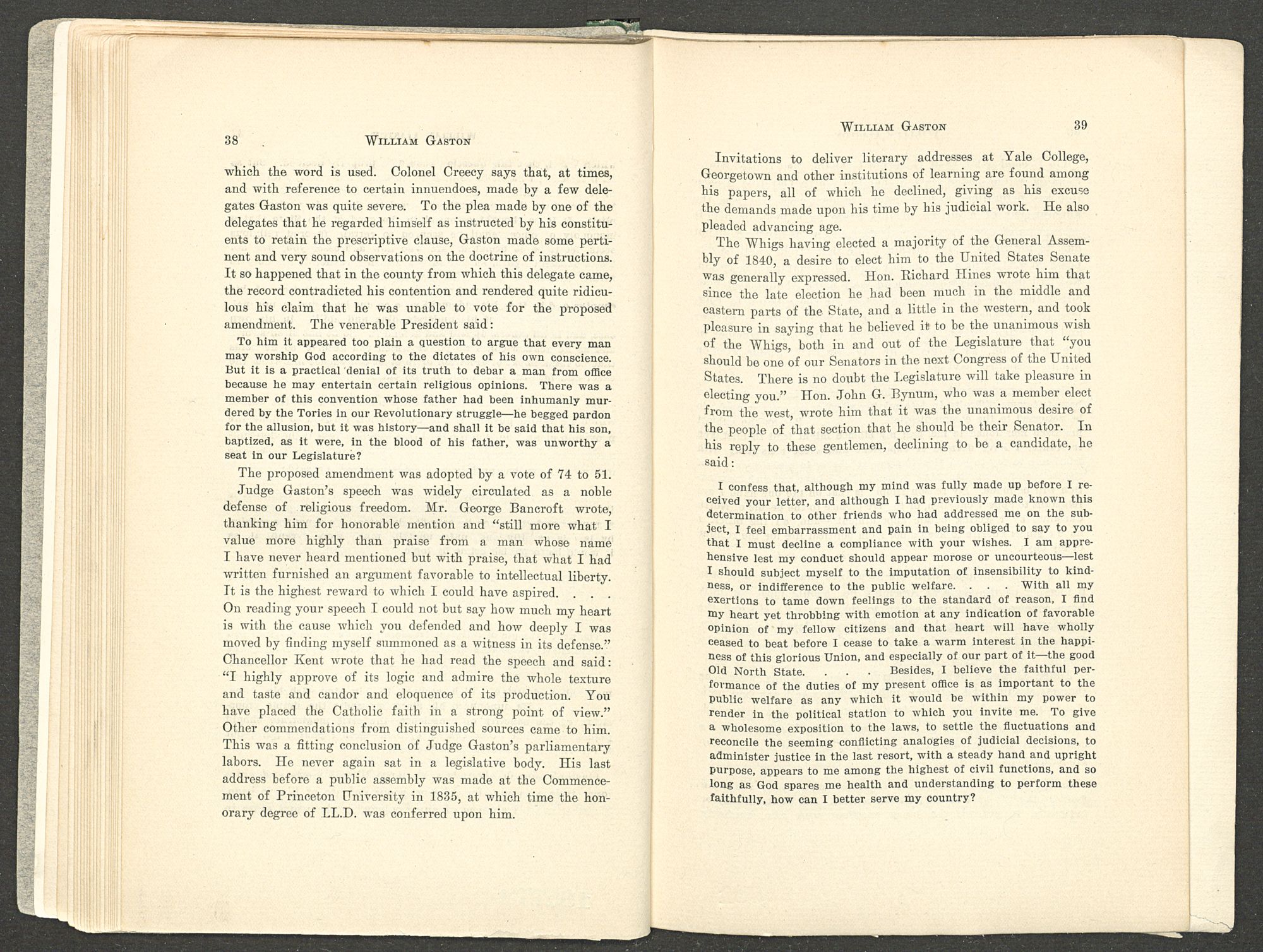 in North Carolina. His first speech was a feeler, a fine piece of legislative strategy. Unfortunately, the last speech was not published in the debate, as was the first, but it was the grand terminal of the debate.” Allowing for his ardent admiration of Gaston, a perusal of the first speech shows that, in respect to it, Colonel Creecy was not extravagant in its praise. This session closed Gaston's legislative service.