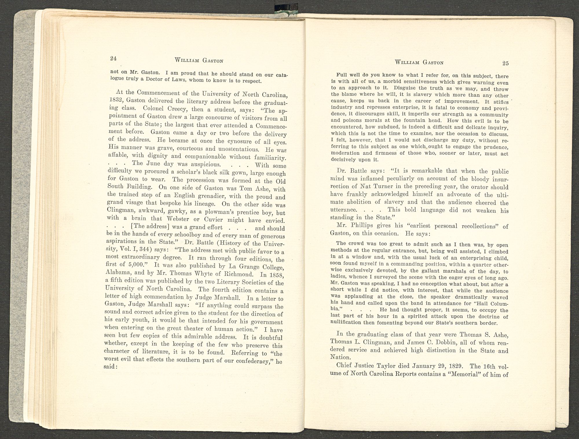 At the Commencement of the University of North Carolina, 1832, Gaston delivered the literary address before the graduating class. Colonel Creecy, then a student, says: “The appointment of Gaston drew a large concourse of visitors from all parts of the State; the largest that ever attended a Commencement before. Gaston came a day or two before the delivery of the address. He became at once the cynosure of all eyes. His manner was grave, courteous and unostentatious. He was affable, with dignity and companionable without familiarity. . . . The June day was auspicious. . . . With some difficulty we procured a scholar's black silk gown, large enough for Gaston to wear. The procession was formed at the Old South Building. On one side of Gaston was Tom Ashe, with the trained step of an English grenadier, with the proud and grand visage that bespoke his lineage. On the other side was Clingman, awkward, gawky, as a plowman's prentice boy, but with a brain that Webster or Cuvier might have envied. . . . [The address] was a grand effort . . . and should be in the hands of every schoolboy and of every man of generous aspirations in the State.” Dr. Battle (History of the University, Vol. I, 344) says: “The address met with public favor to a most extraordinary degree. It ran through four editions, the first of 5,000.” It was also published by La Grange College, Alabama, and by Mr. Thomas Whyte of Richmond. In 1858, a fifth edition was published by the two Literary Societies of the University of North Carolina. The fourth edition contains a letter of high commendation by Judge Marshall. In a letter to Gaston, Judge Marshall says: “If anything could surpass the sound and correct advice given to the student for the direction of his early youth, it would be that intended for his government when entering on the great theater of human action.” I have seen but few copies of this admirable address. It is doubtful whether, except in the keeping of the few who preserve this character of literature, it is to be found. Referring to “the worst evil that effects the southern part of our confederacy,” he said: