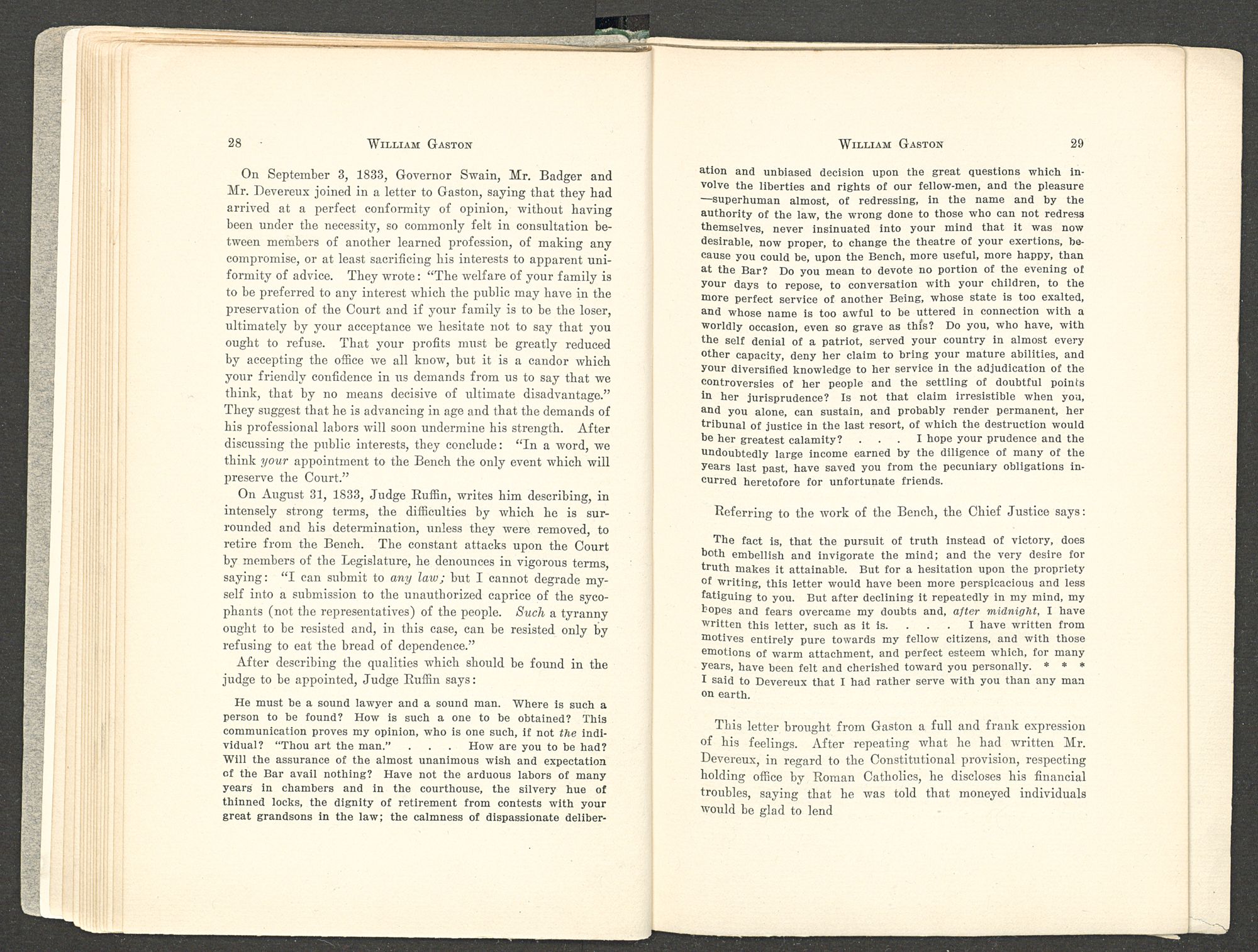 On May 19, Mr. Gaston, answering the letter, said that until lately he had supposed himself exempt from the necessity of deciding whether he should not accept an office under the State. He had doubted whether the Constitution did not disqualify Roman Catholics from holding an office, and with such doubt he should have deemed it sinful to accept an office if tendered, but a year or two since the office of Justice of the Peace was conferred upon his son and, before he decided to qualify, he felt it a duty to examine whether the Constitution contained such disqualification.1 “I then came to the conclusion, aided by one of the best legal understandings in the State, that whatever reason there might be to conjecture, that some of the framers of the Constitution intended to prohibit Roman Catholics from holding office, judicially, it must be expounded as not declaring such disability.” The reference to “the opinion of one of the best legal understandings in the State,” is explained by a letter to Gaston from Judge Ruffin, May 23, 1832, in which, at great length, and with much care, he examined the questions from every angle and concludes: “I have much confidence in the