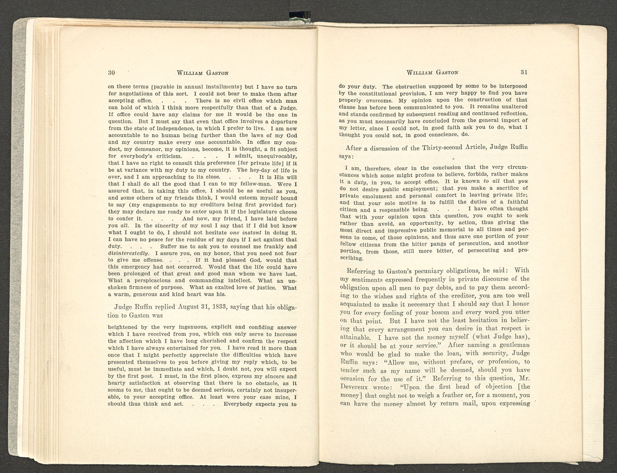 conclusion I have long ago arrived at, that a Roman Catholic may lawfully, before God and man, undertake to serve North Carolina to the best of his ability in any civil office according to his natural allegiance and his personal duty. . . . I am very decidedly persuaded, and have long been, that Roman Catholics cannot, without giving to the terms of the Constitution a latitude and force altogether unauthorized, be excluded from civil office.” After naming other considerations, entering into the question of accepting the office, Gaston writes to Mr. Devereux: “I shall then leave it to a few friends—in whose integrity, knowledge of what would be expected from me, and in whose frankness I can confide, to say what duty demands of me and this friendly tribunal I wish to consist of Governor Swain, Mr. Badger and yourself.” In his letter to Mr. Devereux, Gaston mentions, as one of the “very serious” reasons causing him to hesitate about accepting office, that he is in debt and sees no prospect of speedily relieving himself if he abandons the Bar. He says: “When I look back upon my culpable inattention to pecuniary matters, I find it difficult to account for my folly. . . . My resolution was formed to pay off my debt by my labor, and, to a great extent, this has been done. But it has not been fully done. I yet owe about $8,000 and with my present income I may well hope to accomplish this in two years more. Were I to accept a seat on the Bench, I should abridge that income $3,500 or more [the salary was $2,500] there would then be no chance of my paying the debt within that time, or as rapidly as the rules of the banks require.” He says that he would not accept the position unless his debt could be placed in other hands than the banks upon such time as he could, out of his salary, discharge it. He concludes his letter: