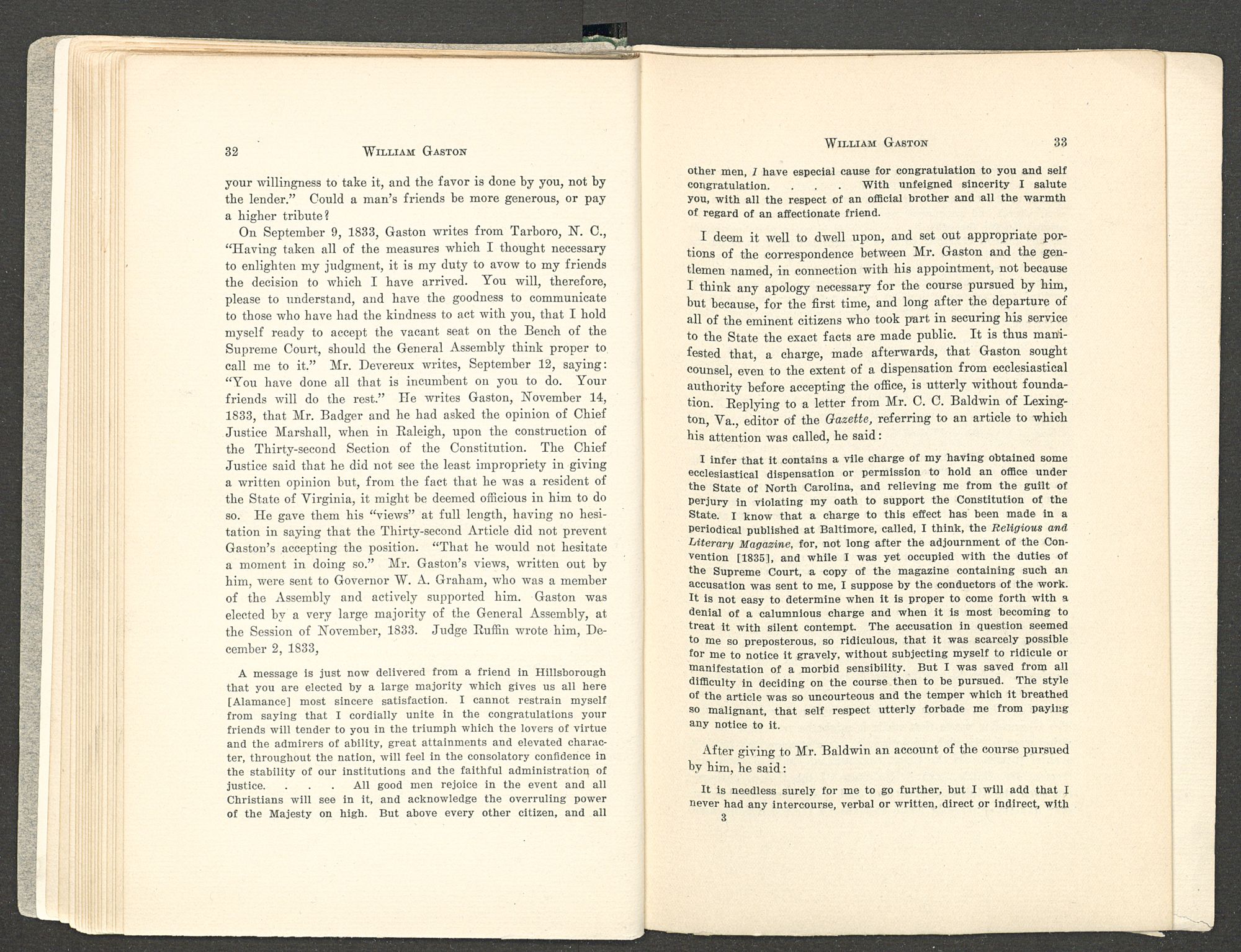 On September 9, 1833, Gaston writes from Tarboro, N. C., “Having taken all of the measures which I thought necessary to enlighten my judgment, it is my duty to avow to my friends the decision to which I have arrived. You will, therefore, please to understand, and have the goodness to communicate to those who have had the kindness to act with you, that I hold myself ready to accept the vacant seat on the Bench of the Supreme Court, should the General Assembly think proper to call me to it.” Mr. Devereux writes, September 12, saying: “You have done all that is incumbent on you to do. Your friends will do the rest.” He writes Gaston, November 14, 1833, that Mr. Badger and he had asked the opinion of Chief Justice Marshall, when in Raleigh, upon the construction of the Thirty-second Section of the Constitution. The Chief Justice said that he did not see the least impropriety in giving a written opinion but, from the fact that he was a resident of the State of Virginia, it might be deemed officious in him to do so. He gave them his “views” at full length, having no hesitation in saying that the Thirty-second Article did not prevent Gaston's accepting the position. “That he would not hesitate a moment in doing so.” Mr. Gaston's views, written out by him, were sent to Governor W. A. Graham, who was a member of the Assembly and actively supported him. Gaston was elected by a very large majority of the General Assembly, at the Session of November, 1833. Judge Ruffin wrote him, December 2, 1833,