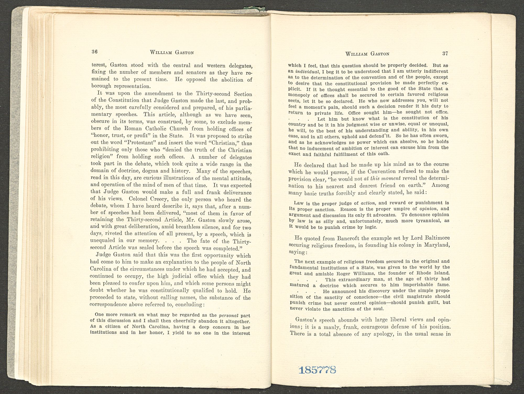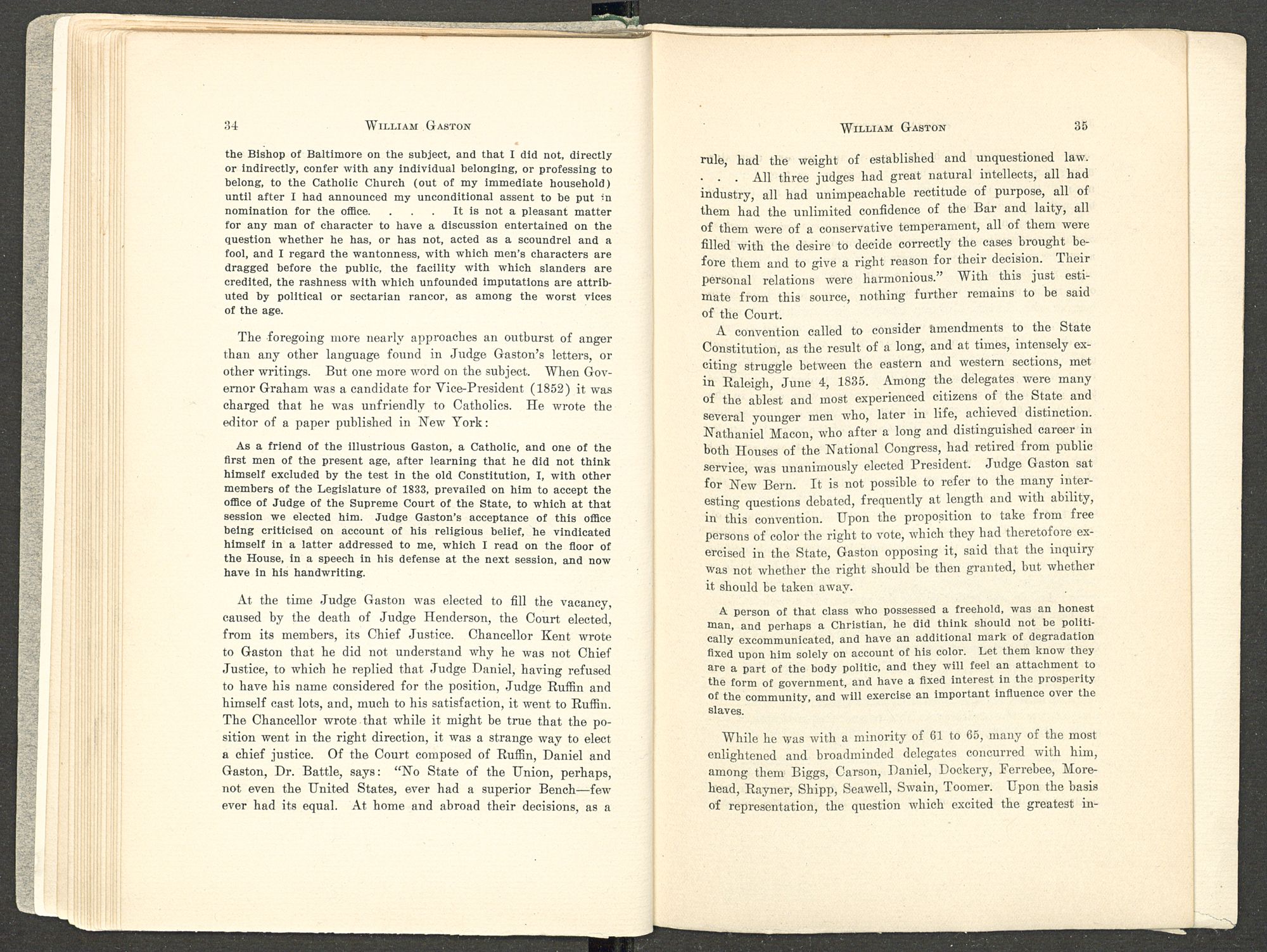 As a friend of the illustrious Gaston, a Catholic, and one of the first men of the present age, after learning that he did not think himself excluded by the test in the old Constitution, I, with other members of the Legislature of 1833, prevailed on him to accept the office of Judge of the Supreme Court of the State, to which at that session we elected him. Judge Gaston's acceptance of this office being criticised on account of his religious belief, he vindicated himself in a latter addressed to me, which I read on the floor of the House, in a speech in his defense at the next session, and now have in his handwriting.