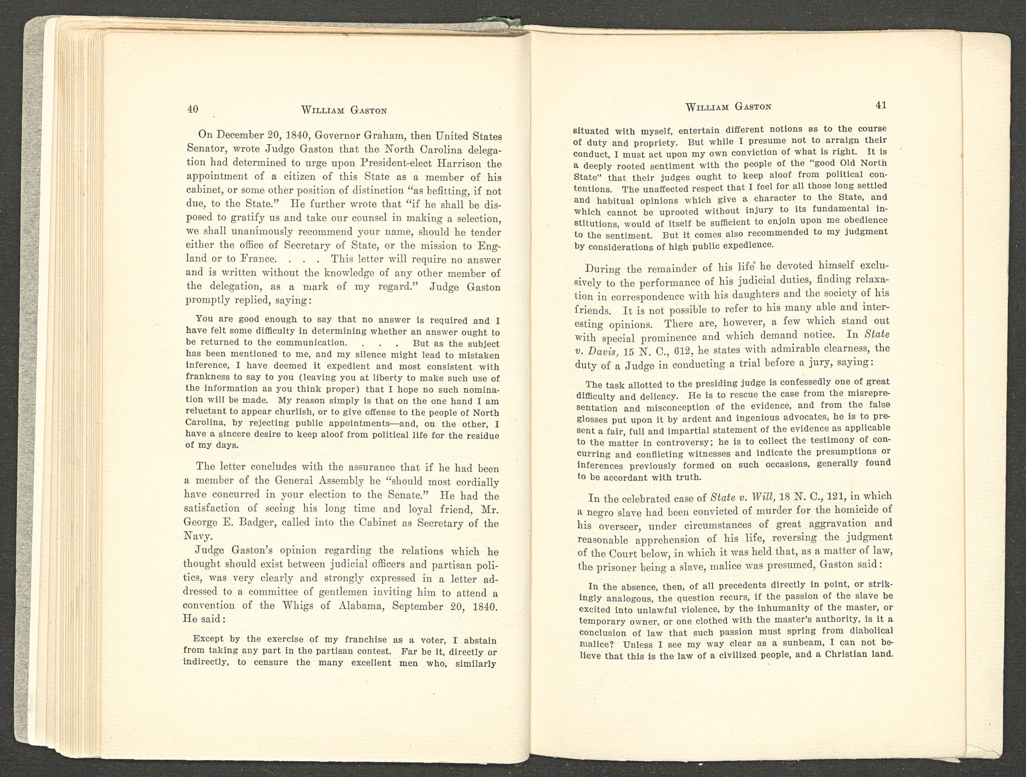 Others have spoken of him as a great statesman, a learned Judge, a ripe scholar. They are better judges of these things than we are; in our humble situation we shall confine ourselves to his walk among us. As our neighbor, our friend and kind protector, it is our privilege to speak from personal observation. Where so many virtues and graces are blended in the same individual it is not easy to particularize. Judge Gaston was an example in word and conversation, in spirit and purity. He was the friend of the widow and the orphan—he was a kind and indulgent master . . . the most of his servants can read and write, the consequence is they are a most intelligent set of people.