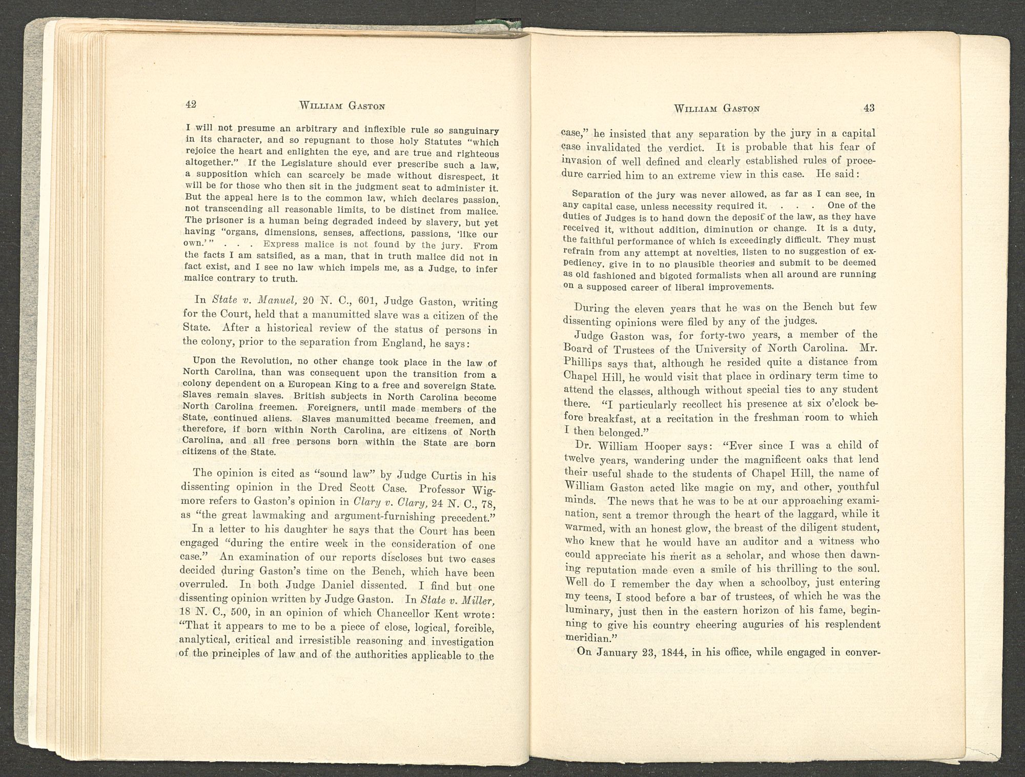 Judge Gaston was a friend of emancipation, he not only emancipated several of his own people, but he bought others and set them free. . . . He was a Christian in deed and in truth; his religion was not a thing of form and decencies, it was a pervading principle that entered into all his concerns, all his thoughts and all his hopes. His course was marked with no obliquity, his path was a shining light—the voice of calumny shrunk abashed at his presence.