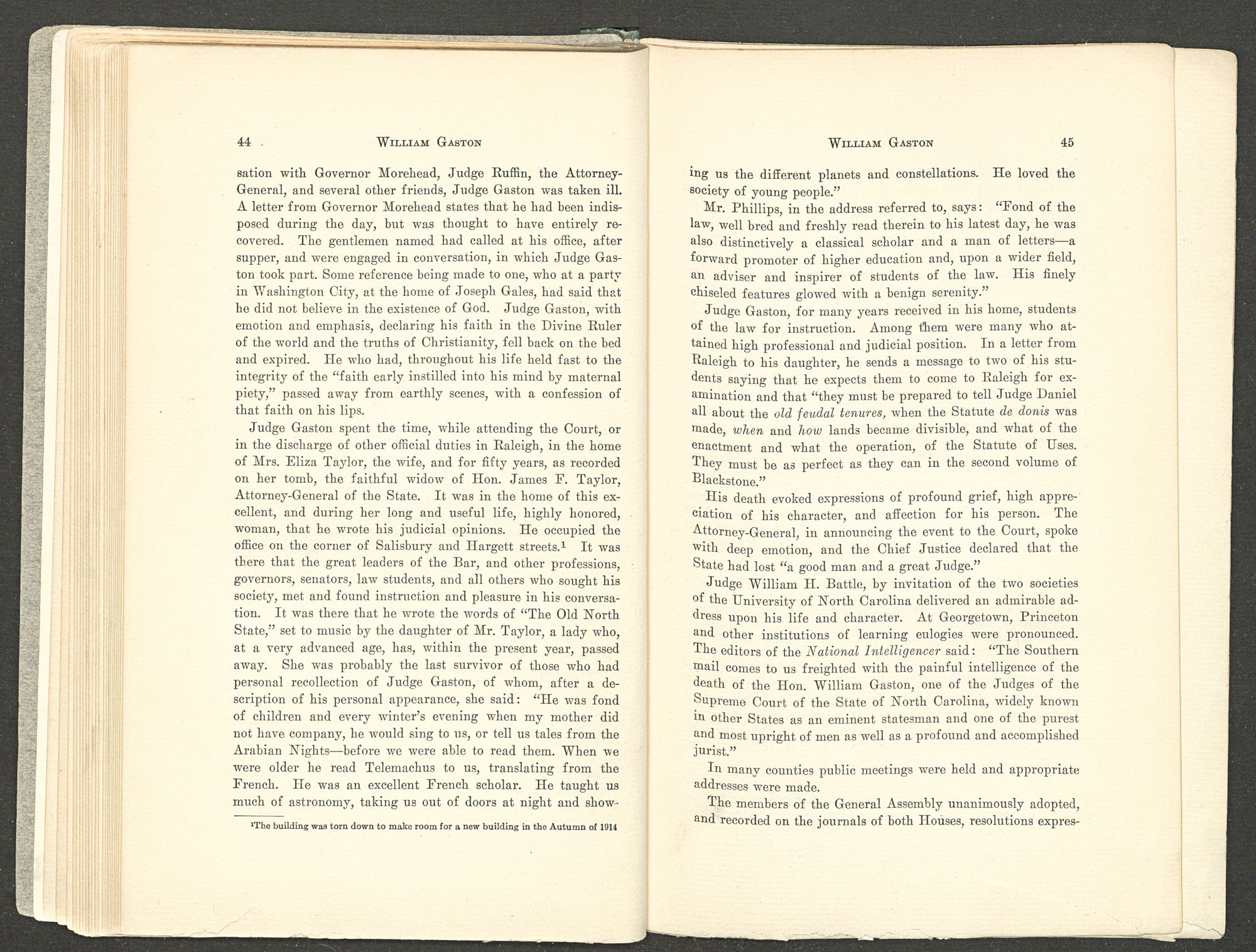 Judge Gaston spent the time, while attending the Court, or in the discharge of other official duties in Raleigh, in the home of Mrs. Eliza Taylor, the wife, and for fifty years, as recorded on her tomb, the faithful widow of Hon. James F. Taylor, Attorney-General of the State. It was in the home of this excellent, and during her long and useful life, highly honored, woman, that he wrote his judicial opinions. He occupied the office on the corner of Salisbury and Hargett streets.1 It was there that the great leaders of the Bar, and other professions, governors, senators, law students, and all others who sought his society, met and found instruction and pleasure in his conversation. It was there that he wrote the words of “The Old North State,” set to music by the daughter of Mr. Taylor, a lady who, at a very advanced age, has, within the present year, passed away. She was probably the last survivor of those who had personal recollection of Judge Gaston, of whom, after a description of his personal appearance, she said: “He was fond of children and every winter's evening when my mother did not have company, he would sing to us, or tell us tales from the Arabian Nights—before we were able to read them. When we were older he read Telemachus to us, translating from the French. He was an excellent French scholar. He taught us much of astronomy, taking us out of doors at night and showing
