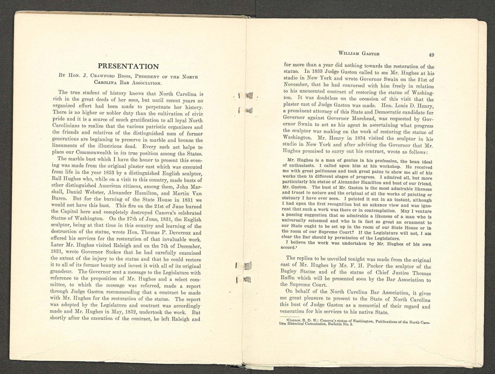 On the evening of November 24, 1914, in the Hall of the House of Representatives, at Raleigh, the North Carolina Bar Association presented to the State of North Carolina a marble bust of the late William Gaston. The bust was copied by Frank H. Packer from a plaster cast executed from life in 1833 by Ball Hughes, now in possession of Judge Gaston's granddaughter, Mrs. Isabel Donaldson Bronson, of Summit, N. J. Hon. Clement Manly, Chairman of the Committee of the Bar Association, presided over the exercises. An address on the life and character of Judge Gaston was delivered by Hon. H. G. Connor, United States Judge for the Eastern District of North Carolina. The bust was presented by Hon. J. Crawford Biggs, president of the North Carolina Bar Association, and accepted on behalf of the State, by Governor Locke Craig. It has been set up in the State Administration Building, in which the Supreme Court of North Carolina holds its sessions.