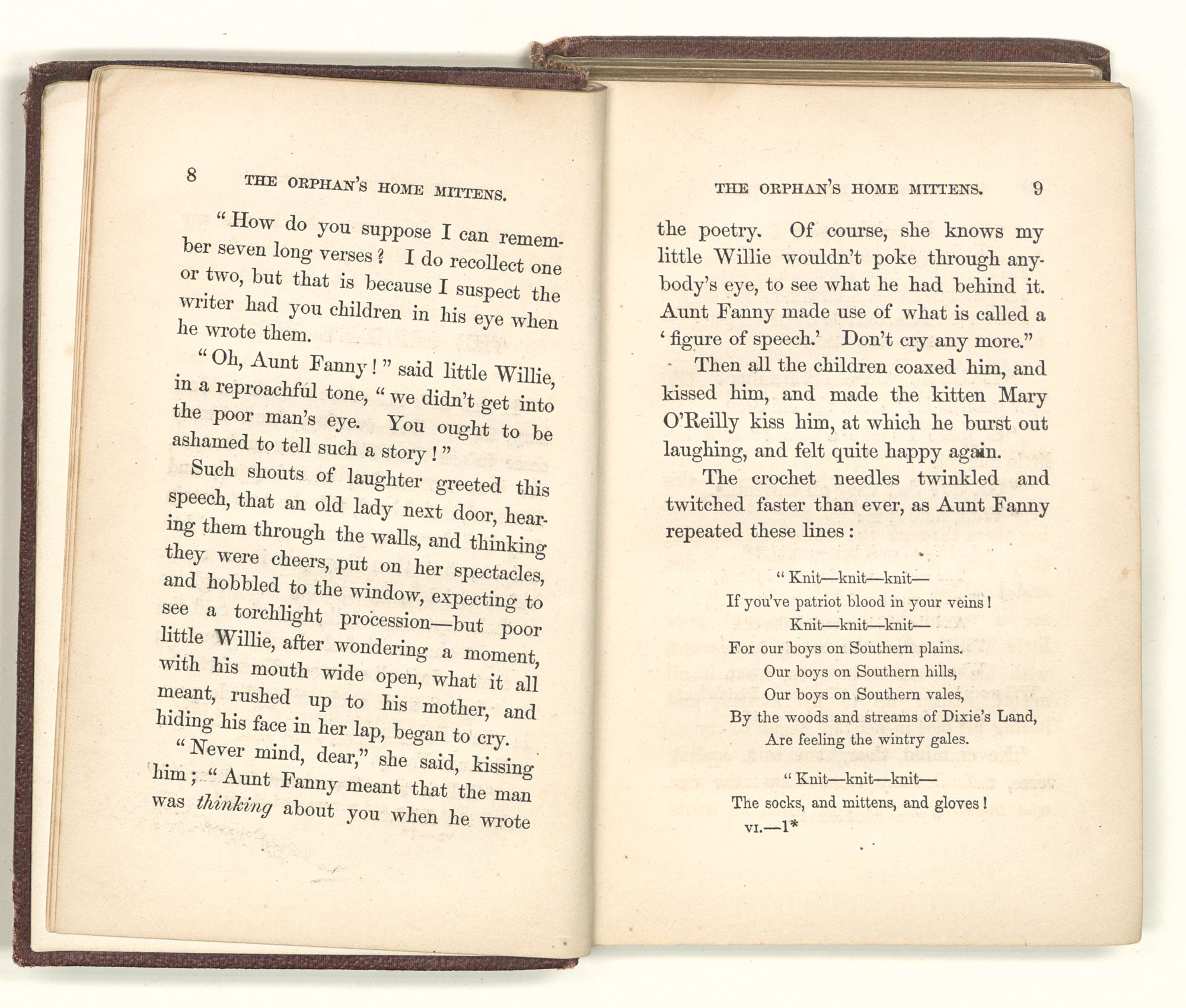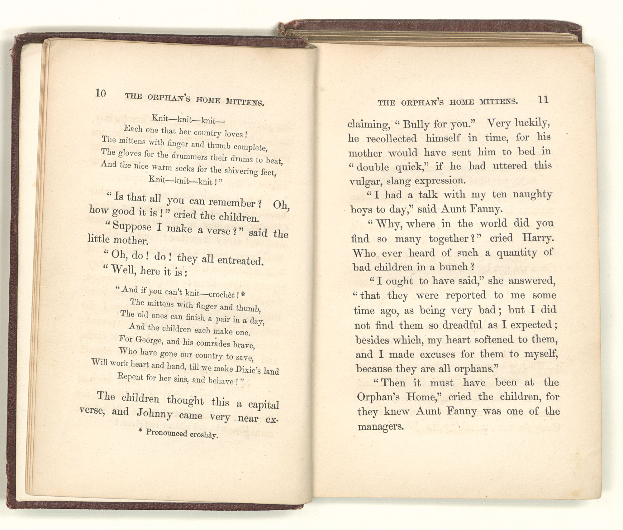 “Knit—knit—knit—If you've patriot blood in your veins!Knit—knit—knit—For our boys on Southern plains.Our boys on Southern hills,Our boys on Southern vales,By the woods and streams of Dixie's Land,Are feeling the wintry gales.“Knit—knit—knit—The socks, and mittens, and gloves!Knit—knit—knit—Each one that her country loves!The mittens with finger and thumb complete,The gloves for the drummers their drums to beat,And the nice warm socks for the shivering feet,Knit—knit—knit!”