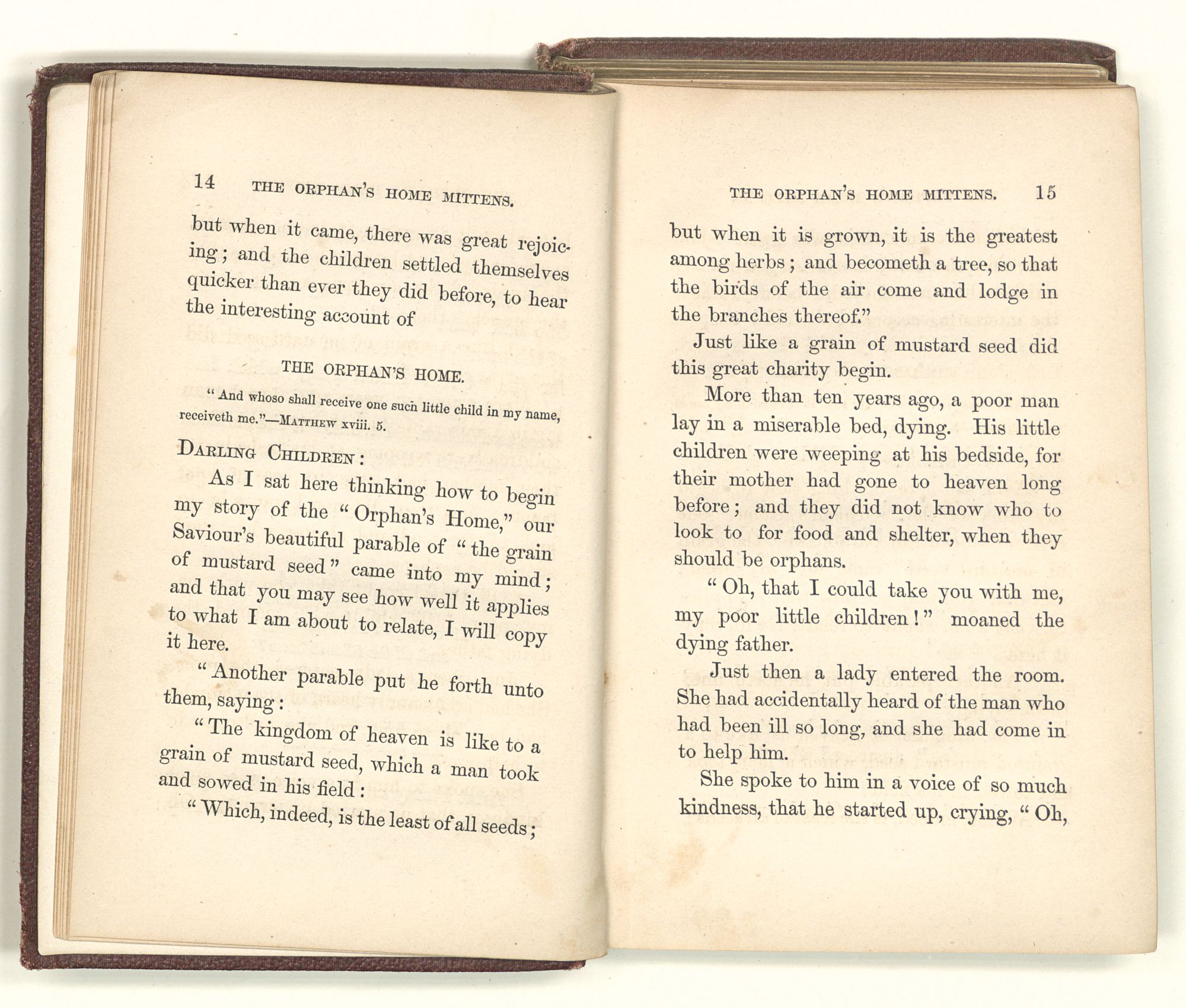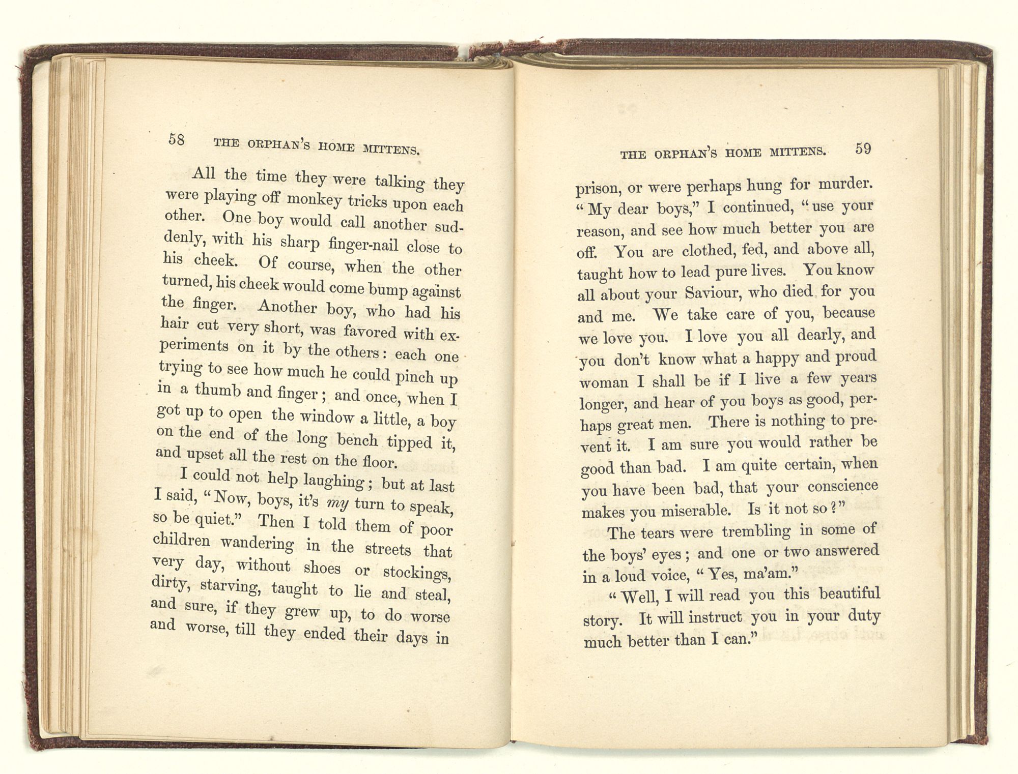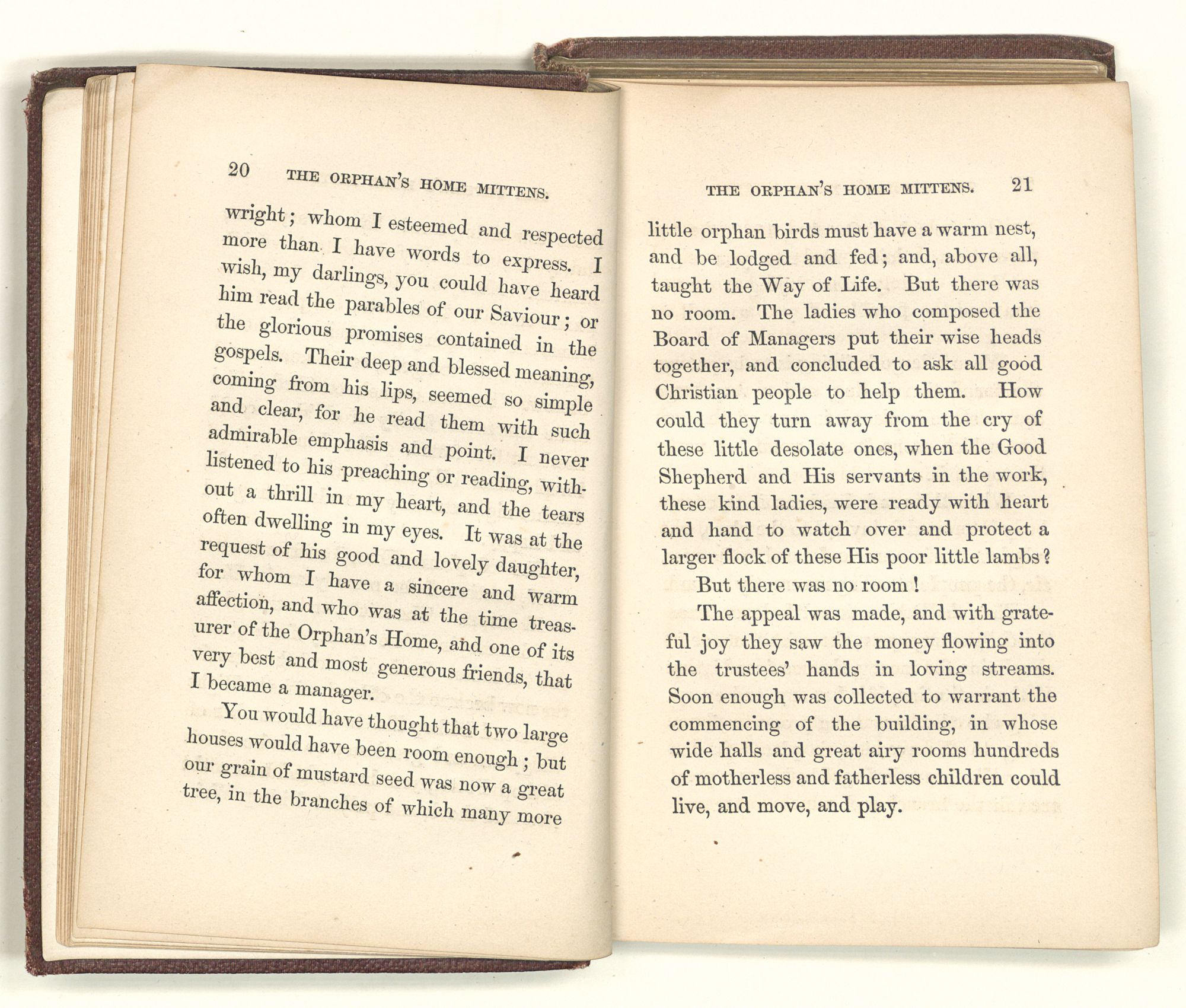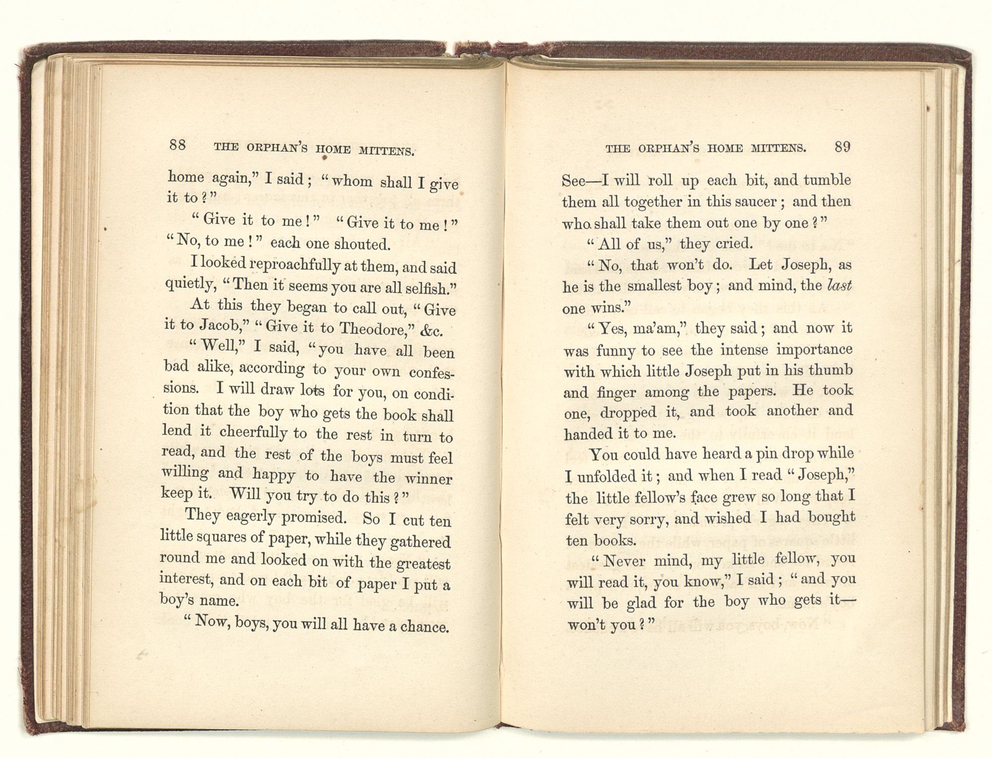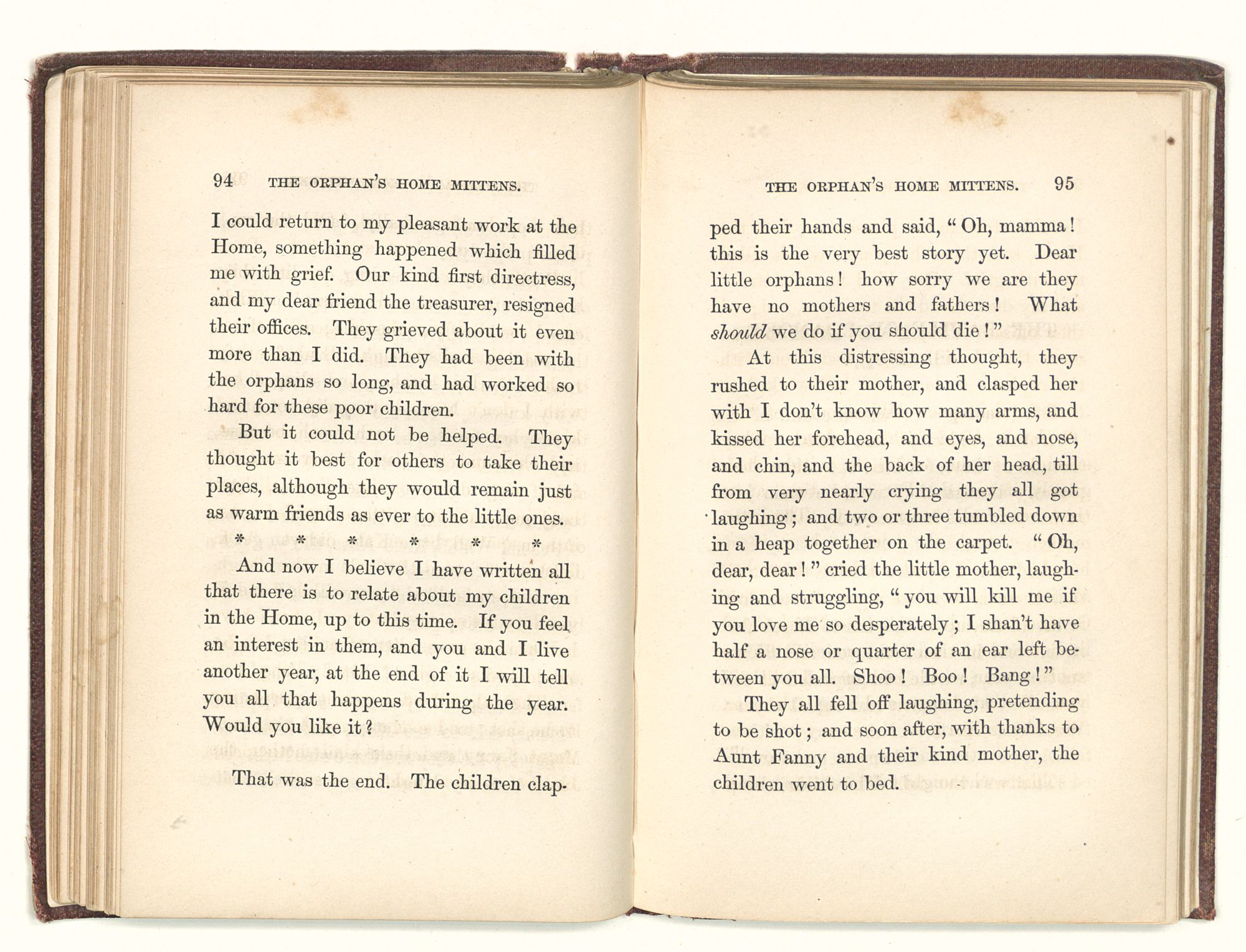 “Oh, yes, do! how long will it take you? We'll write to George that these mittens have listened, with their fingers and thumbs for ears, to your “Orphan's Home” story. They will be the most interesting mittens of all: more so, than those we got by our little play.”