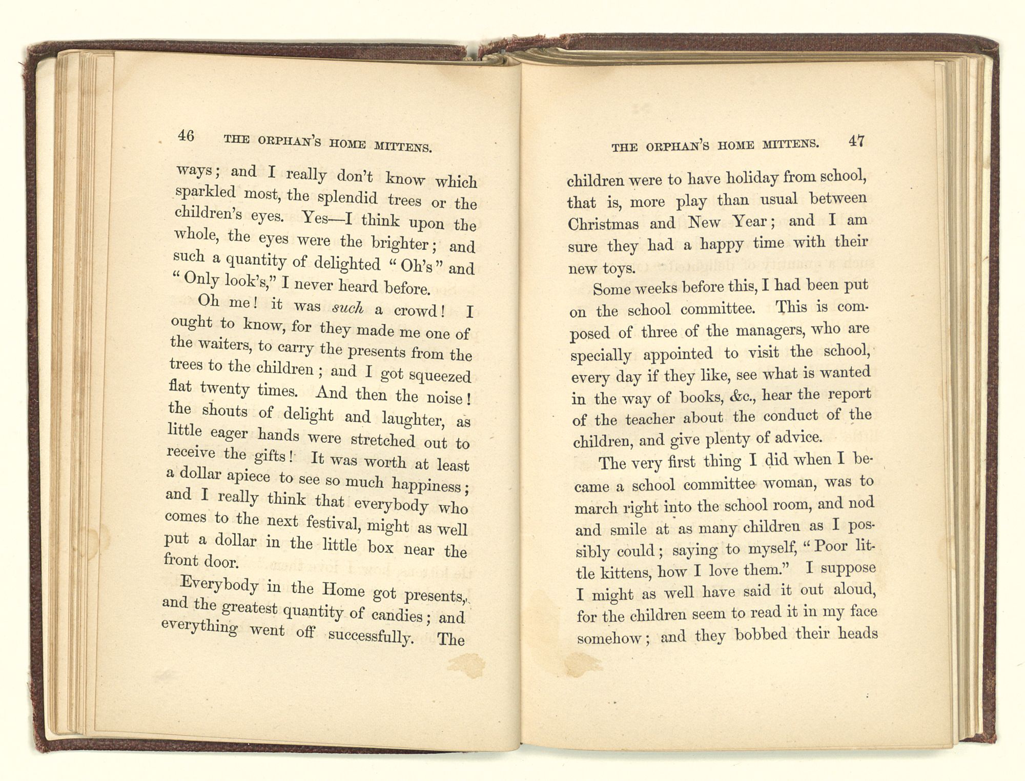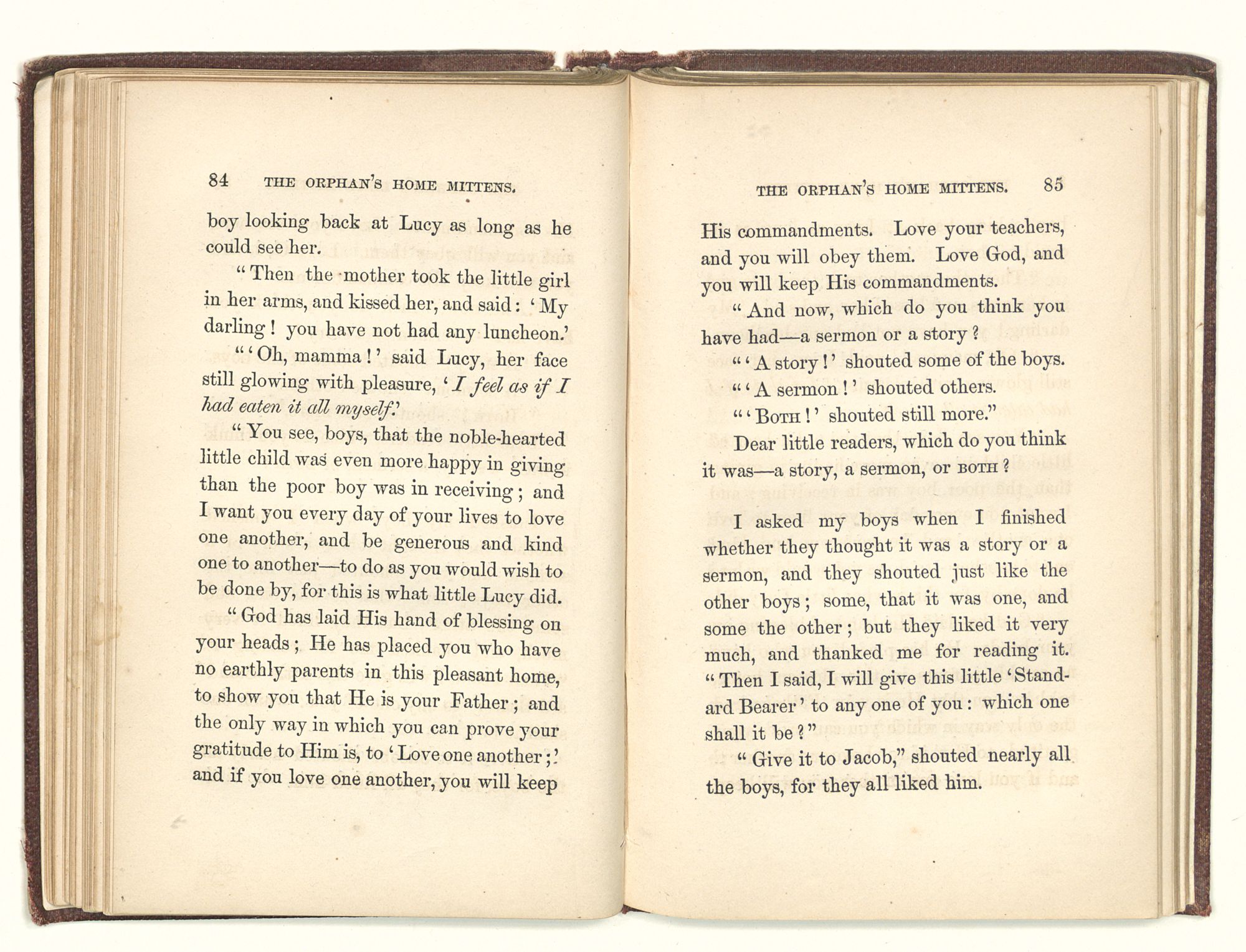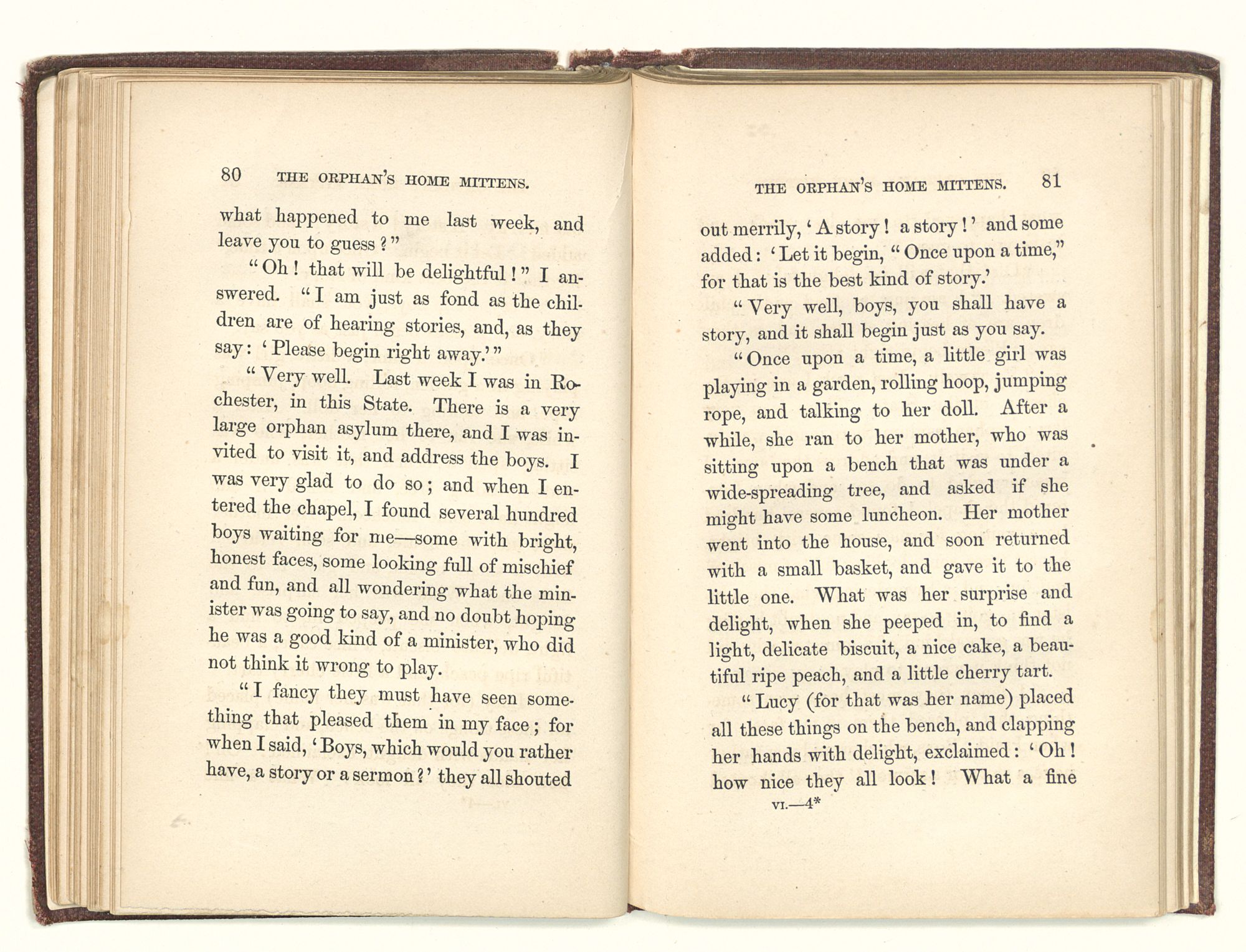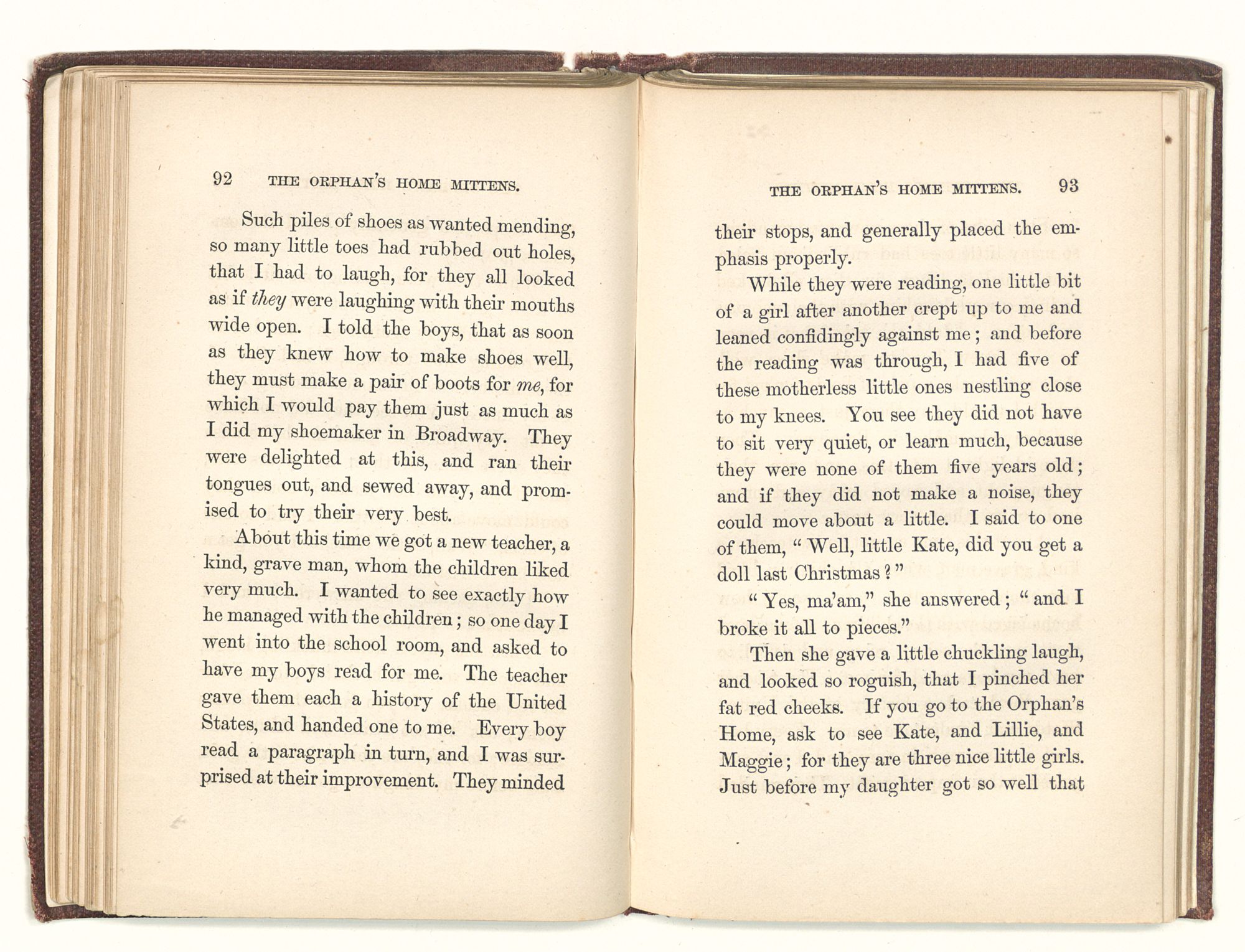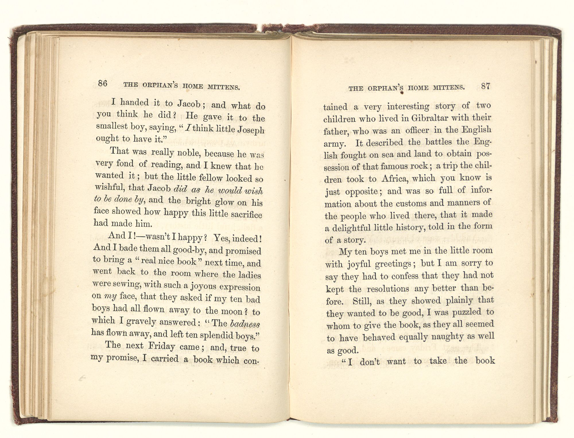 “Oh, yes, do! how long will it take you? We'll write to George that these mittens have listened, with their fingers and thumbs for ears, to your “Orphan's Home” story. They will be the most interesting mittens of all: more so, than those we got by our little play.”