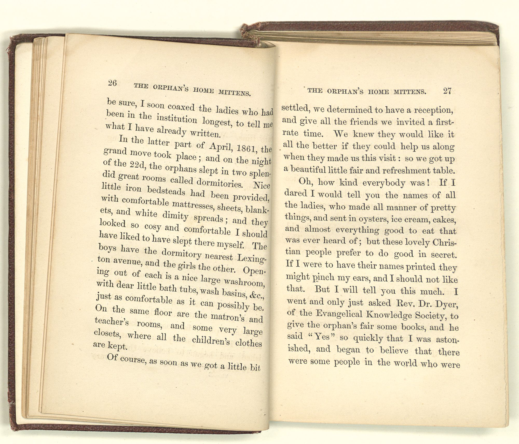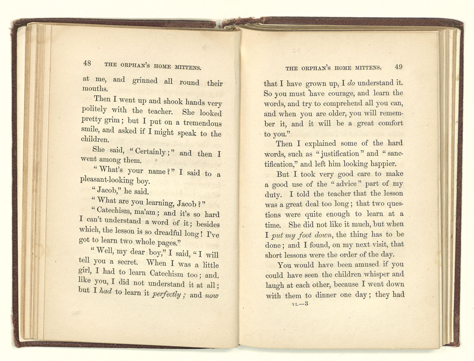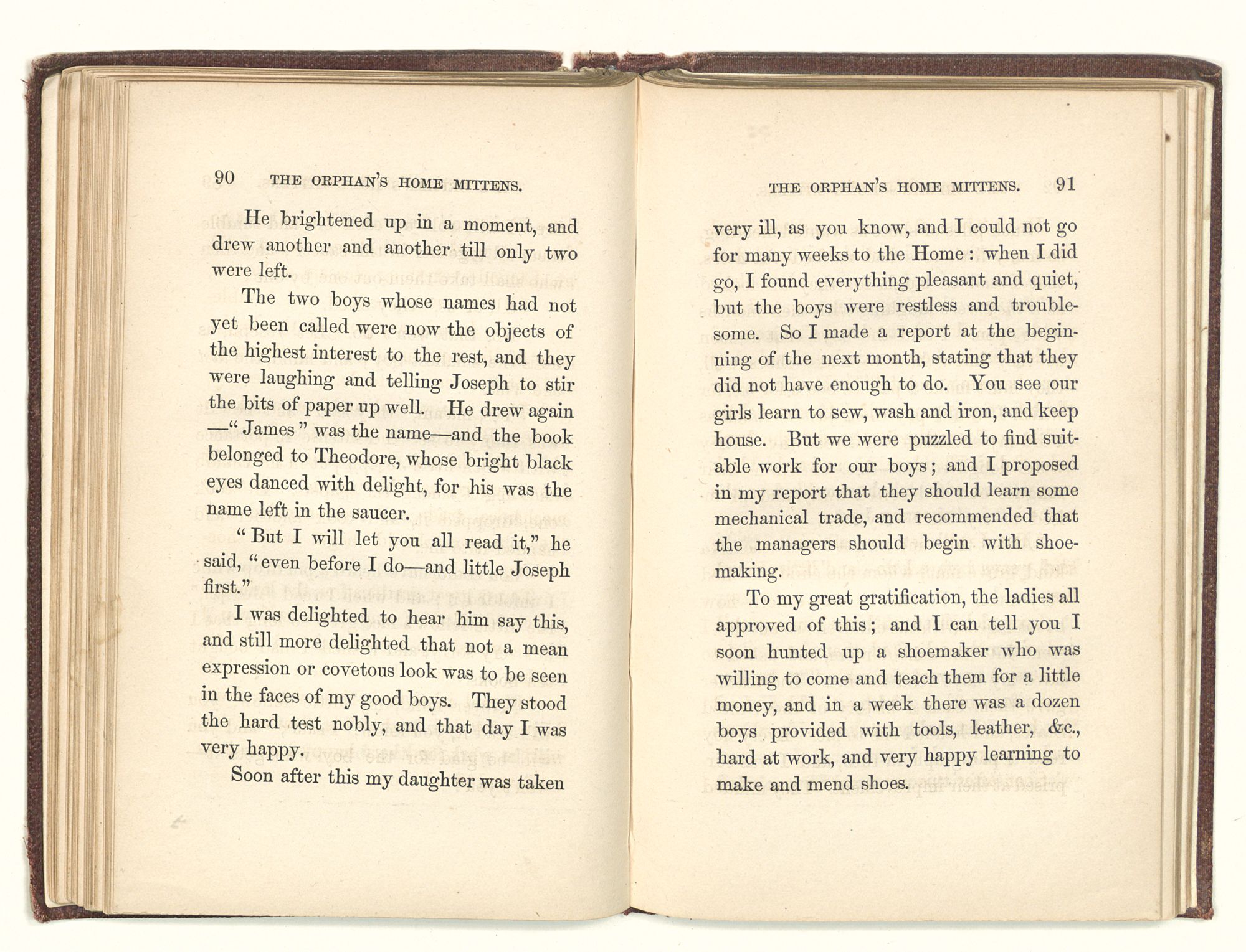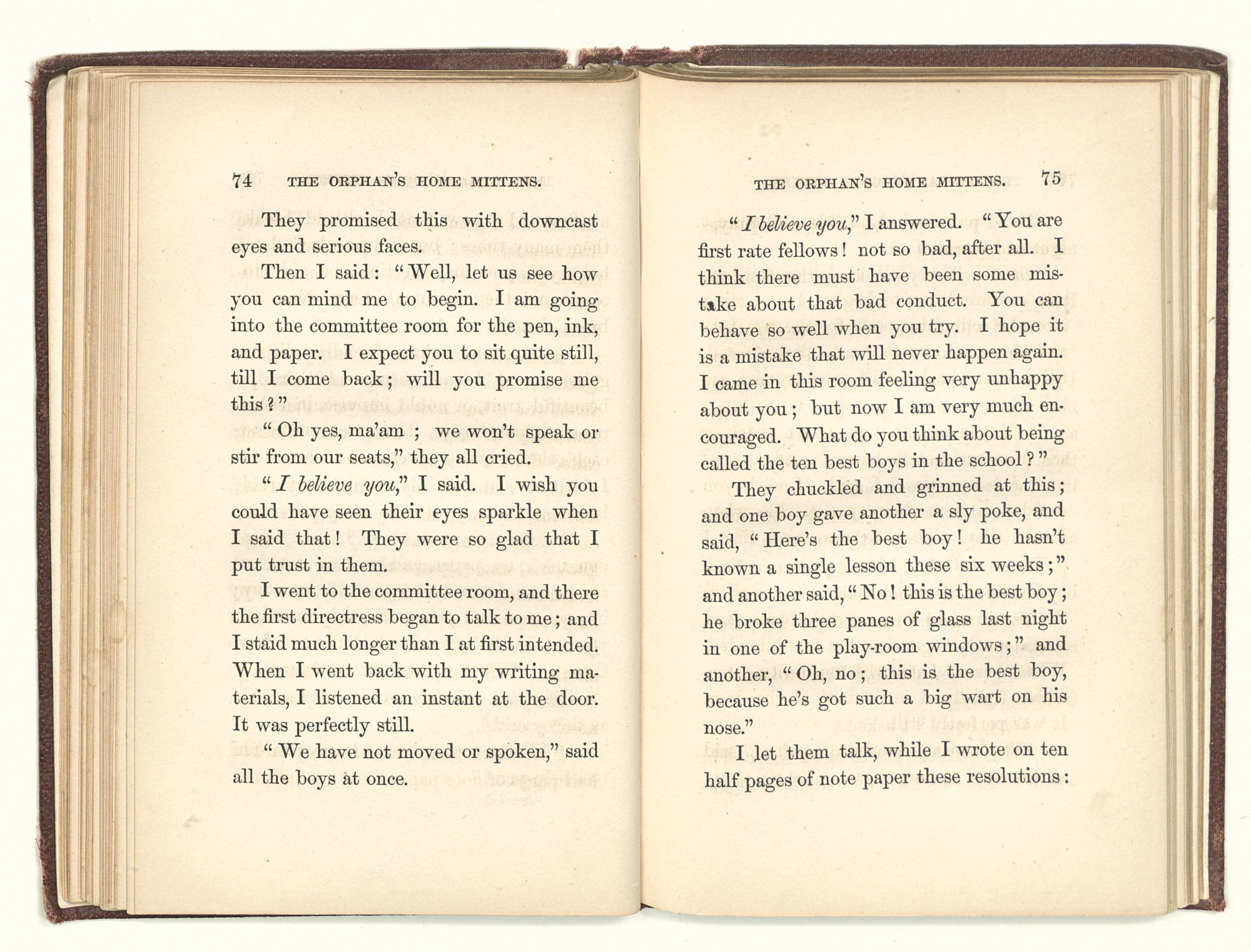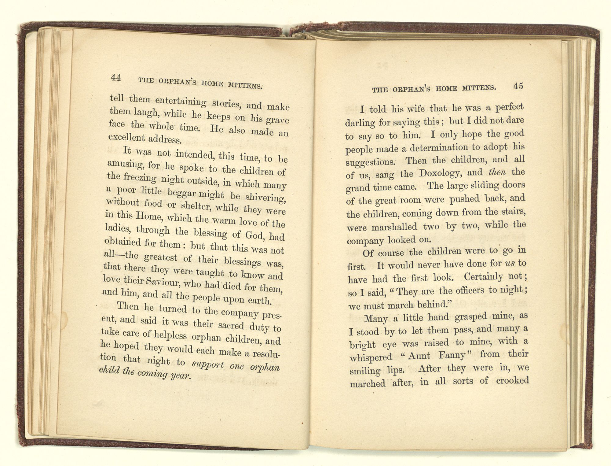 “Oh, yes, do! how long will it take you? We'll write to George that these mittens have listened, with their fingers and thumbs for ears, to your “Orphan's Home” story. They will be the most interesting mittens of all: more so, than those we got by our little play.”