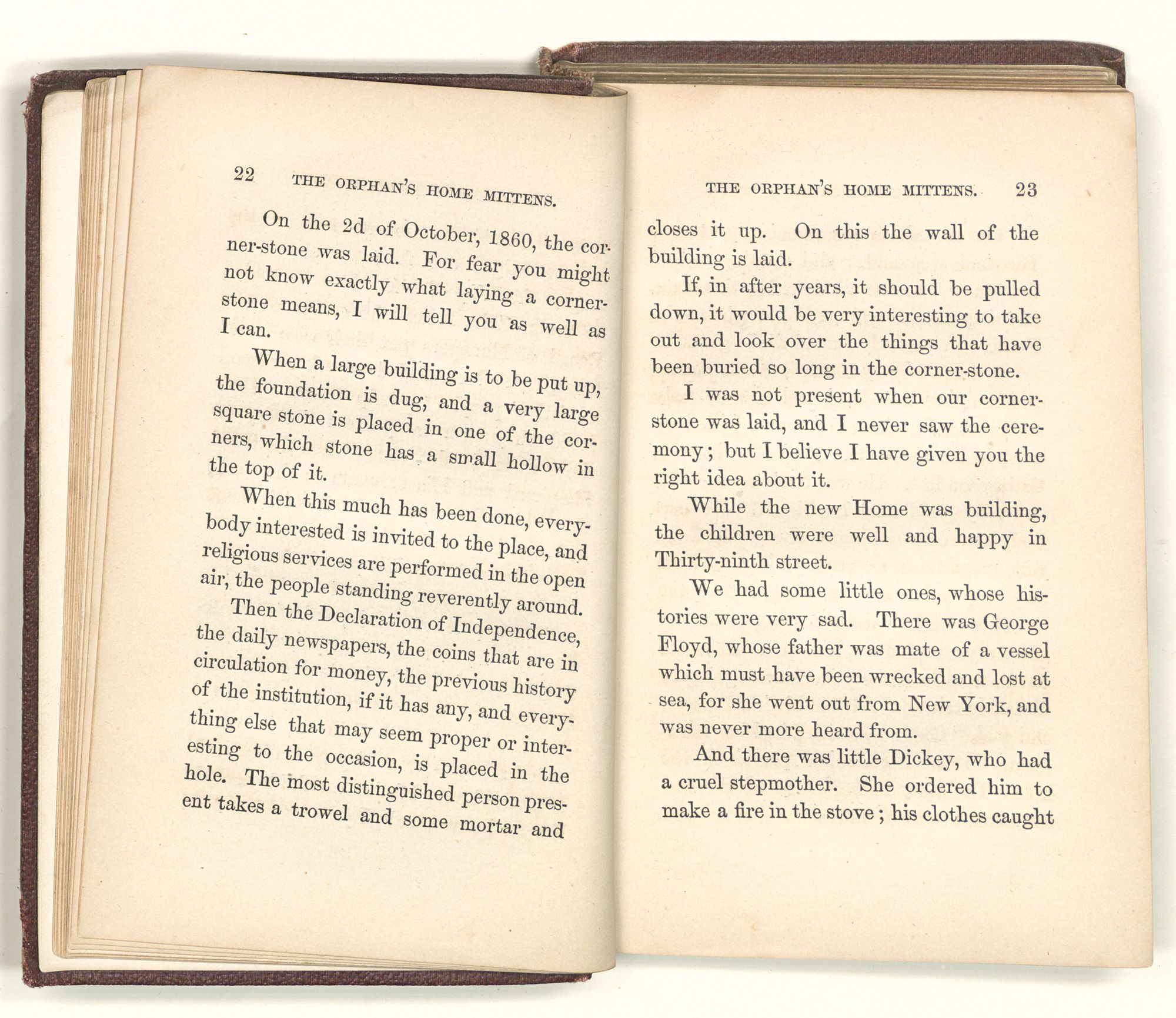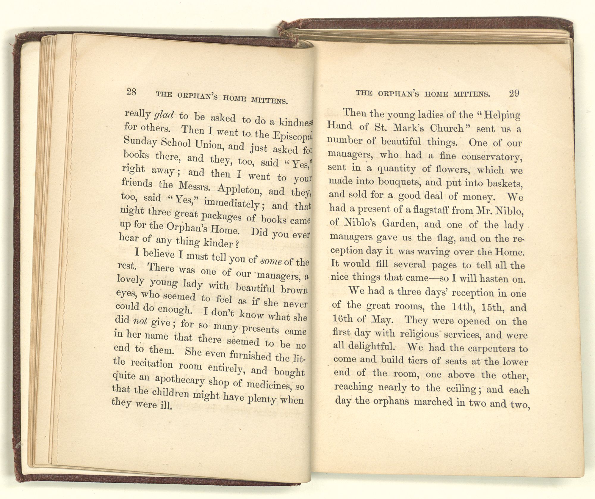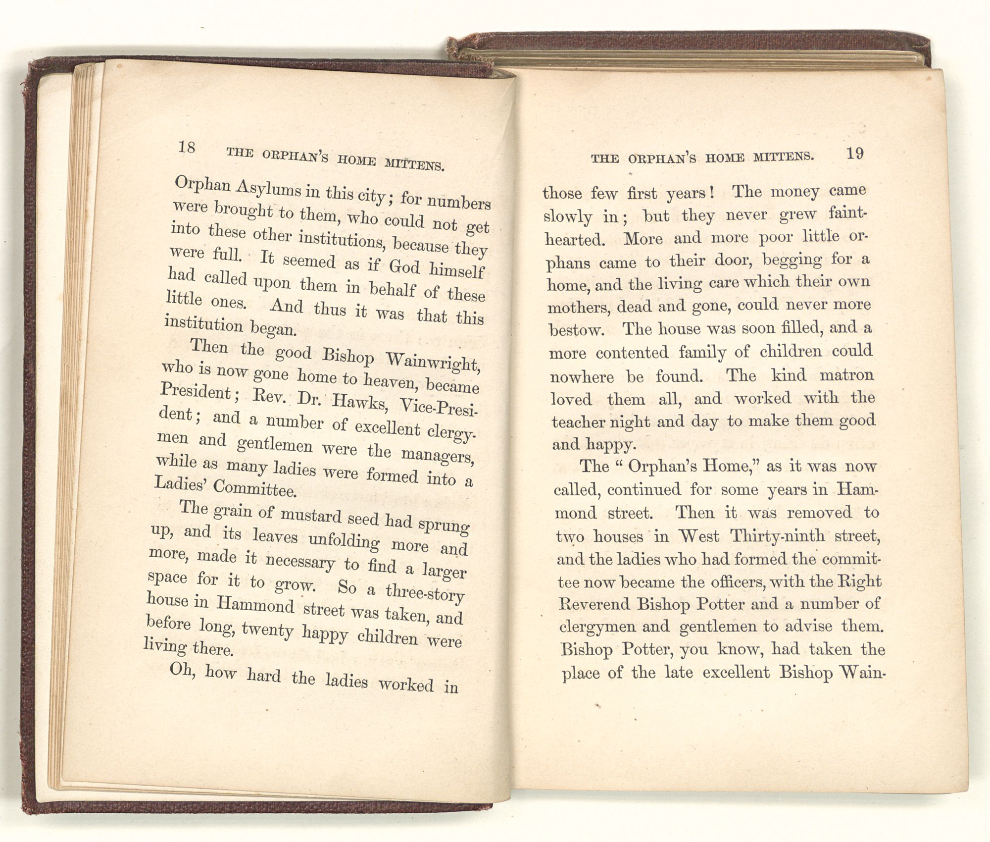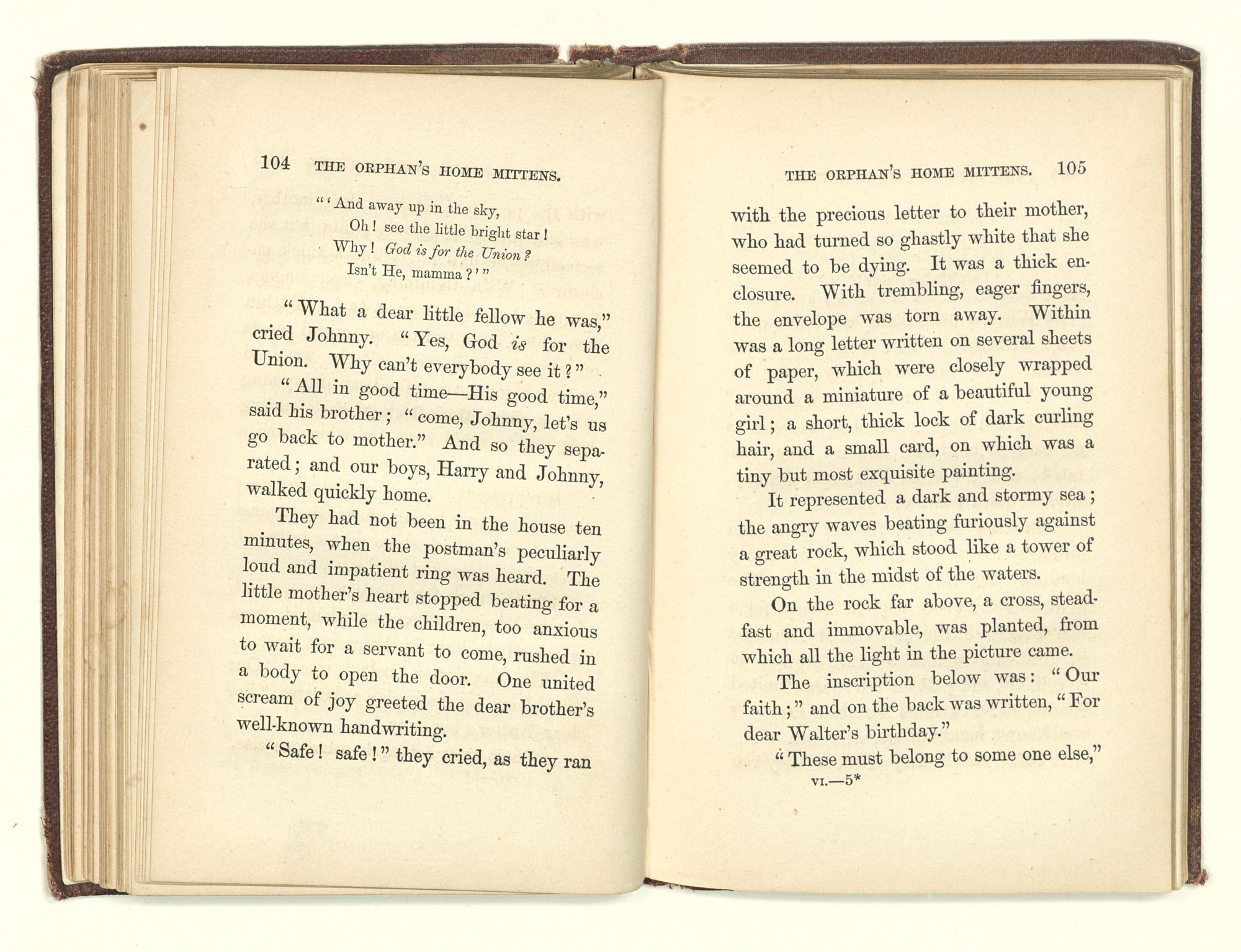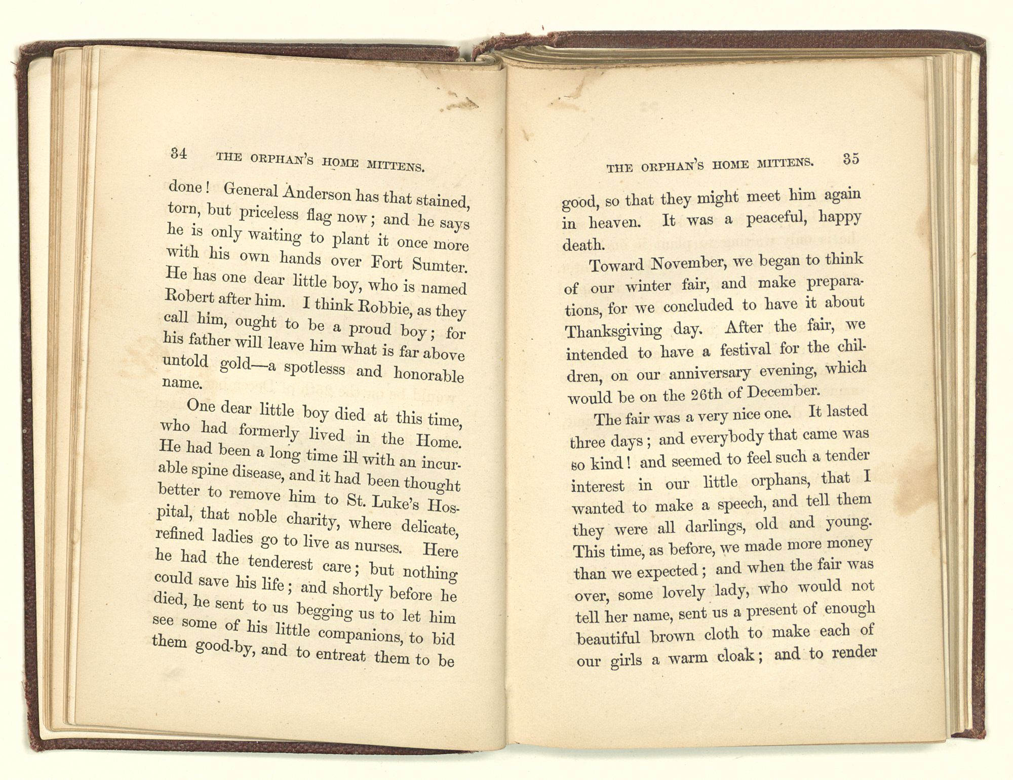 “Oh, yes, do! how long will it take you? We'll write to George that these mittens have listened, with their fingers and thumbs for ears, to your “Orphan's Home” story. They will be the most interesting mittens of all: more so, than those we got by our little play.”