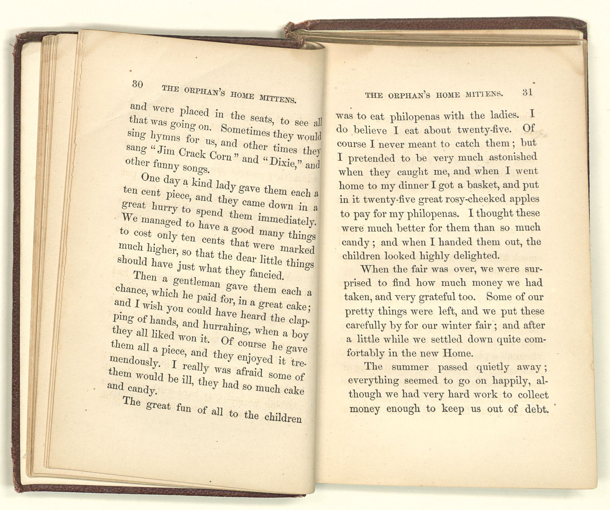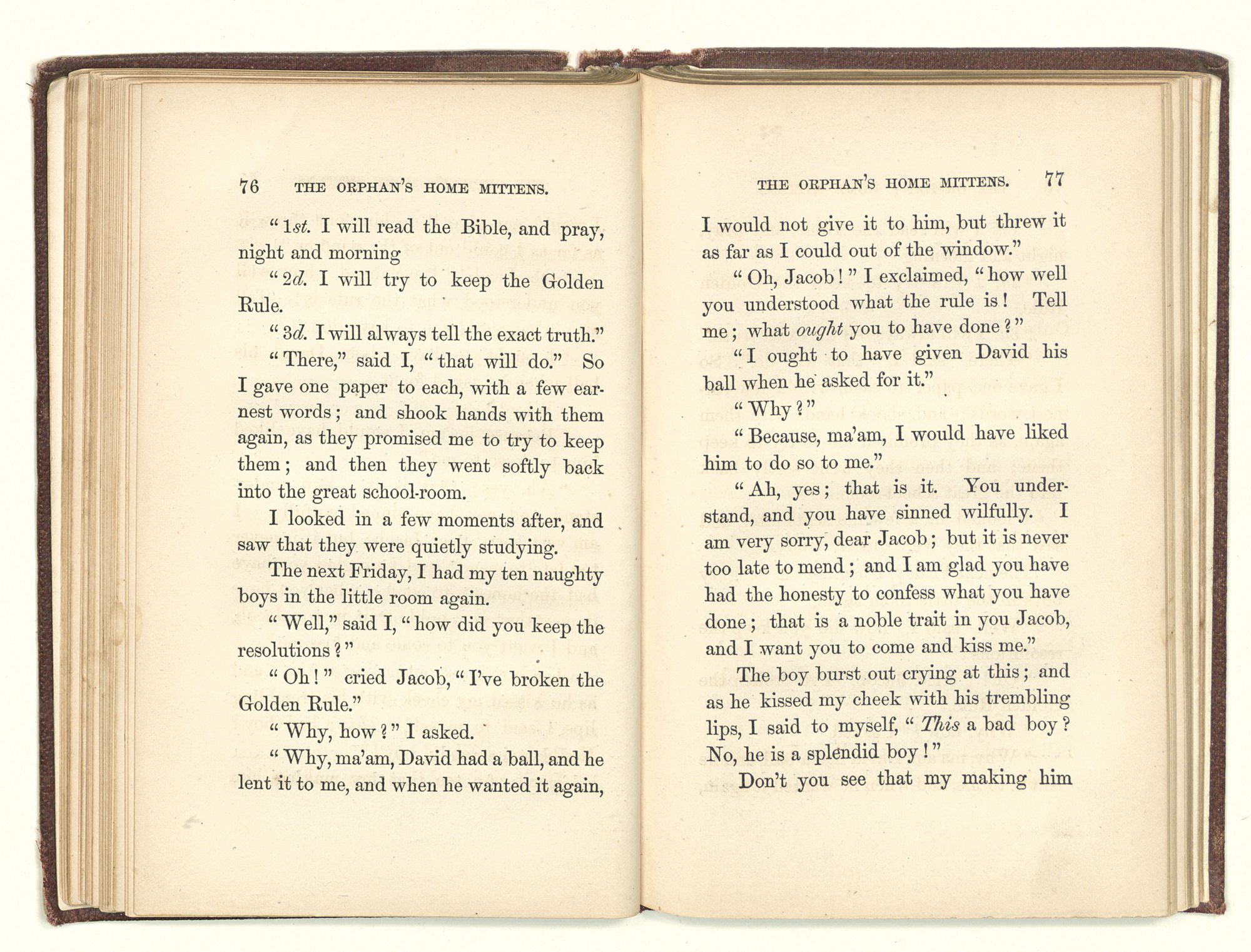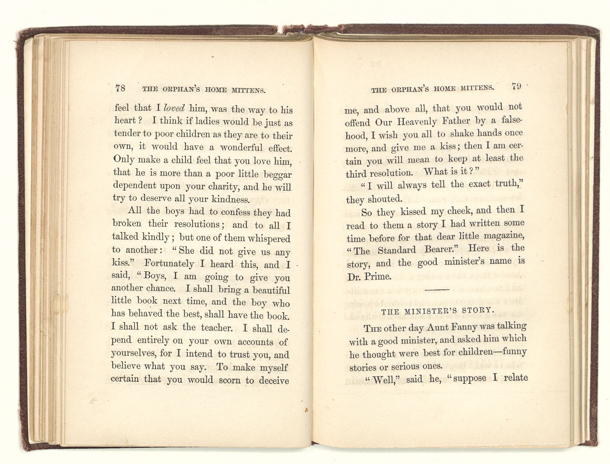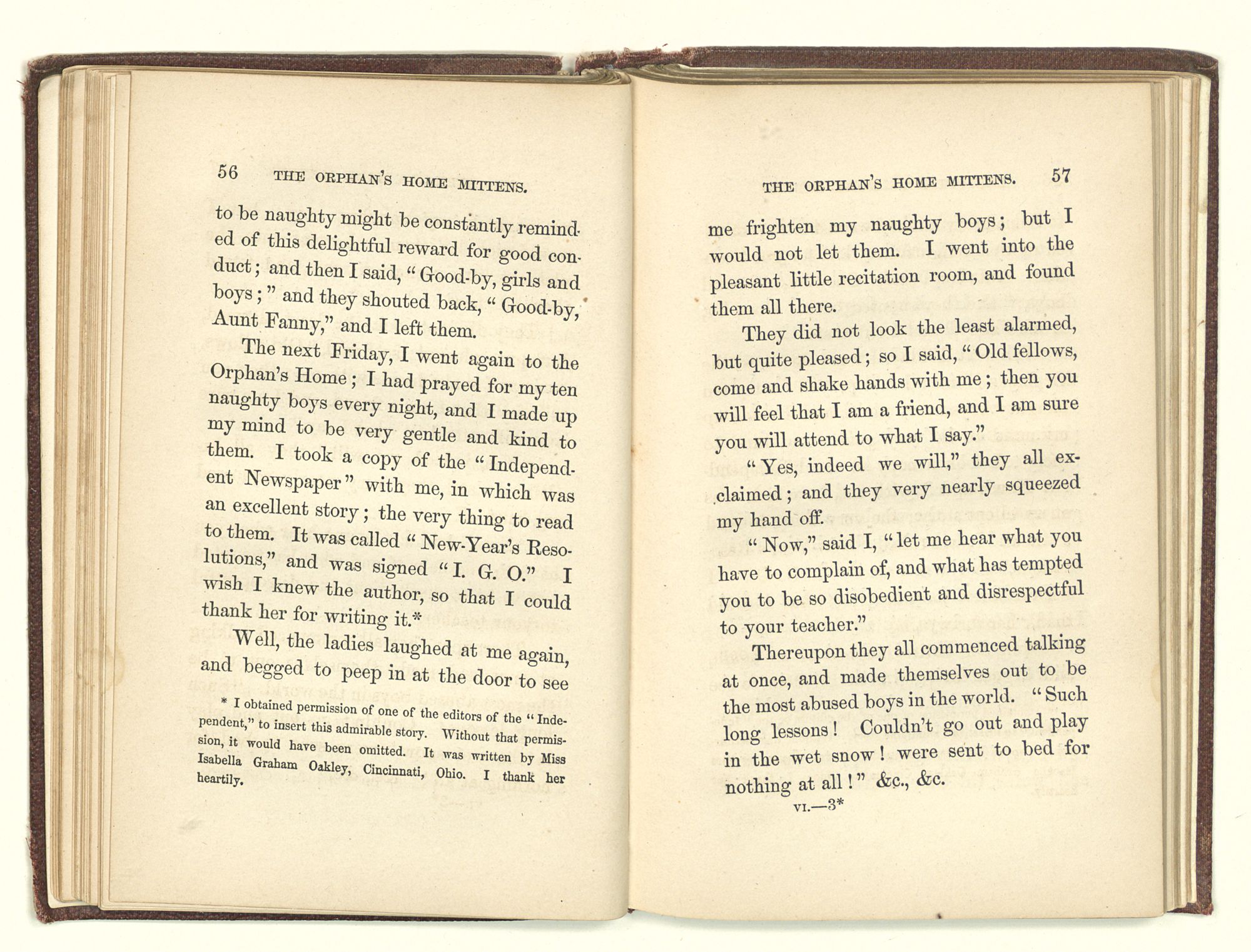 “Oh, yes, do! how long will it take you? We'll write to George that these mittens have listened, with their fingers and thumbs for ears, to your “Orphan's Home” story. They will be the most interesting mittens of all: more so, than those we got by our little play.”