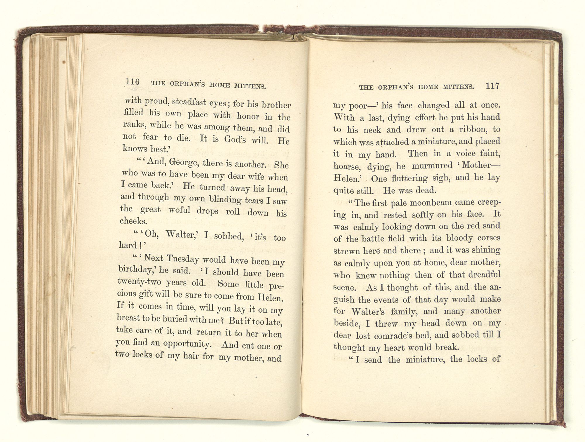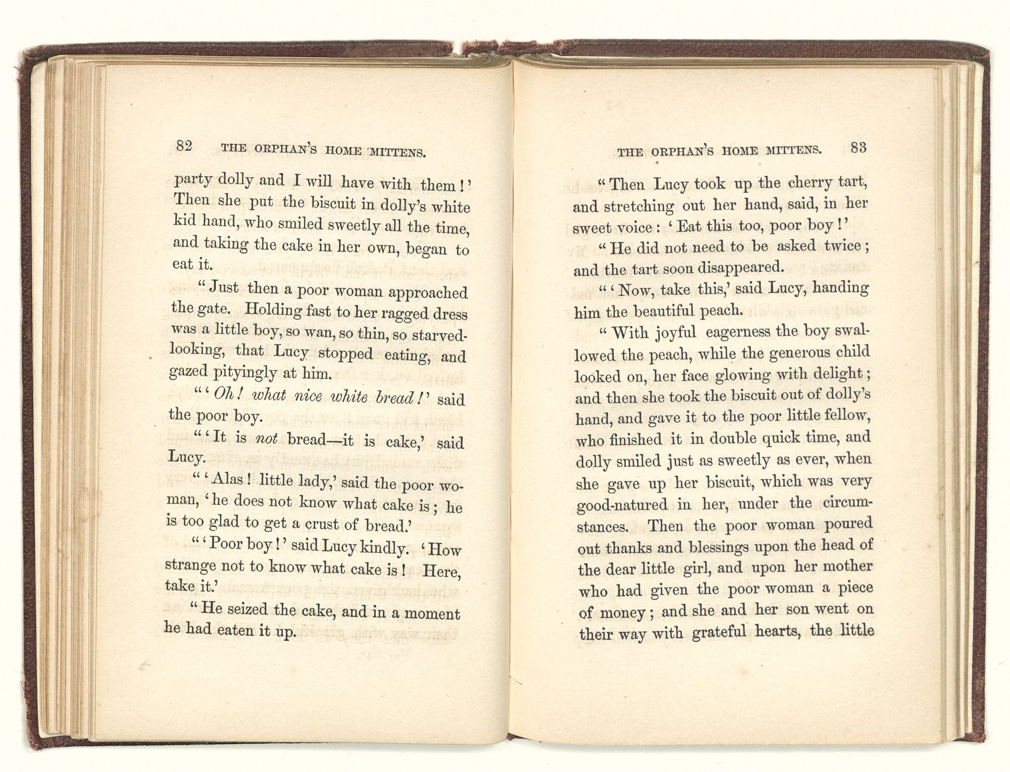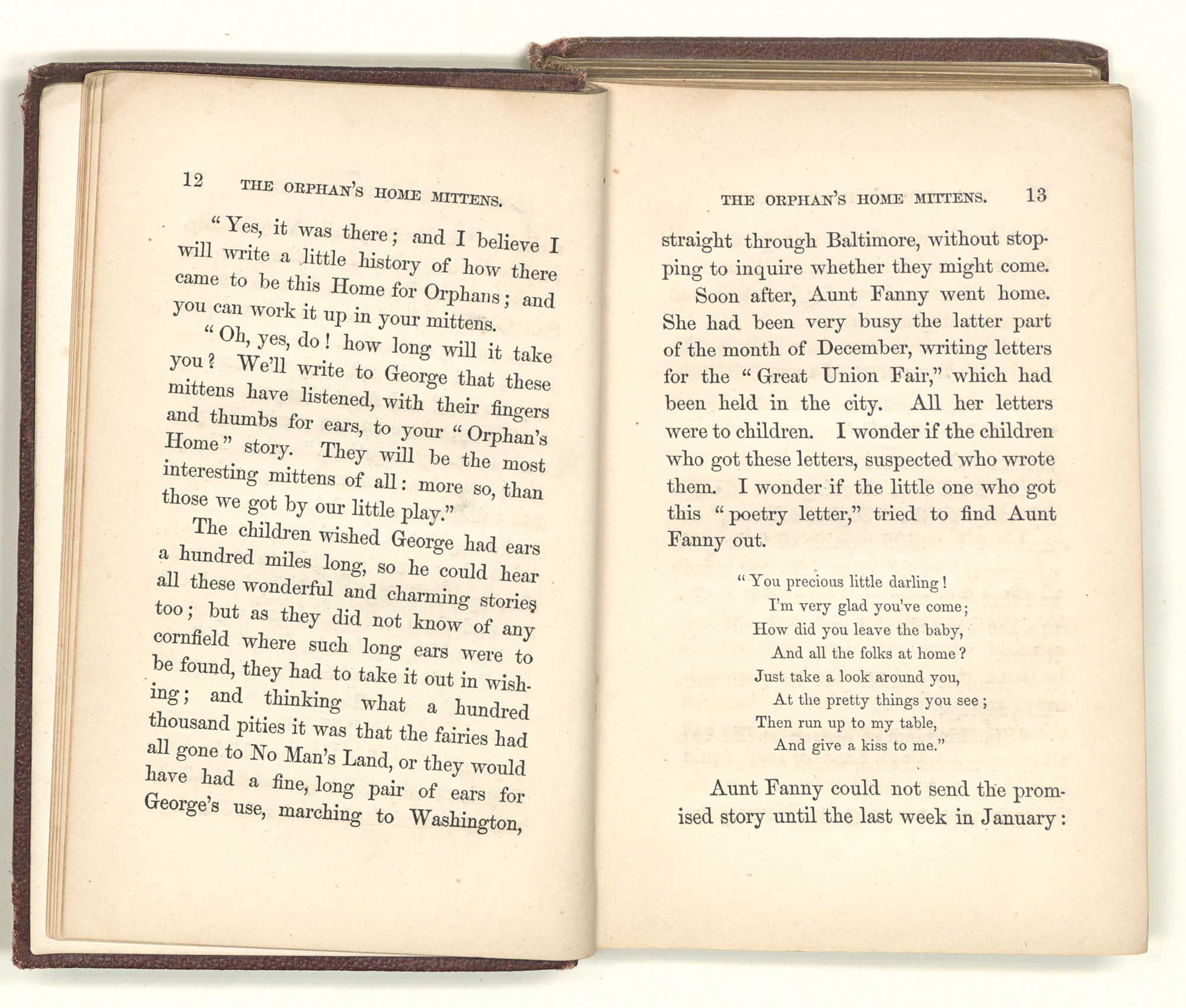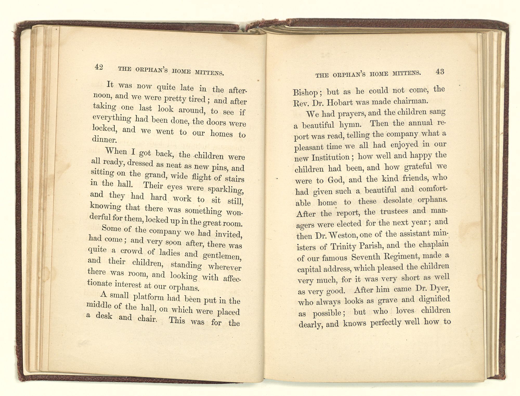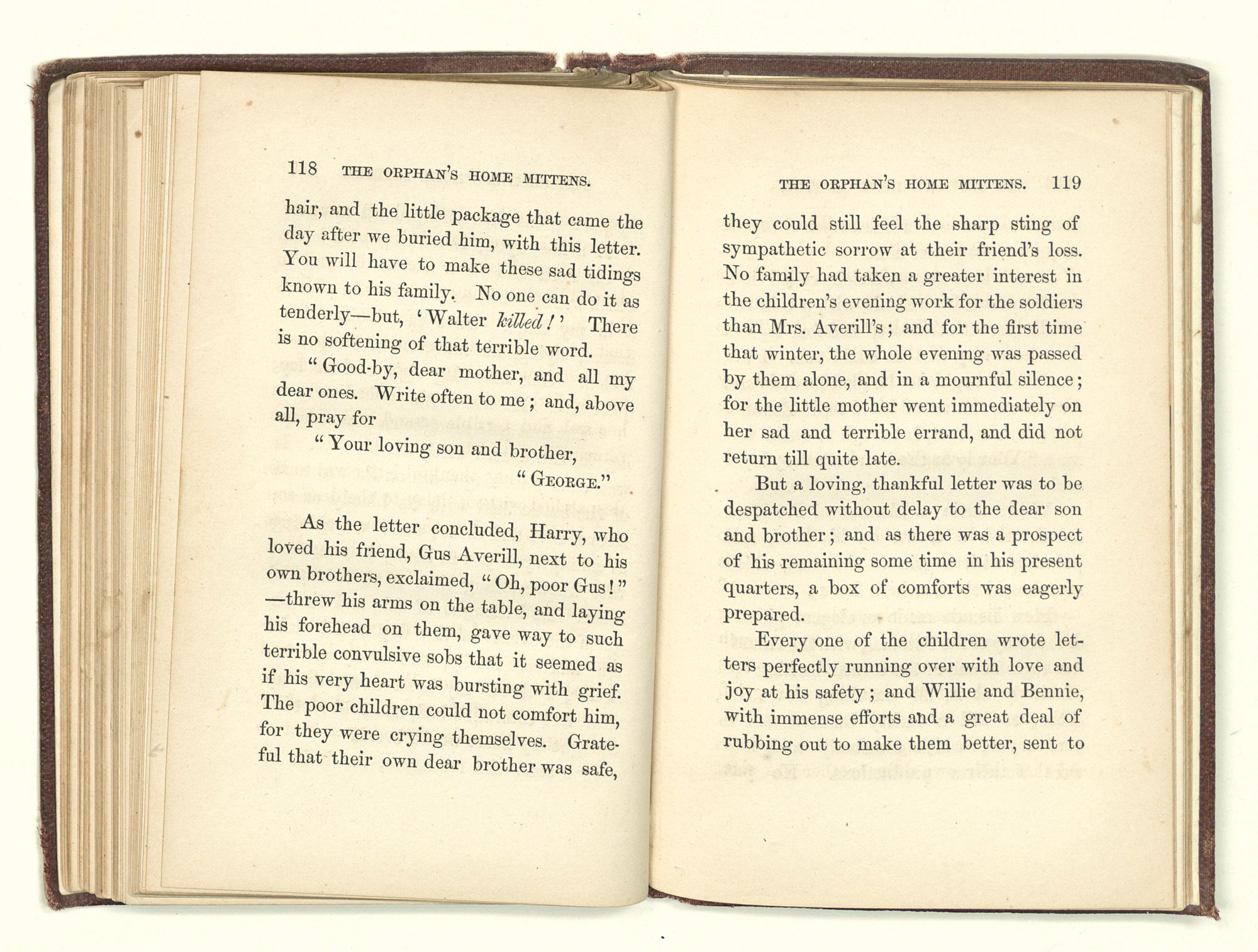 “Oh, yes, do! how long will it take you? We'll write to George that these mittens have listened, with their fingers and thumbs for ears, to your “Orphan's Home” story. They will be the most interesting mittens of all: more so, than those we got by our little play.”