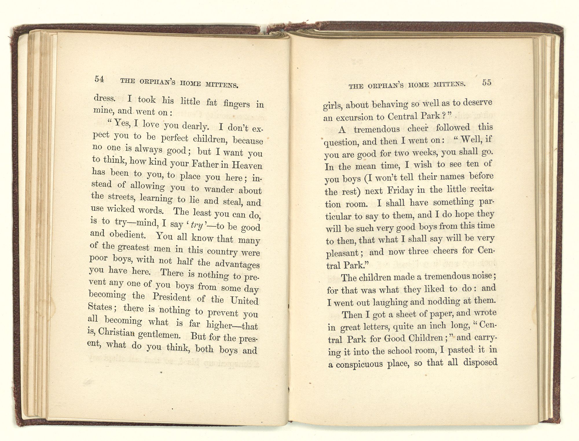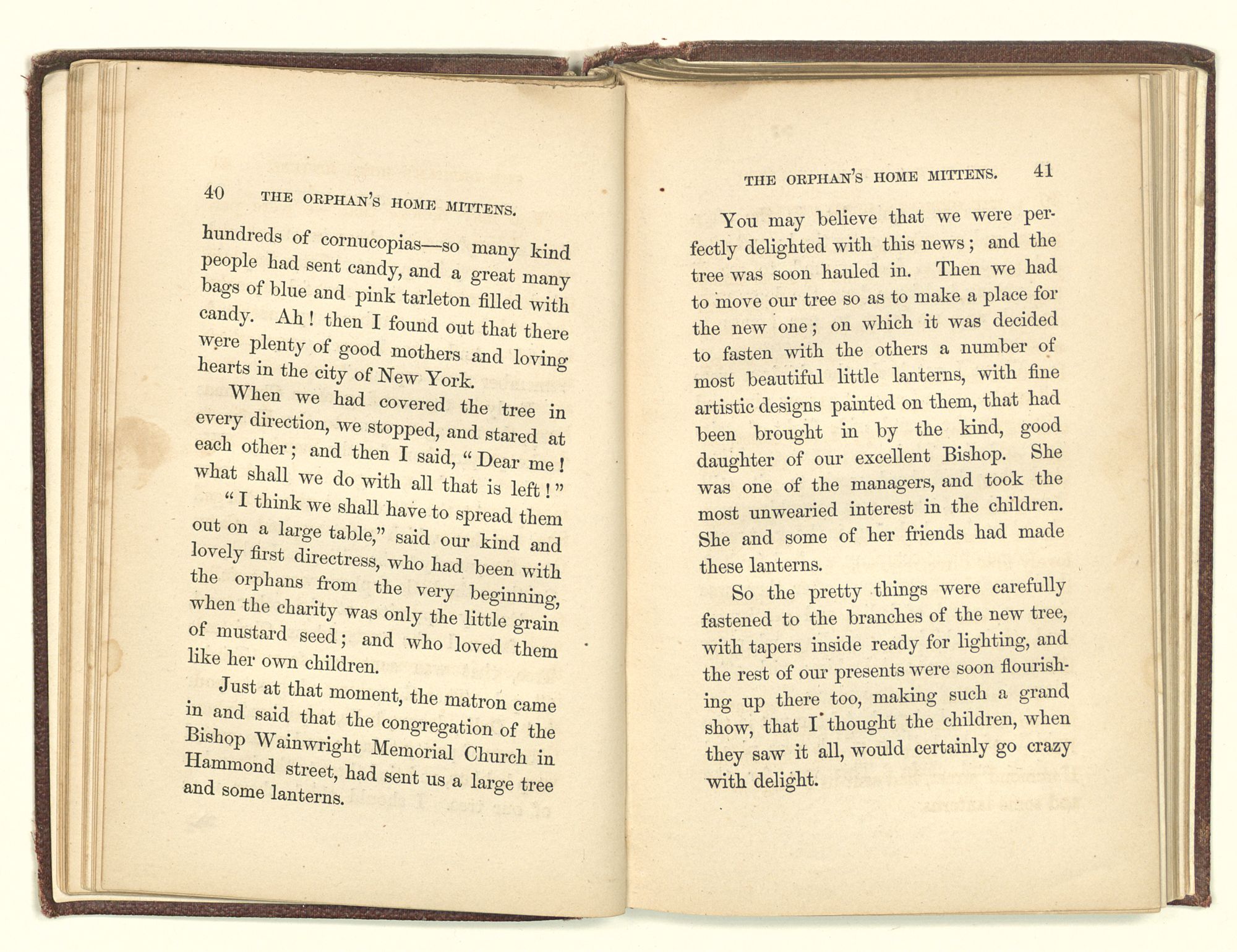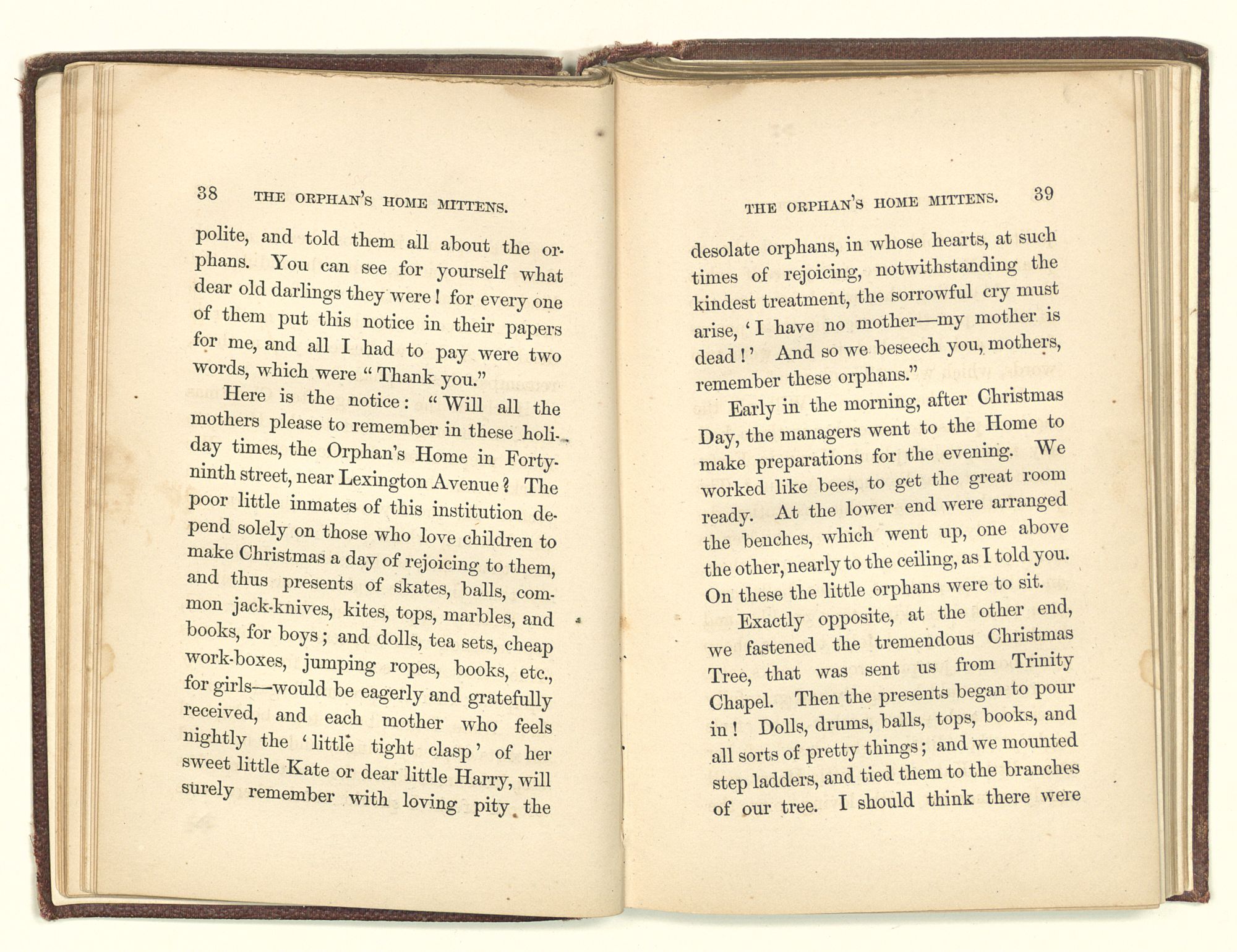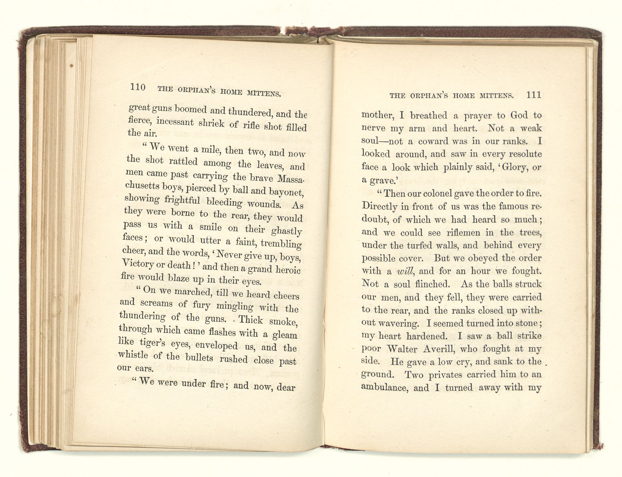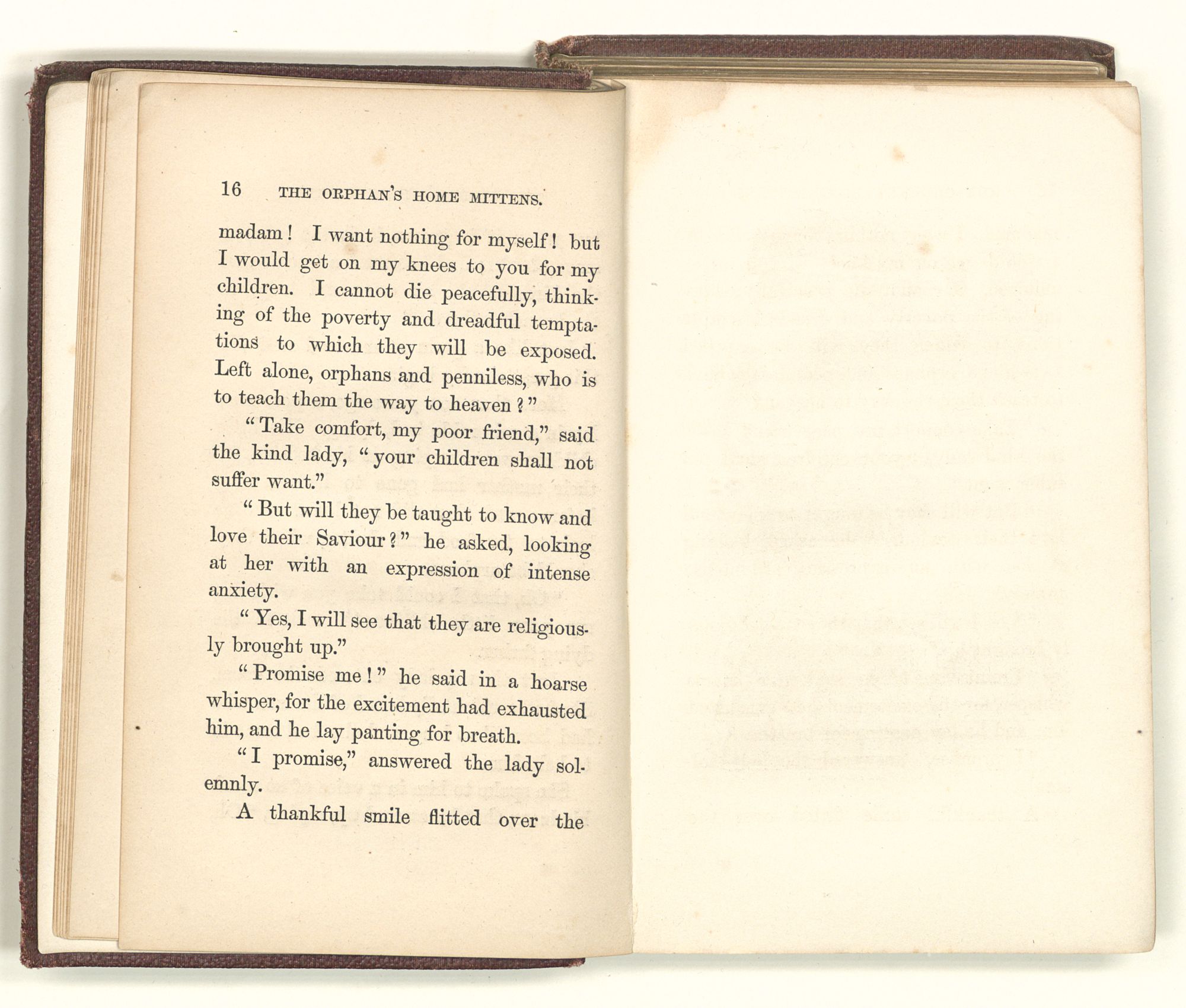 “Oh, yes, do! how long will it take you? We'll write to George that these mittens have listened, with their fingers and thumbs for ears, to your “Orphan's Home” story. They will be the most interesting mittens of all: more so, than those we got by our little play.”