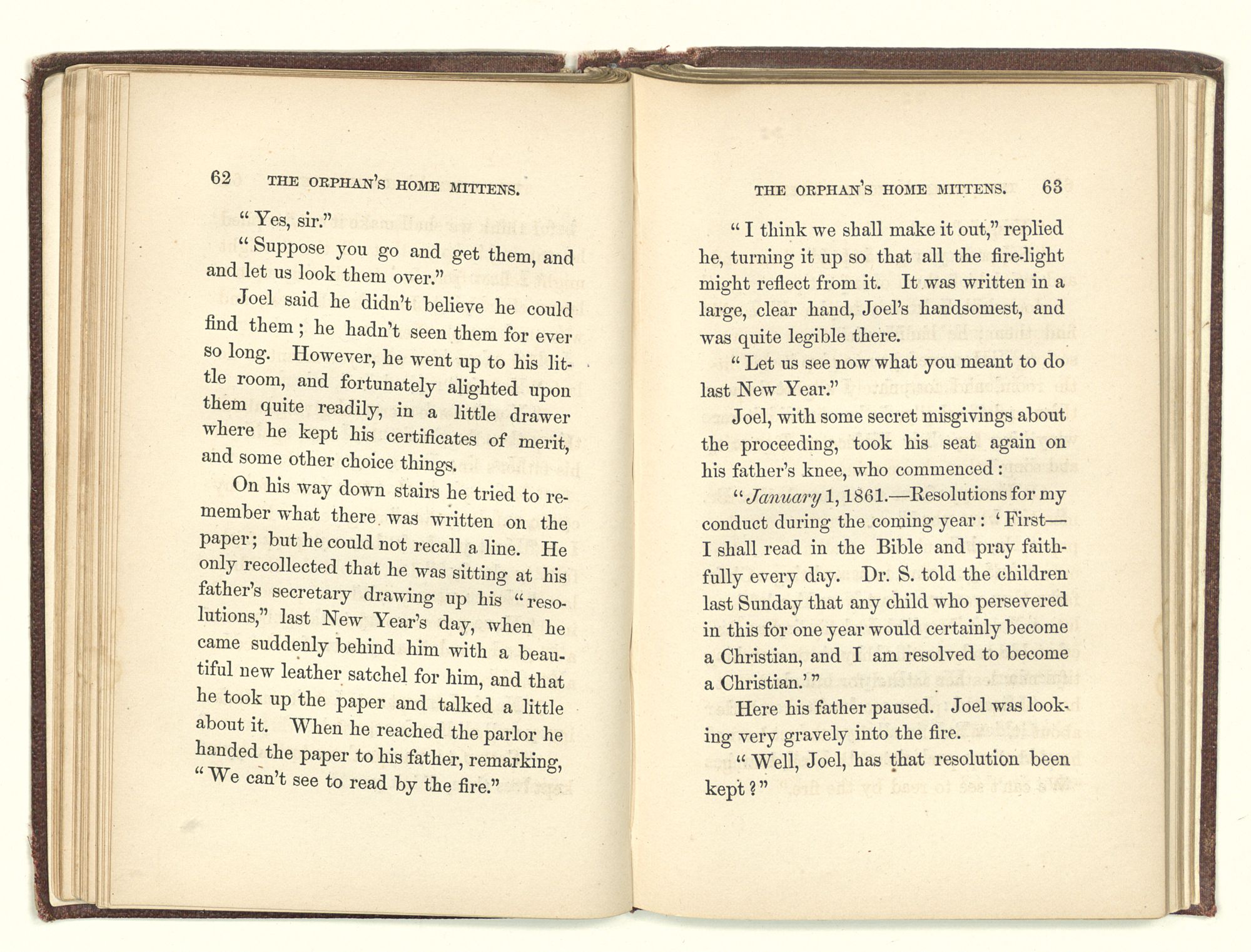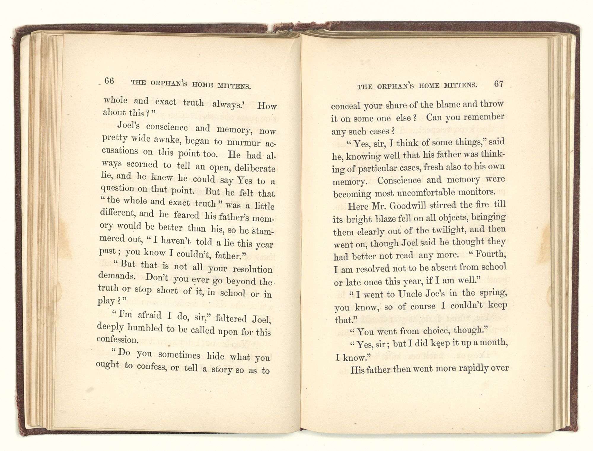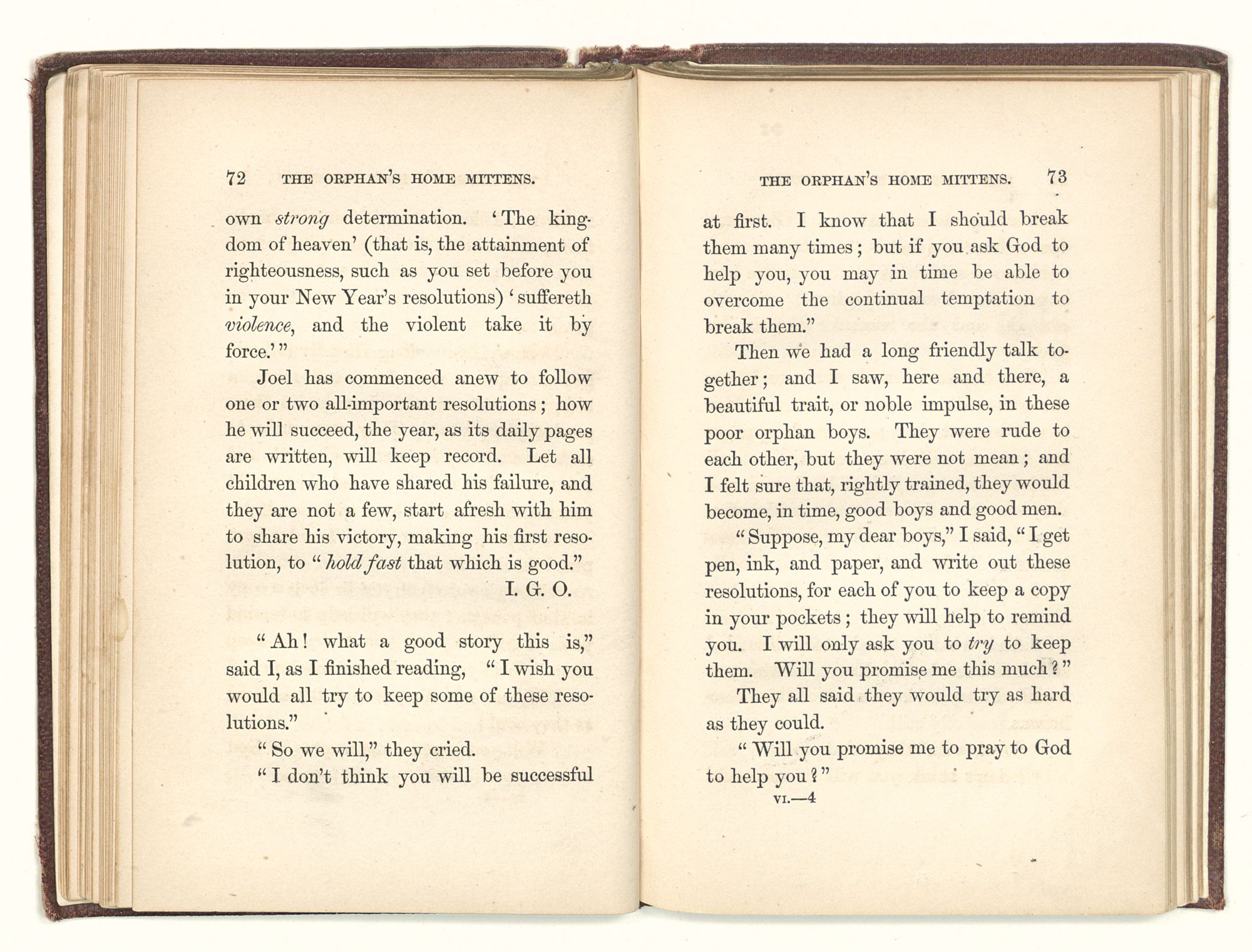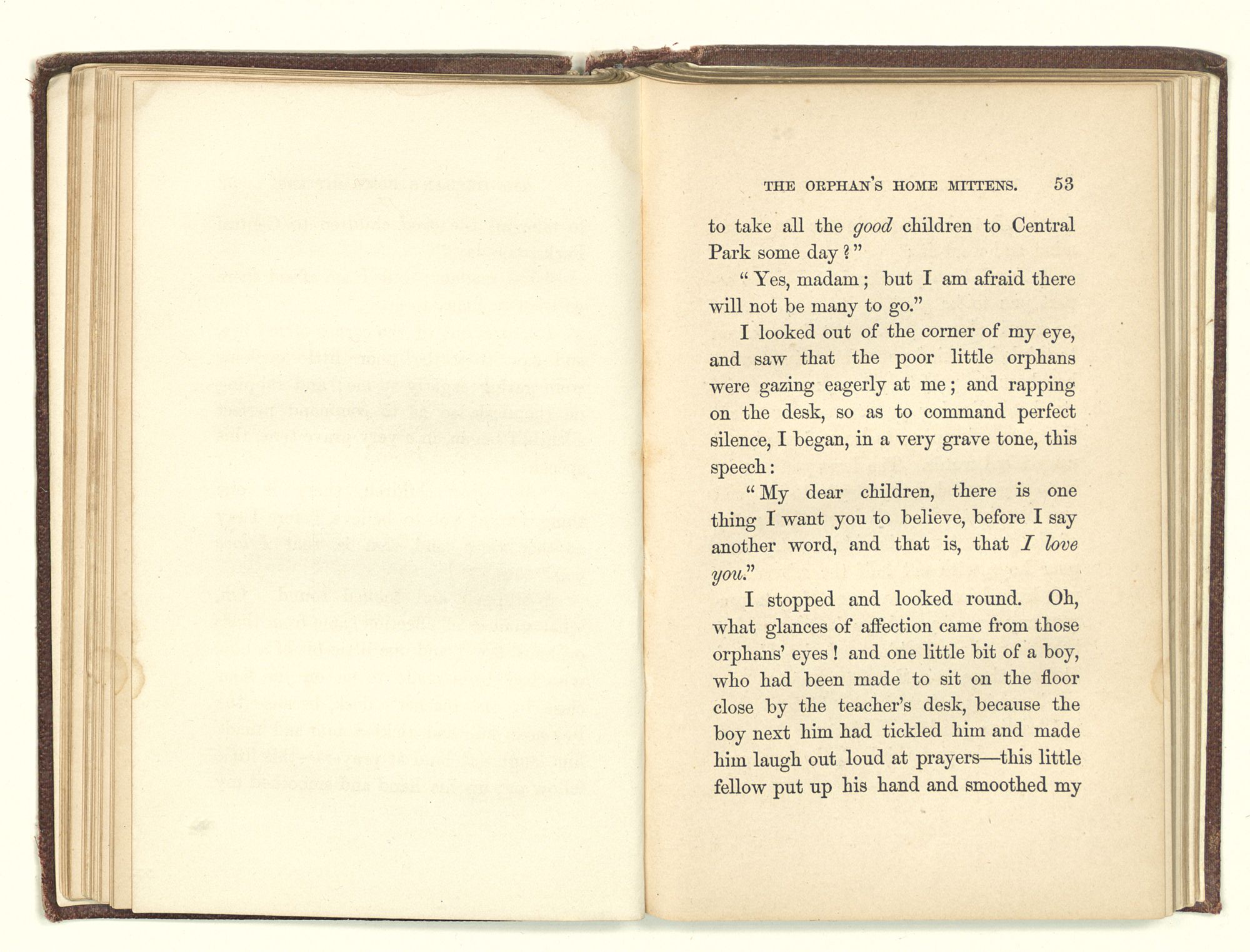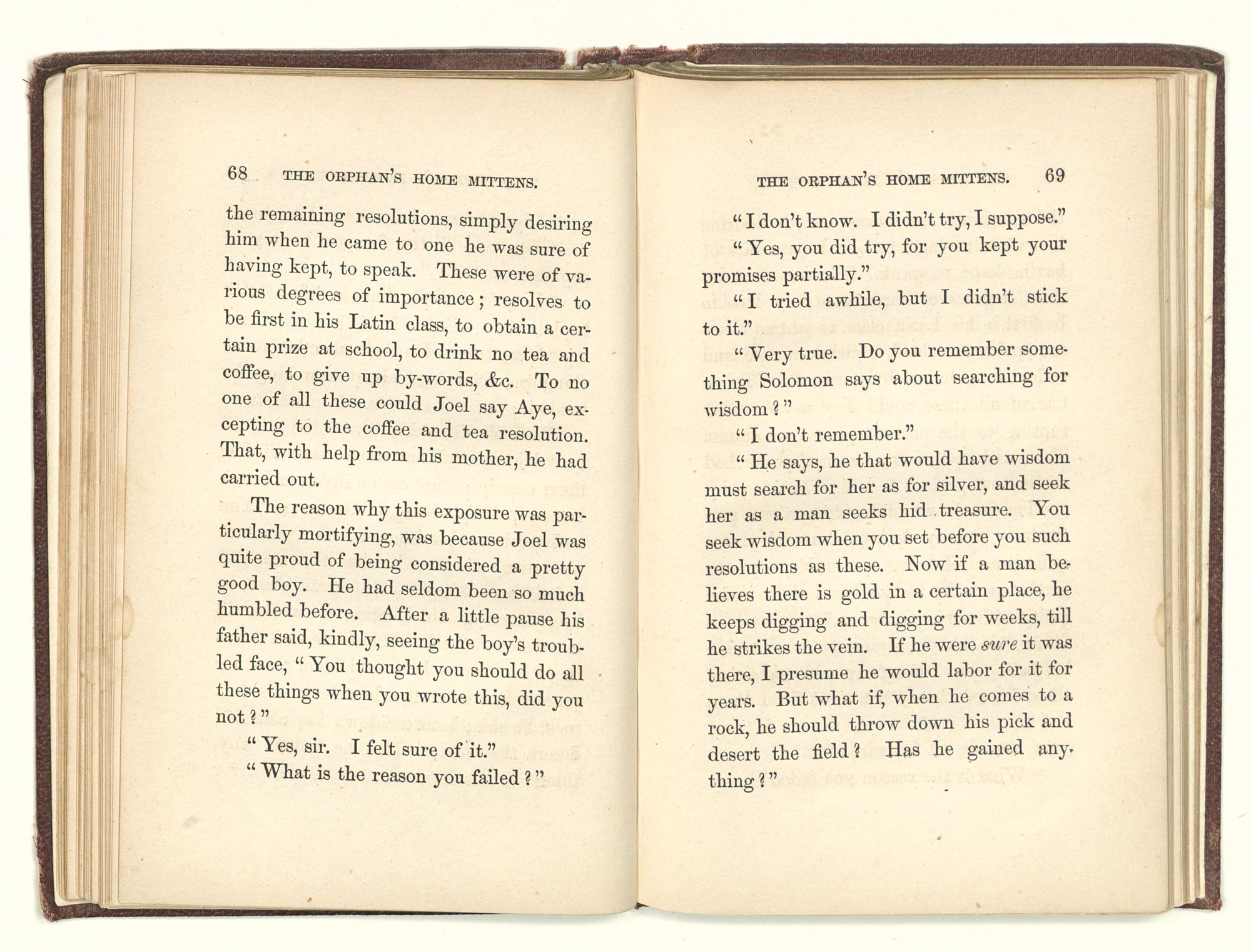 “Oh, yes, do! how long will it take you? We'll write to George that these mittens have listened, with their fingers and thumbs for ears, to your “Orphan's Home” story. They will be the most interesting mittens of all: more so, than those we got by our little play.”