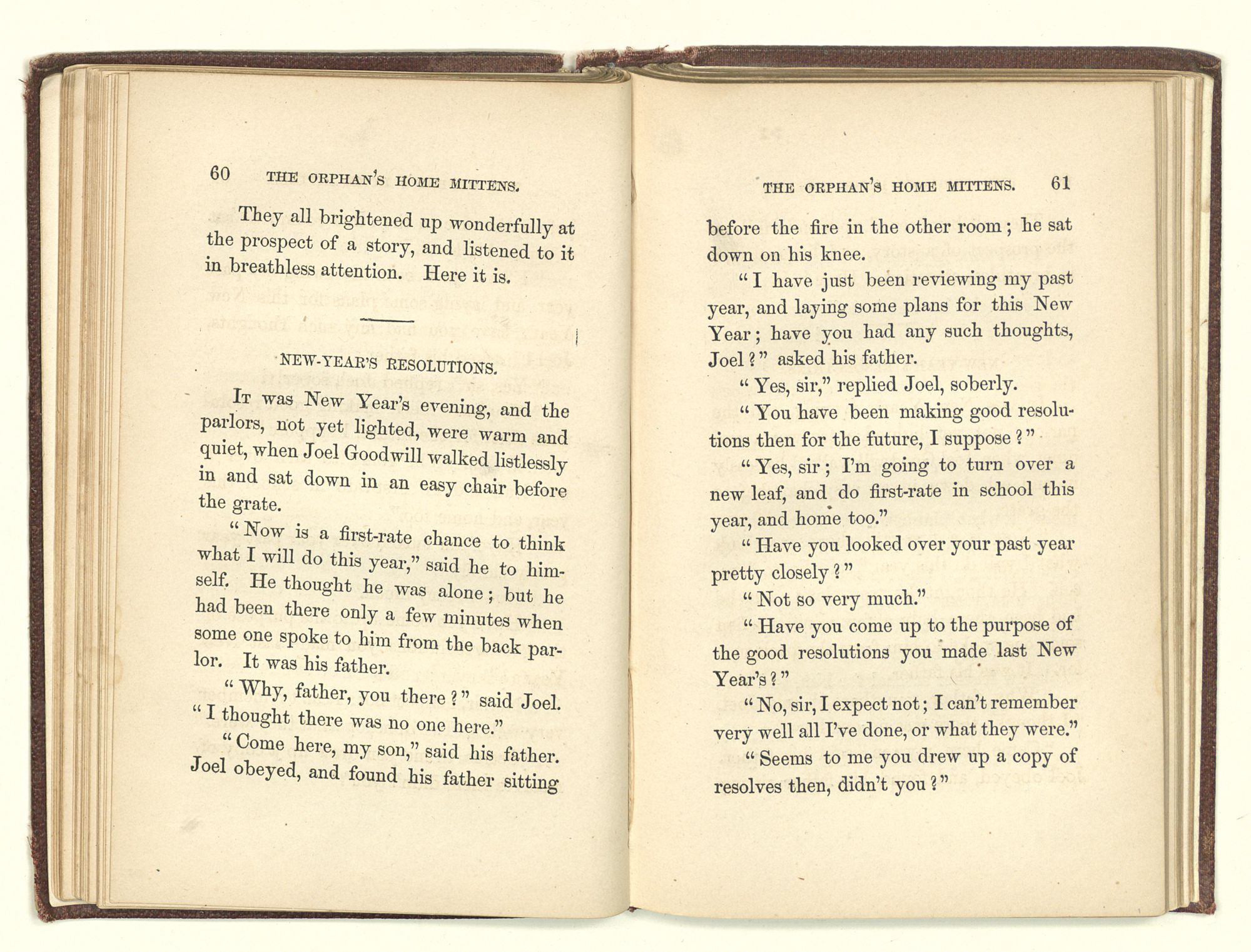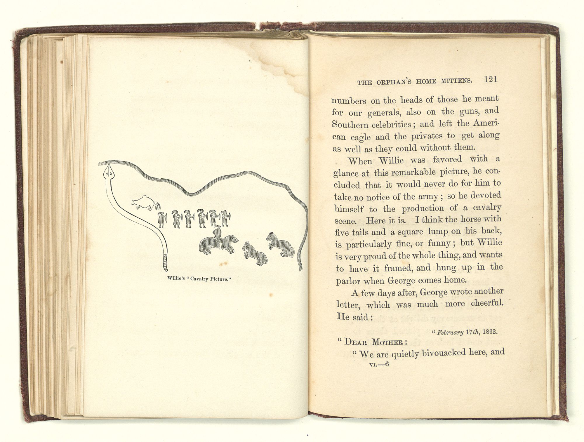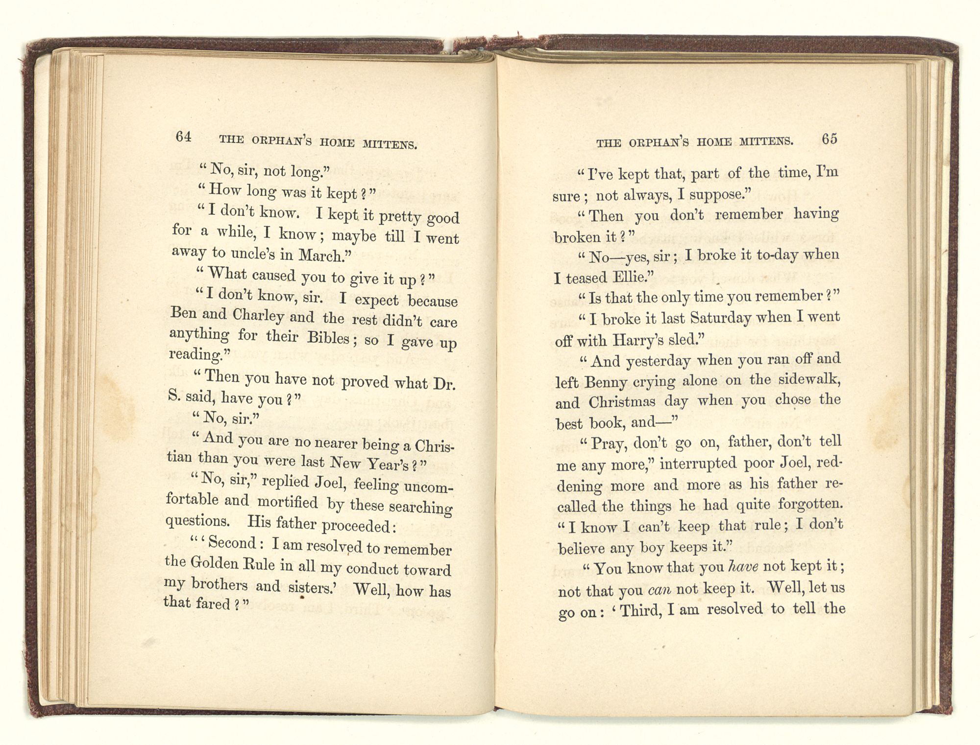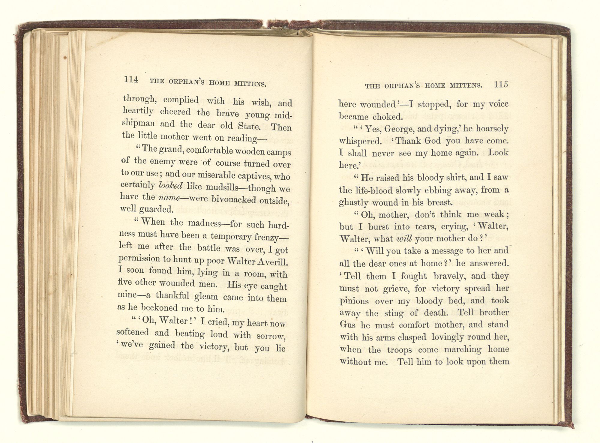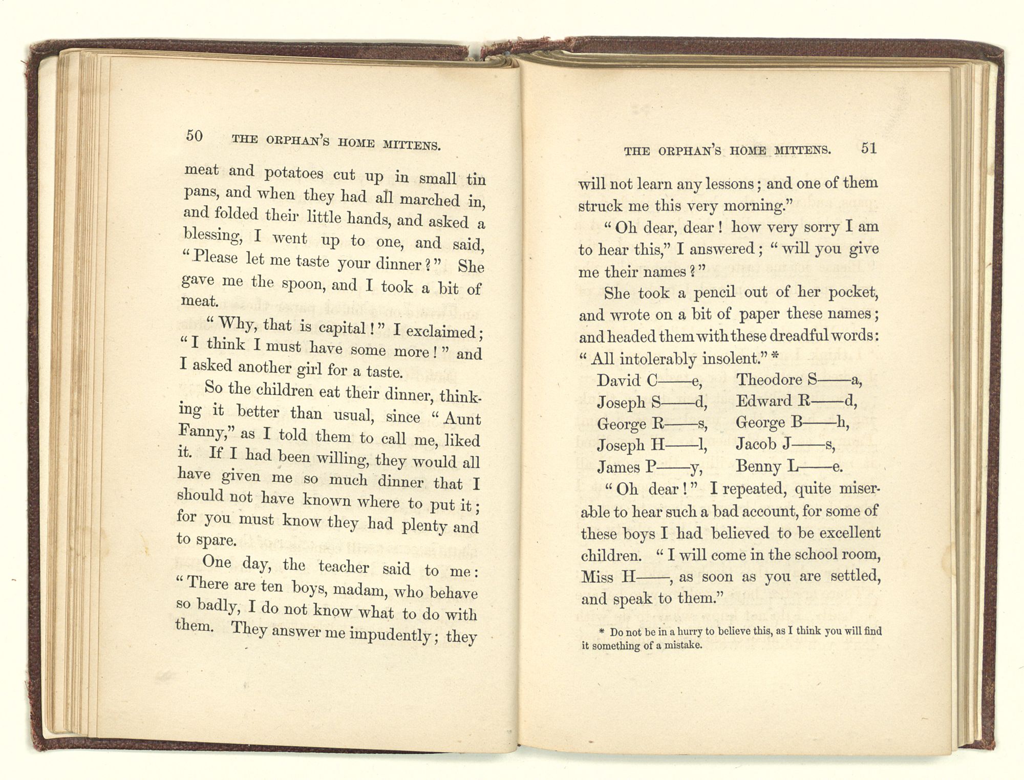 “Oh, yes, do! how long will it take you? We'll write to George that these mittens have listened, with their fingers and thumbs for ears, to your “Orphan's Home” story. They will be the most interesting mittens of all: more so, than those we got by our little play.”