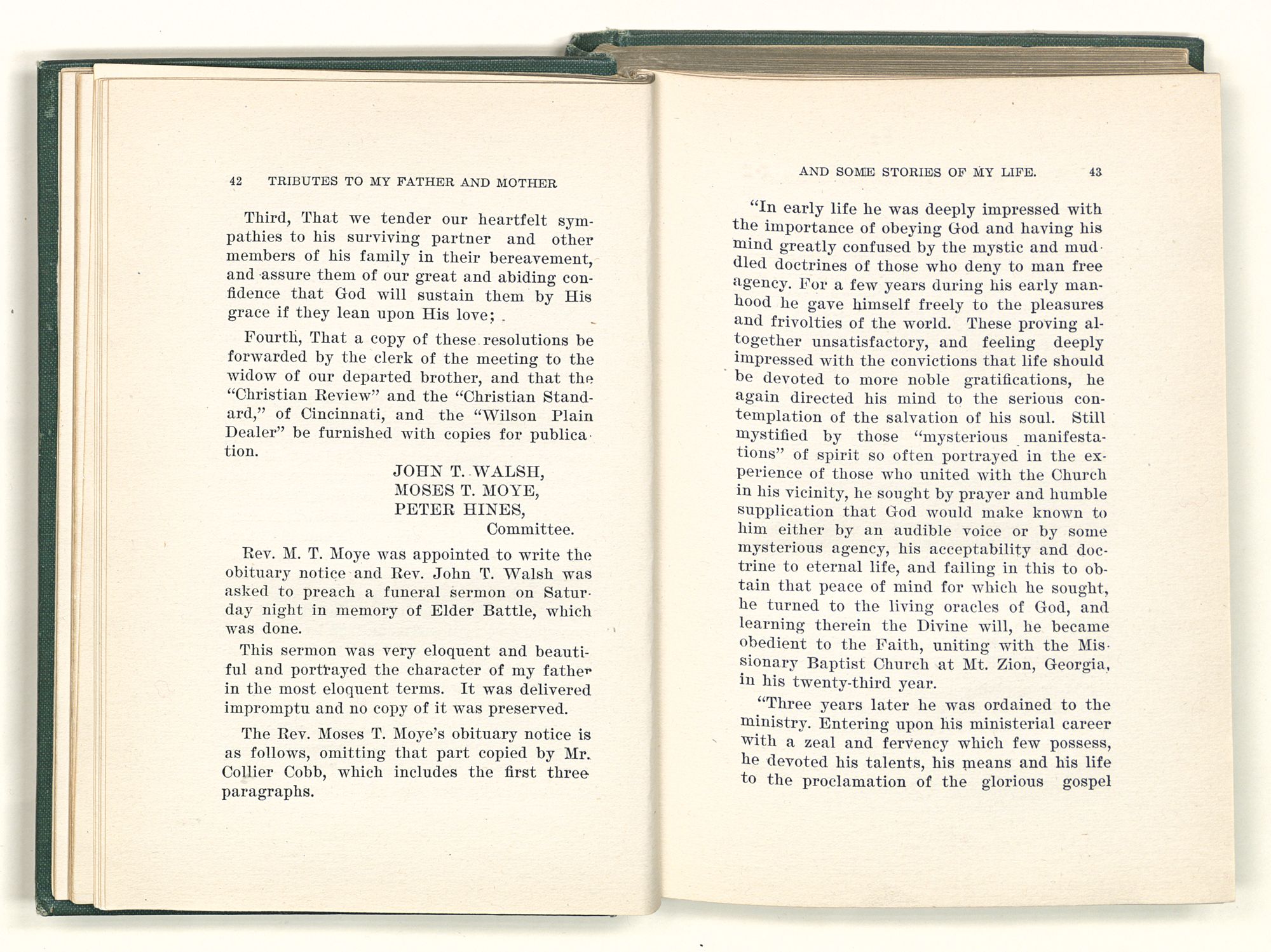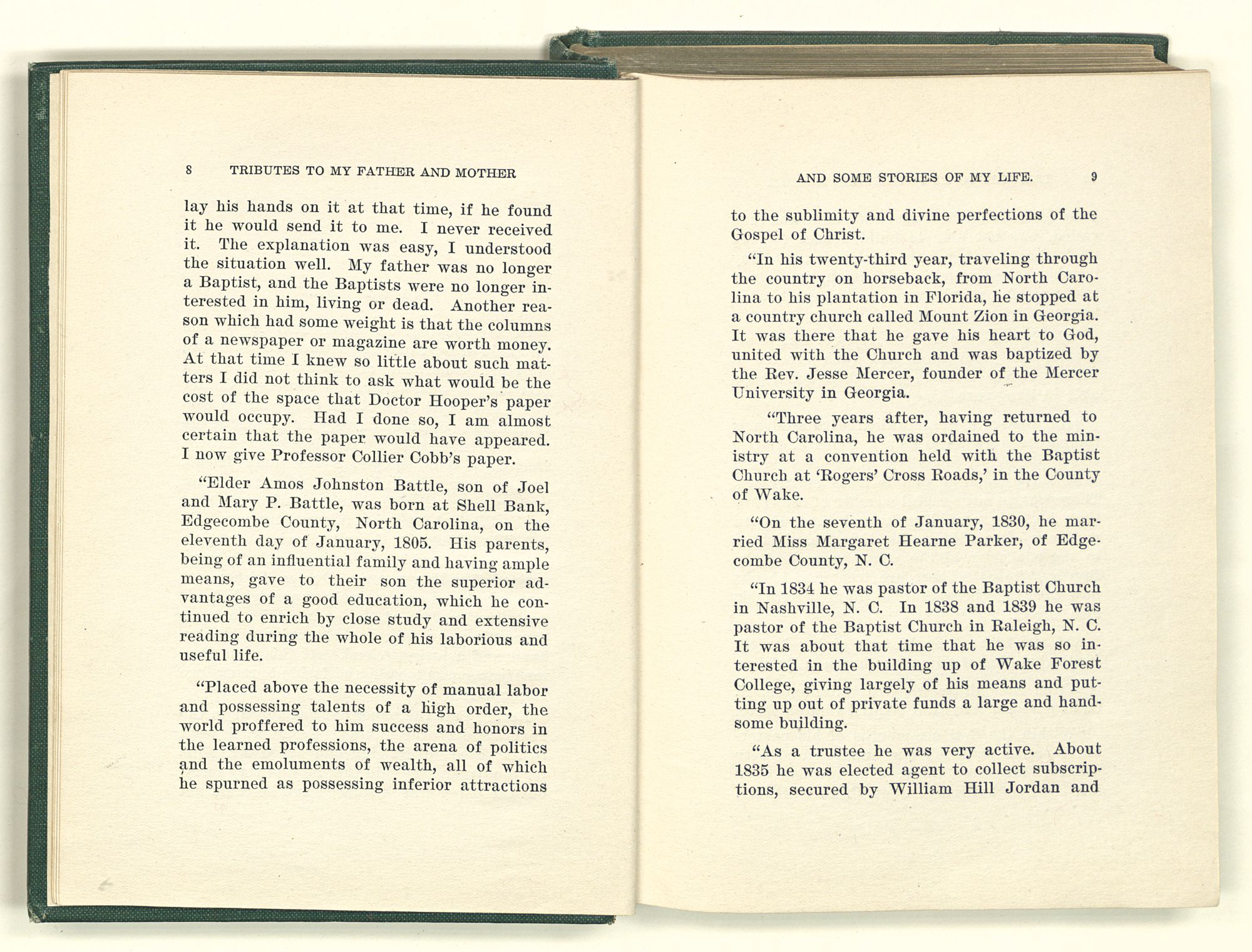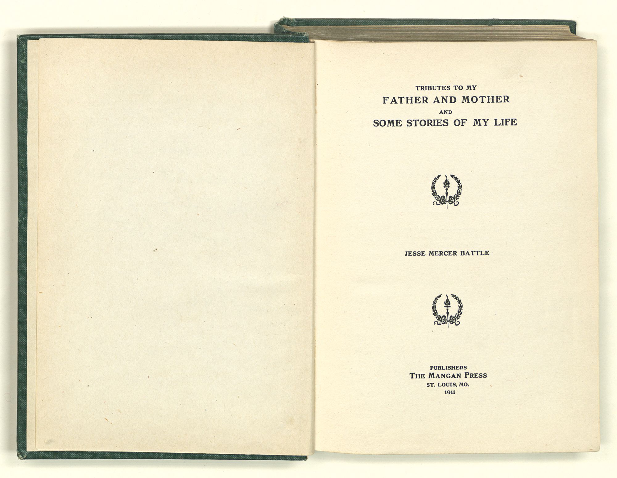 Tributes to my father and mother and some stories of my life / Jesse Mercer Battle. St. Louis, Mo. Mangan Press, 1911. 230 p. ;20 cm.