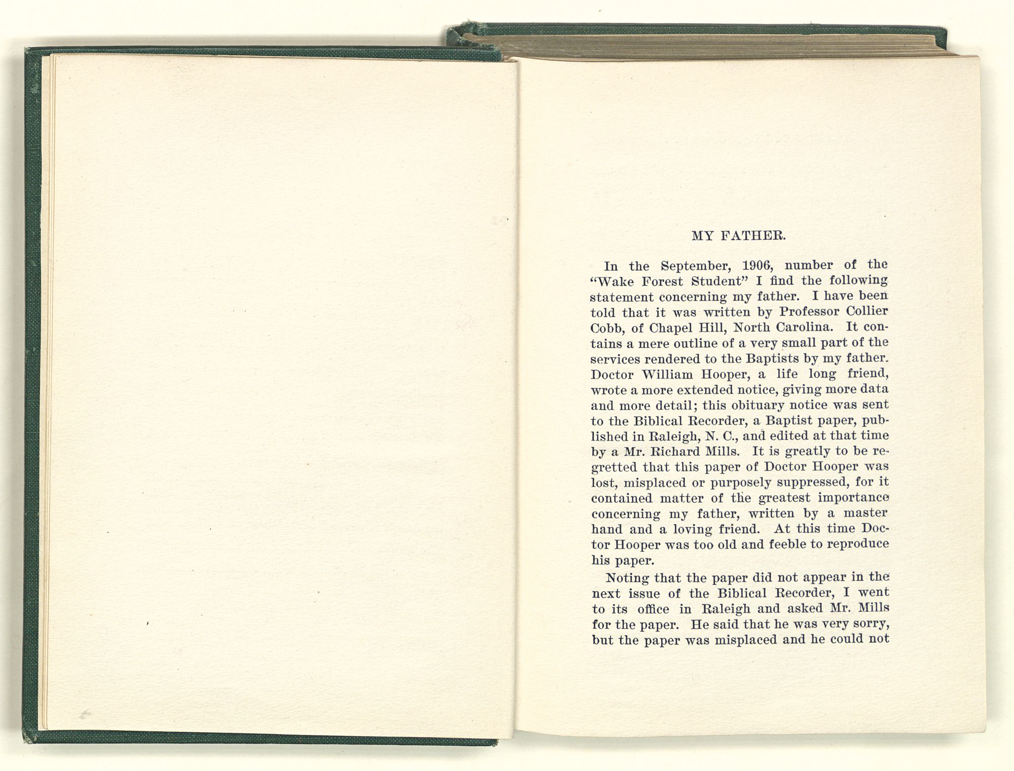 In the September, 1906, number of the “Wake Forest Student” I find the following statement concerning my father. I have been told that it was written by Professor Collier Cobb, of Chapel Hill, North Carolina. It contains a mere outline of a very small part of the services rendered to the Baptists by my father. Doctor William Hooper, a life long friend, wrote a more extended notice, giving more data and more detail; this obituary notice was sent to the Biblical Recorder, a Baptist paper, published in Raleigh, N. C., and edited at that time by a Mr. Richard Mills. It is greatly to be regretted that this paper of Doctor Hooper was lost, misplaced or purposely suppressed, for it contained matter of the greatest importance concerning my father, written by a master hand and a loving friend. At this time Doctor Hooper was too old and feeble to reproduce his paper.
