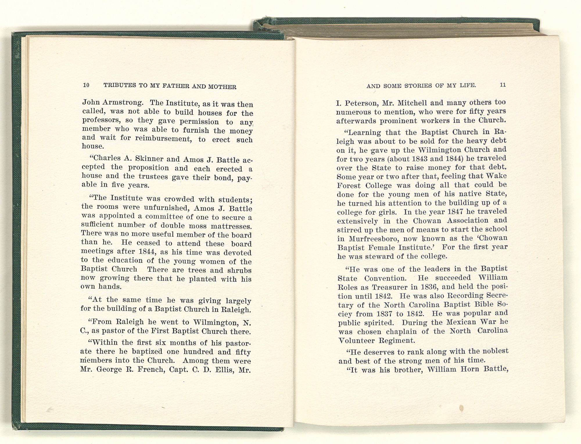 “The Institute was crowded with students; the rooms were unfurnished, Amos J. Battle was appointed a committee of one to secure a sufficient number of double moss mattresses. There was no more useful member of the board than he. He ceased to attend these board meetings after 1844, as his time was devoted to the education of the young women of the Baptist Church There are trees and shrubs now growing there that he planted with his own hands.