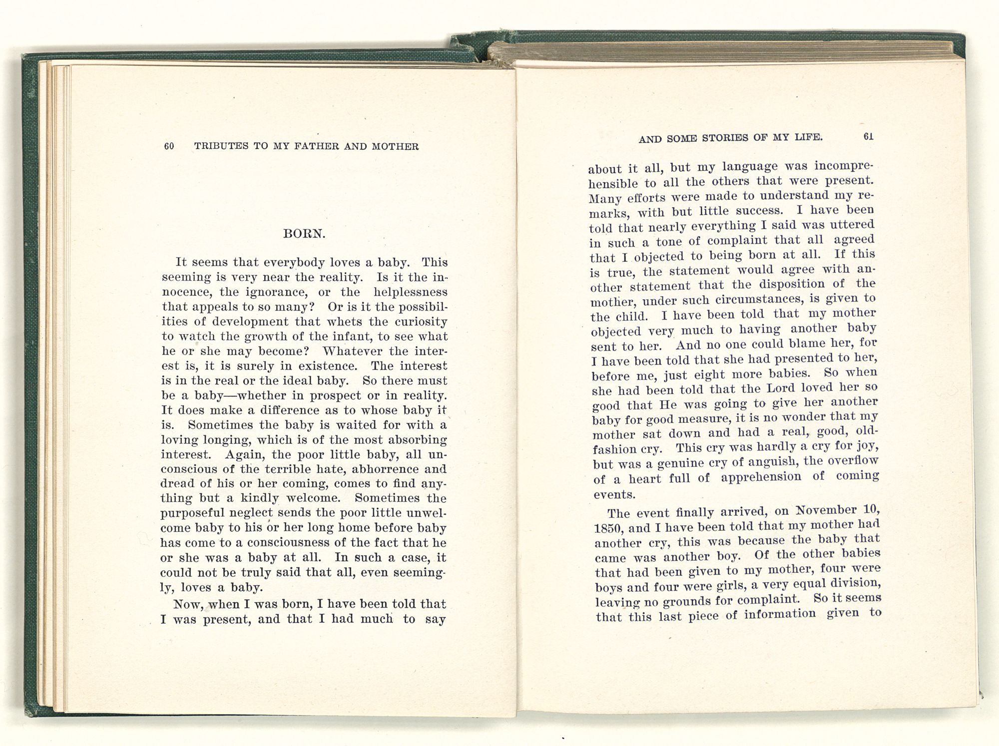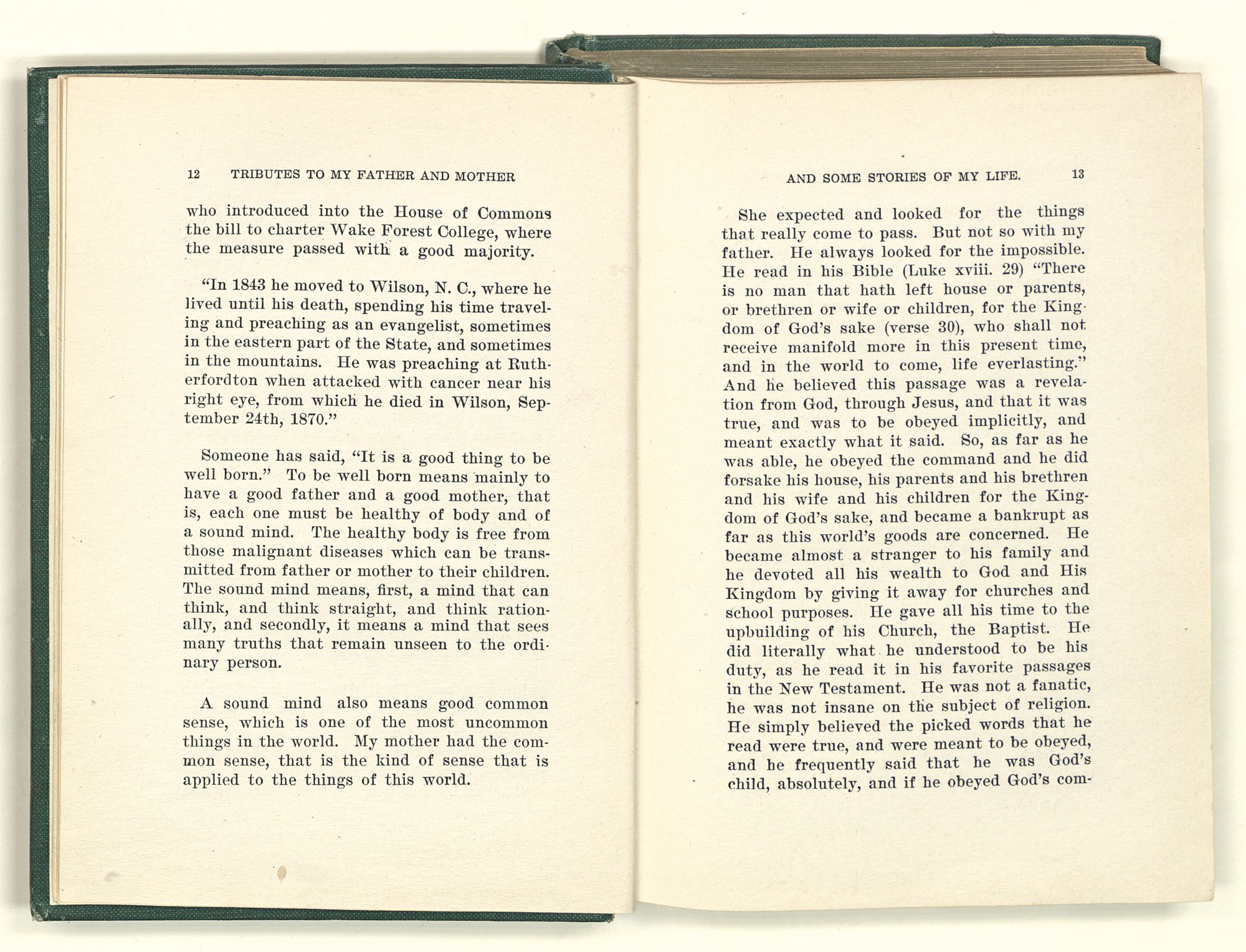 She expected and looked for the things that really come to pass. But not so with my father. He always looked for the impossible. He read in his Bible (Luke xviii. 29) “There is no man that hath left house or parents, or brethren or wife or children, for the Kingdom of God's sake (verse 30), who shall not receive manifold more in this present time, and in the world to come, life everlasting.” And he believed this passage was a revelation from God, through Jesus, and that it was true, and was to be obeyed implicitly, and meant exactly what it said. So, as far as he was able, he obeyed the command and he did forsake his house, his parents and his brethren and his wife and his children for the Kingdom of God's sake, and became a bankrupt as far as this world's goods are concerned. He became almost a stranger to his family and he devoted all his wealth to God and His Kingdom by giving it away for churches and school purposes. He gave all his time to the upbuilding of his Church, the Baptist. He did literally what he understood to be his duty, as he read it in his favorite passages in the New Testament. He was not a fanatic, he was not insane on the subject of religion. He simply believed the picked words that he read were true, and were meant to be obeyed, and he frequently said that he was God's child, absolutely, and if he obeyed God's commandments