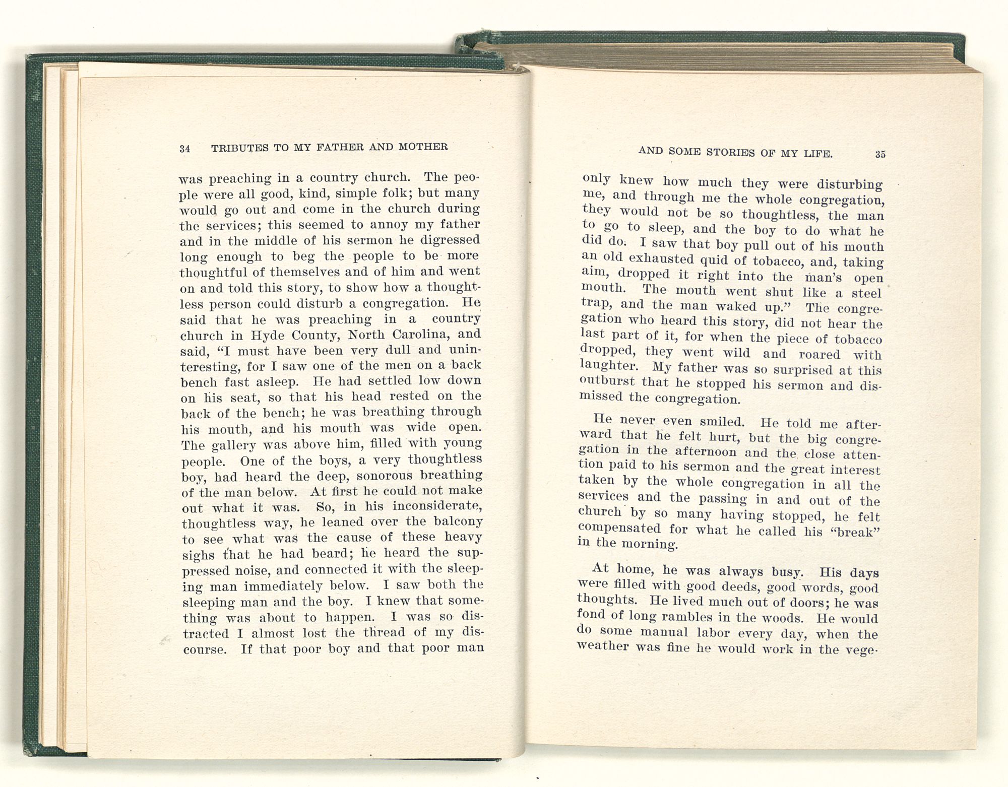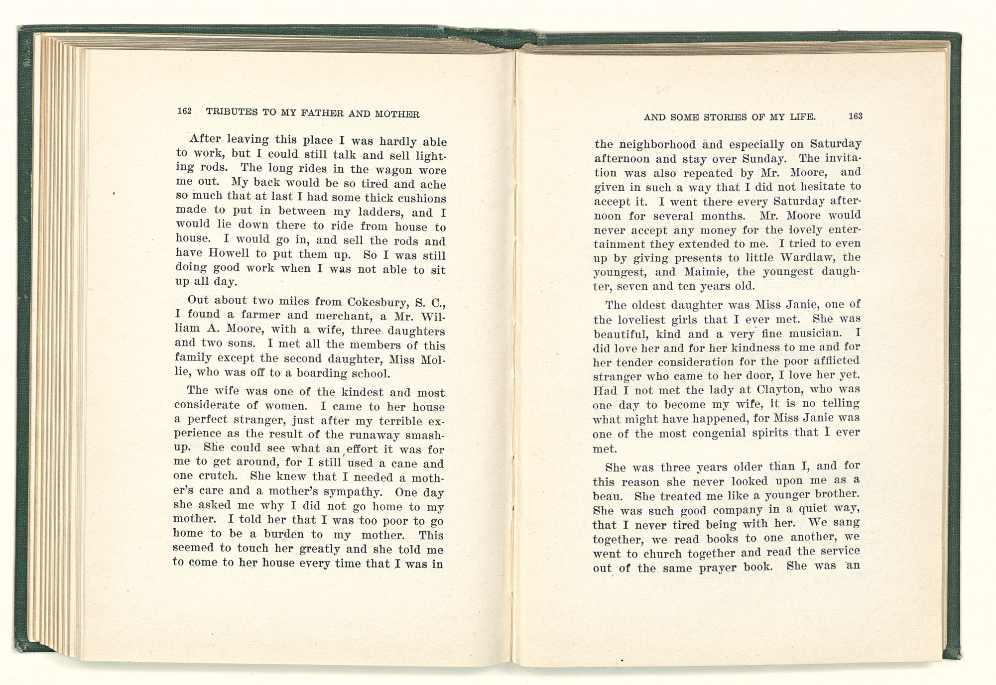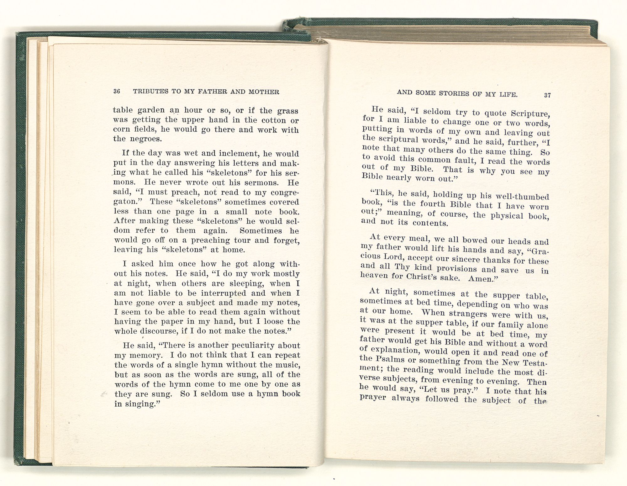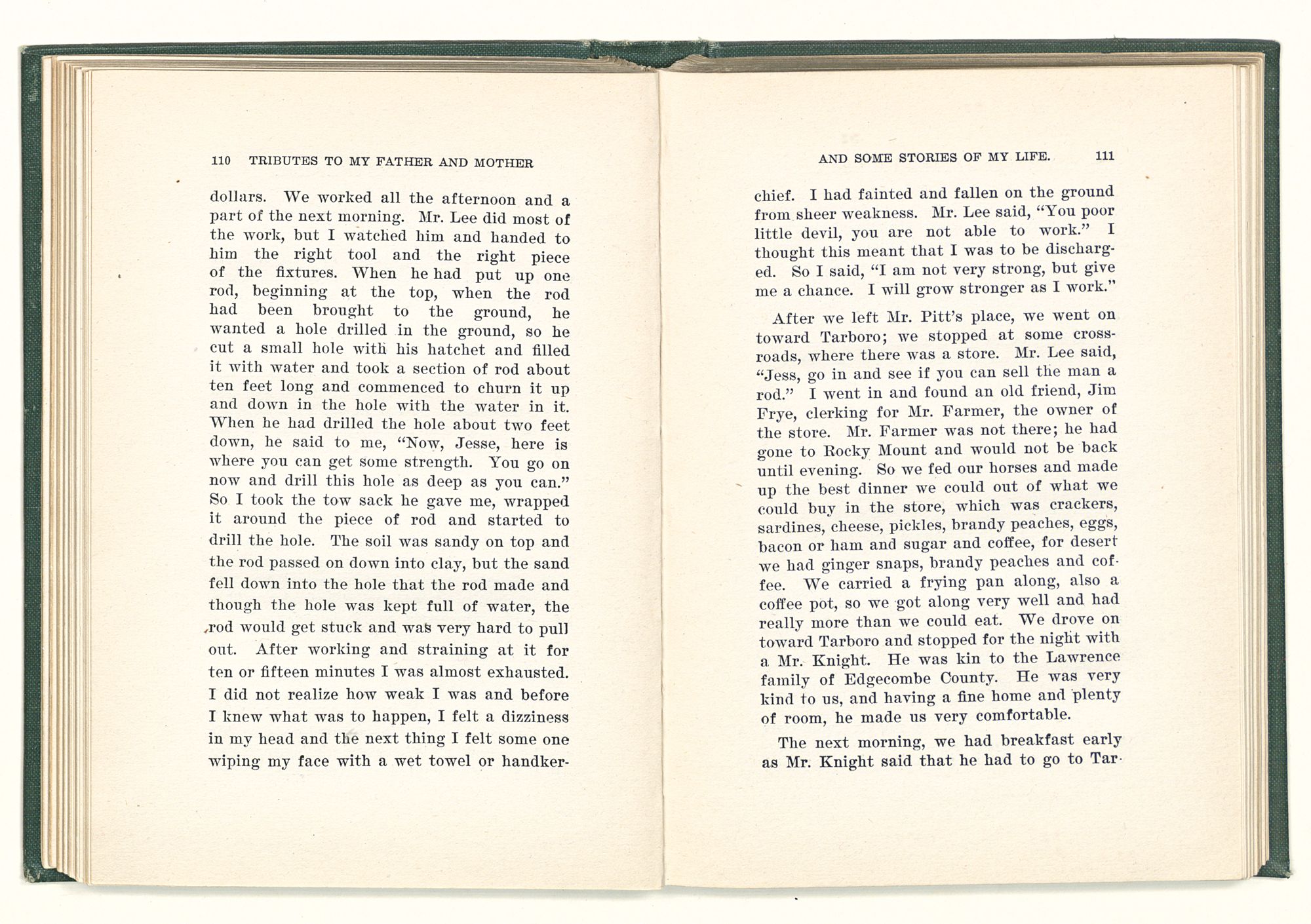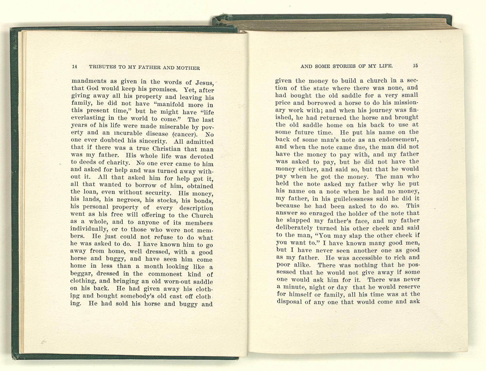 given the money to build a church in a section of the state where there was none, and had bought the old saddle for a very small price and borrowed a horse to do his missionary work with; and when his journey was finished, he had returned the horse and brought the old saddle home on his back to use at some future time. He put his name on the back of some man's note as an endorsement, and when the note came due, the man did not have the money to pay with, and my father was asked to pay, but he did not have the money either, and said so, but that he would pay when he got the money. The man who held the note asked my father why he put his name on a note when he had no money, my father, in his guilelessness said he did it because he had been asked to do so. This answer so enraged the holder of the note that he slapped my father's face, and my father deliberately turned his other cheek and said to the man, “You may slap the other cheek if you want to.” I have known many good men, but I have never seen another one as good as my father. He was accessible to rich and poor alike. There was nothing that he possessed that he would not give away if some one would ask him for it. There was never a minute, night or day that he would reserve for himself or family, all his time was at the disposal of any one that would come and ask