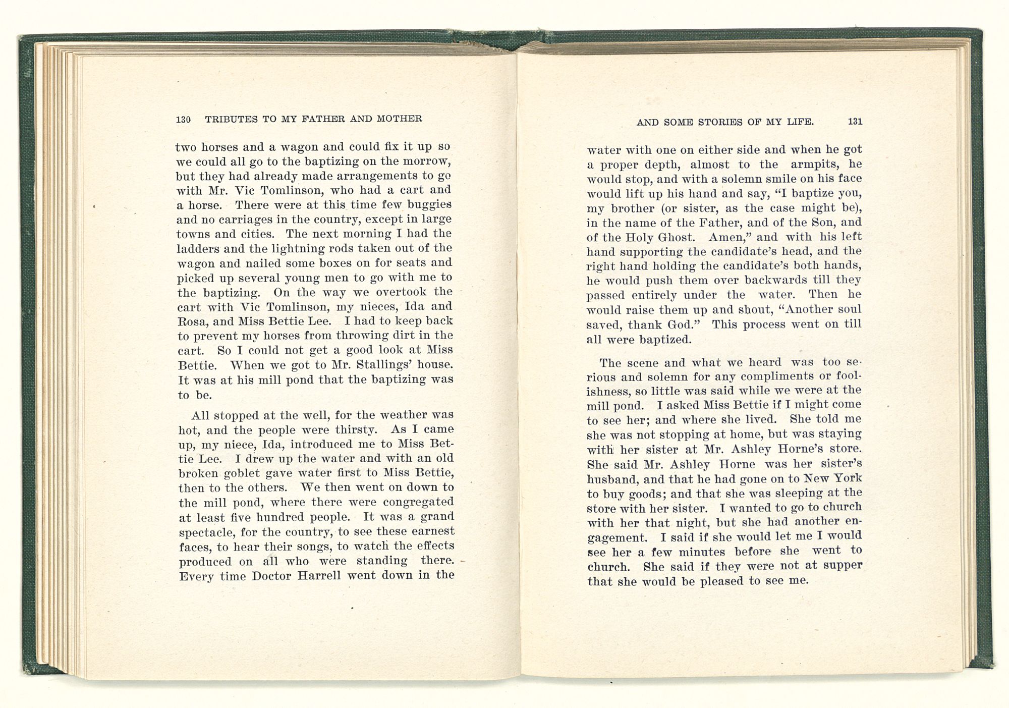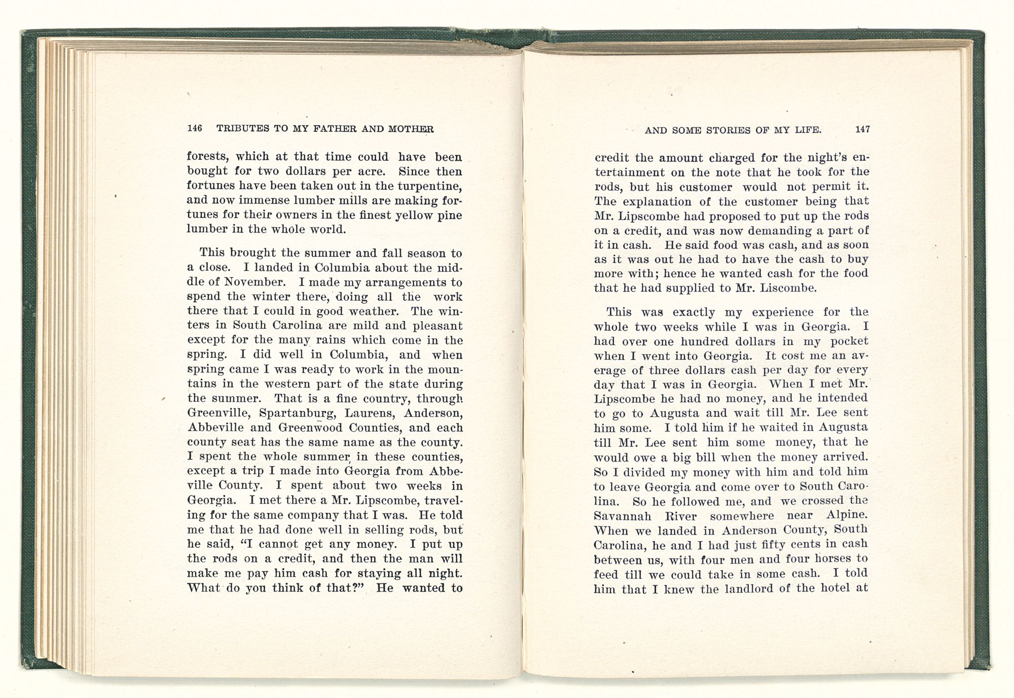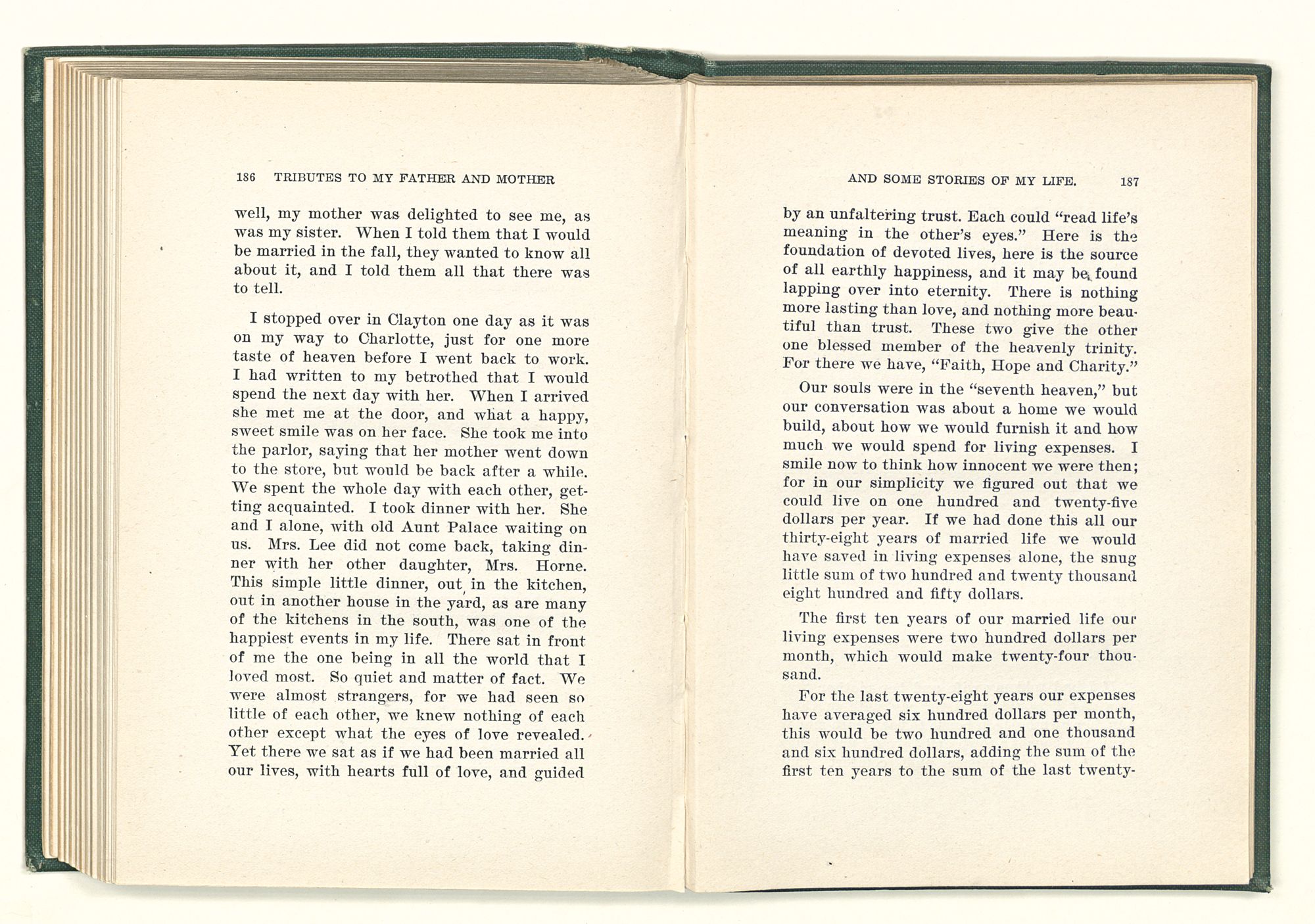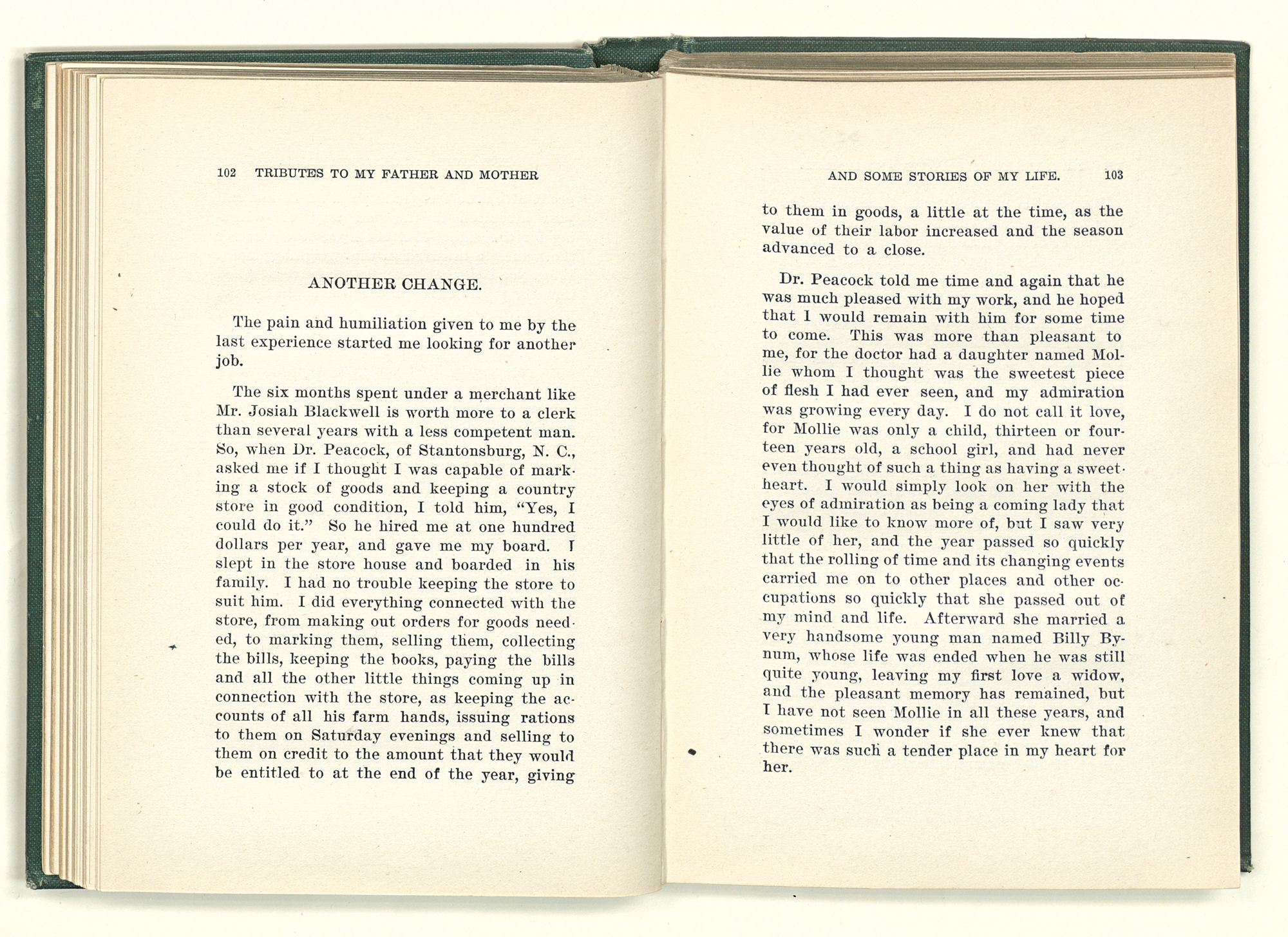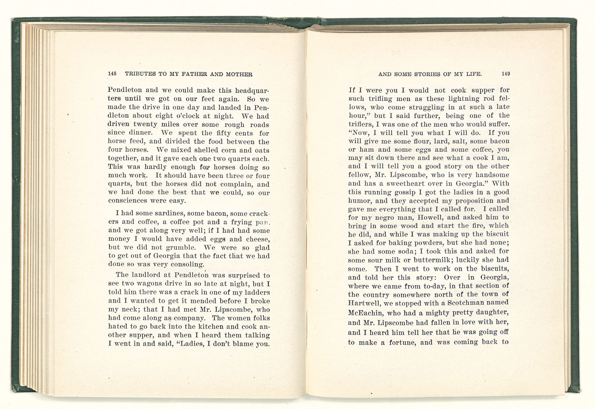 given the money to build a church in a section of the state where there was none, and had bought the old saddle for a very small price and borrowed a horse to do his missionary work with; and when his journey was finished, he had returned the horse and brought the old saddle home on his back to use at some future time. He put his name on the back of some man's note as an endorsement, and when the note came due, the man did not have the money to pay with, and my father was asked to pay, but he did not have the money either, and said so, but that he would pay when he got the money. The man who held the note asked my father why he put his name on a note when he had no money, my father, in his guilelessness said he did it because he had been asked to do so. This answer so enraged the holder of the note that he slapped my father's face, and my father deliberately turned his other cheek and said to the man, “You may slap the other cheek if you want to.” I have known many good men, but I have never seen another one as good as my father. He was accessible to rich and poor alike. There was nothing that he possessed that he would not give away if some one would ask him for it. There was never a minute, night or day that he would reserve for himself or family, all his time was at the disposal of any one that would come and ask